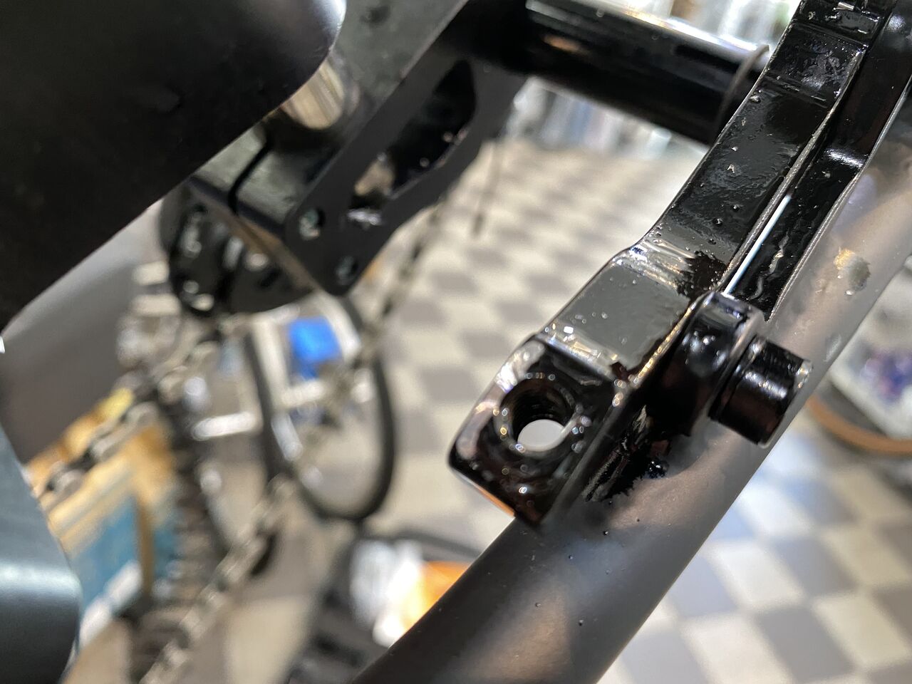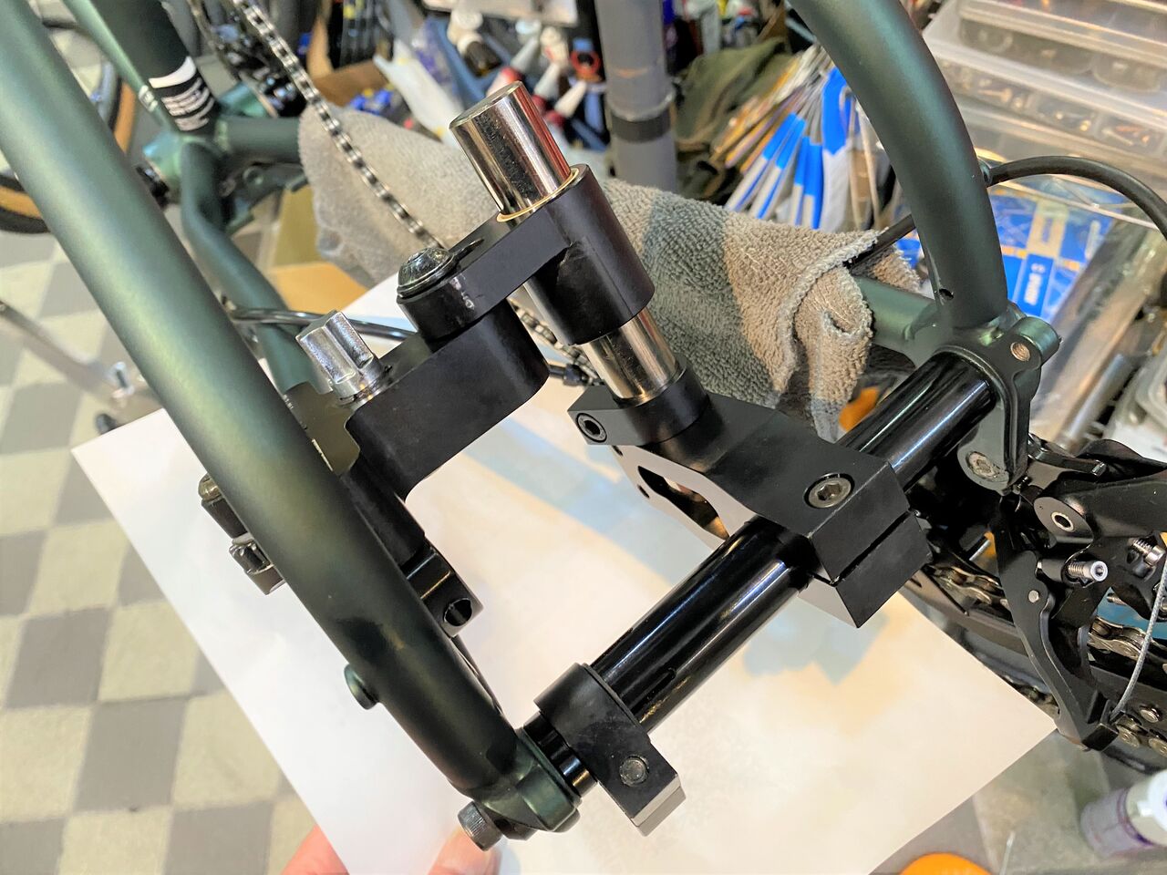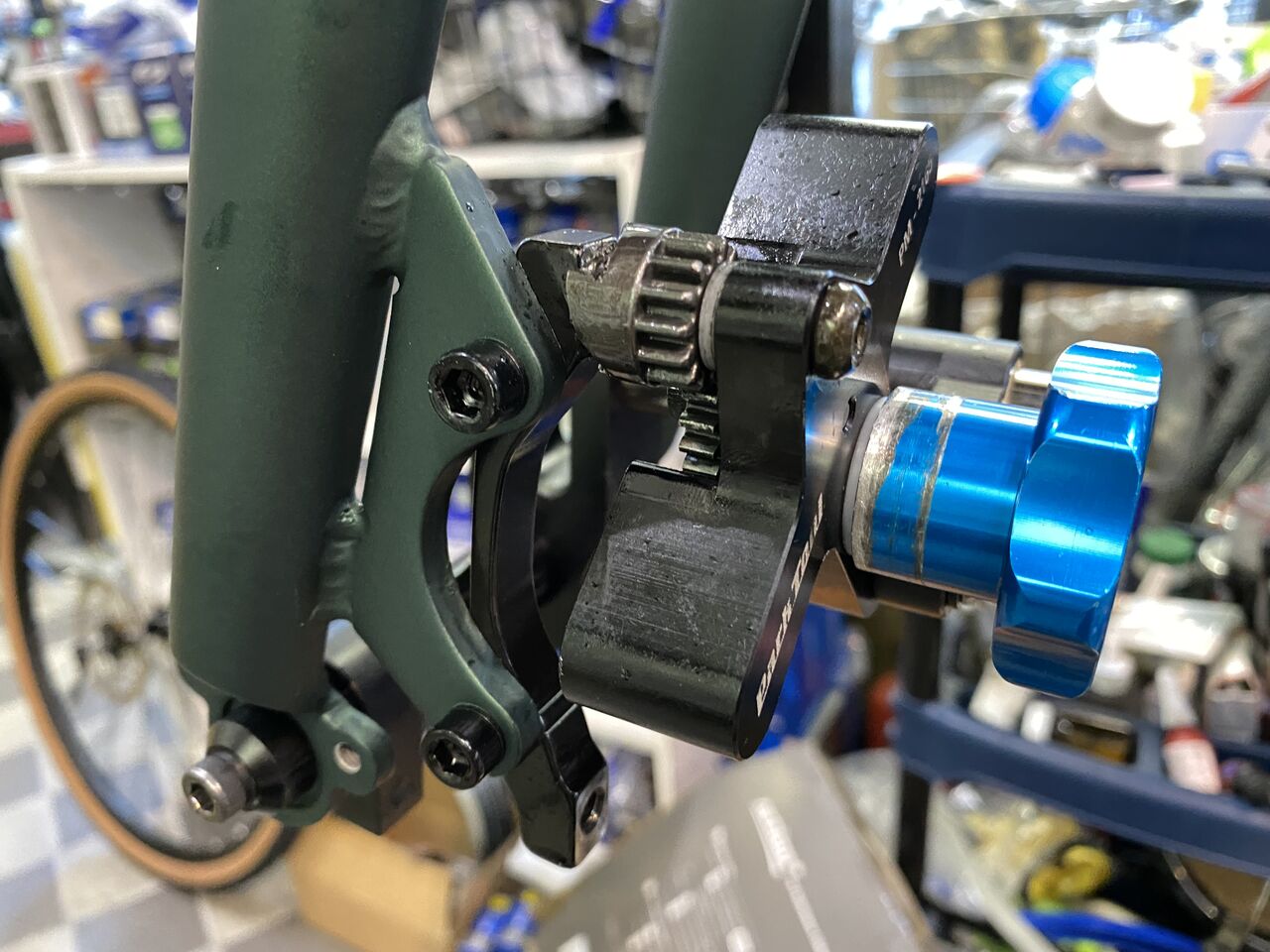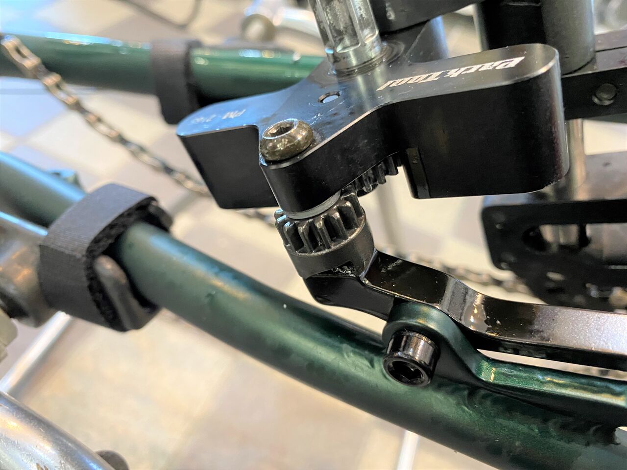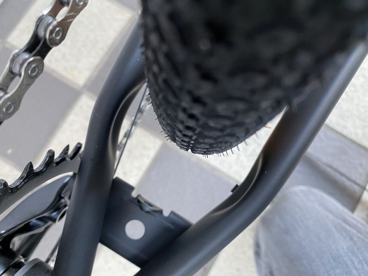 非常に狭い DAHON K3 のリヤに装着してみましょう。ブルーの仏式が飛び出した状態で挿入し、