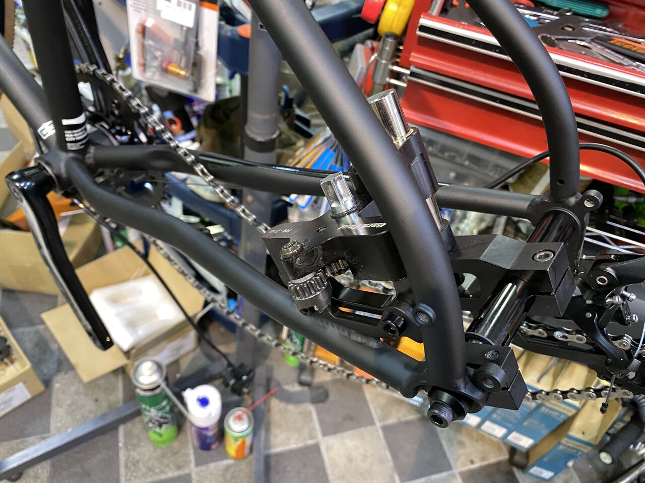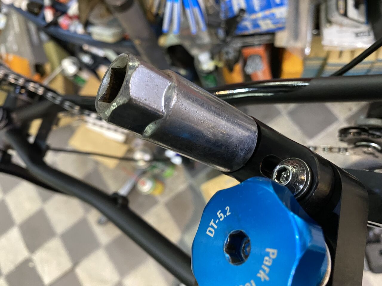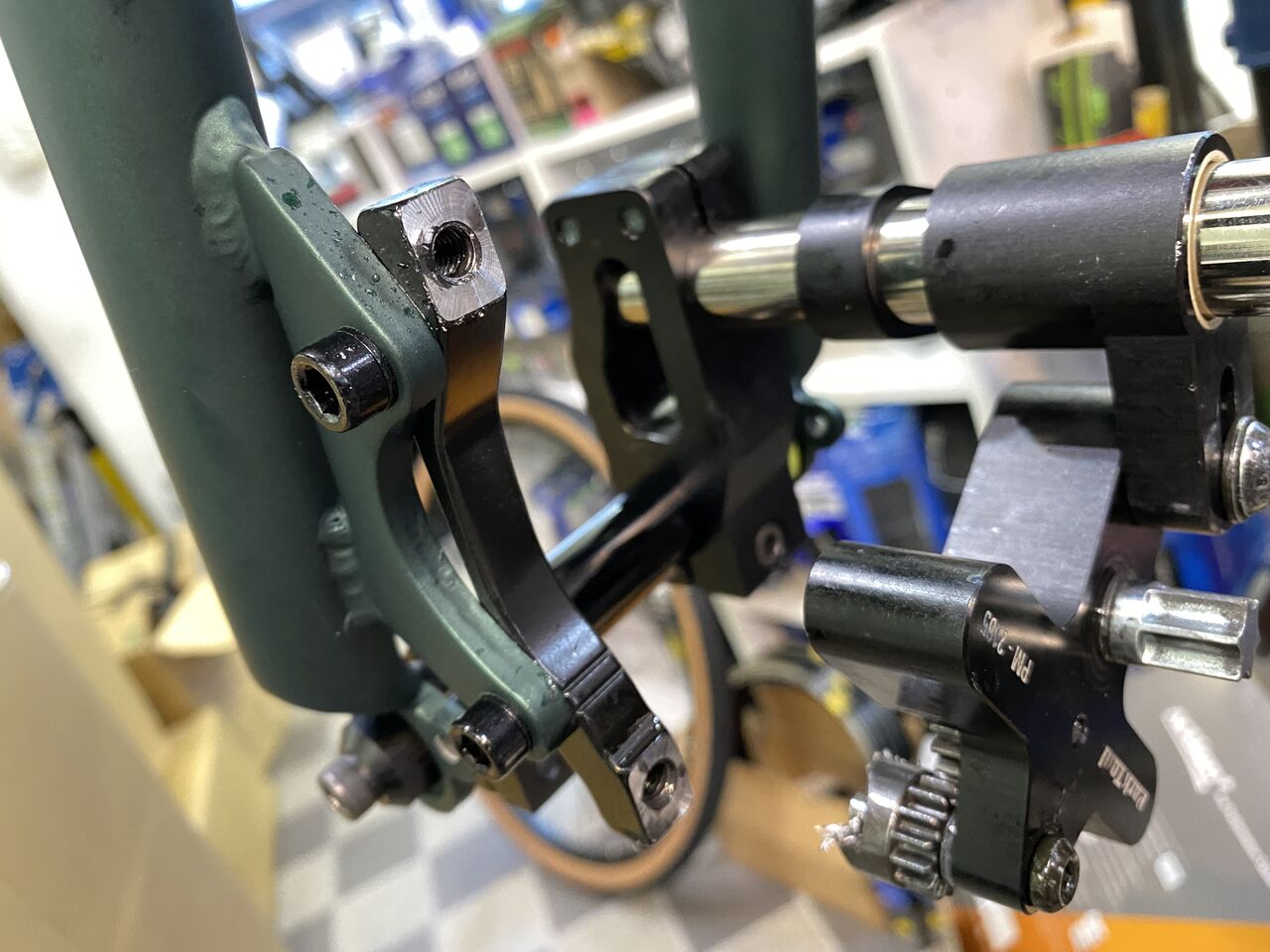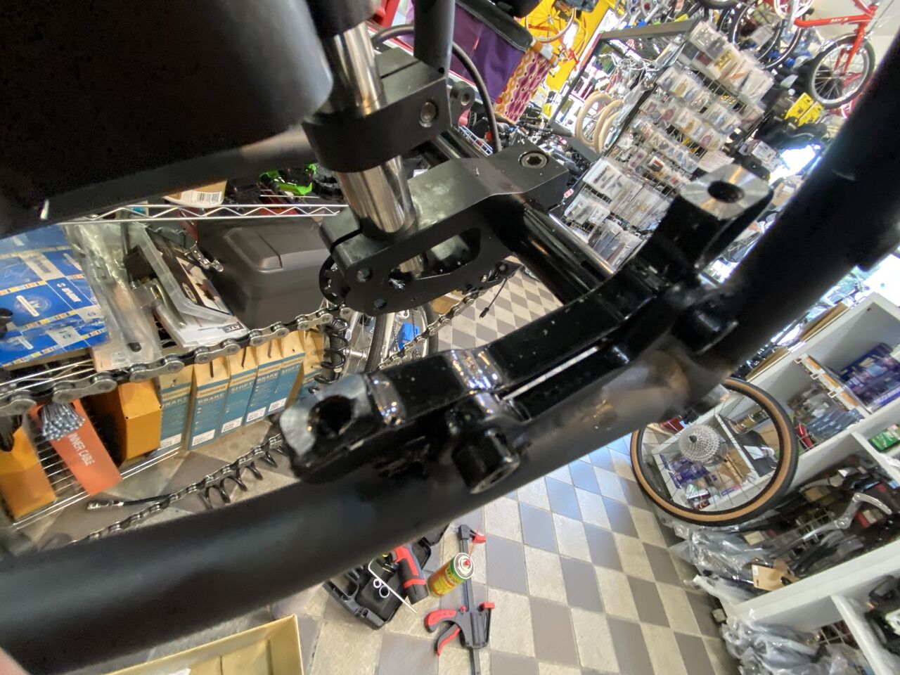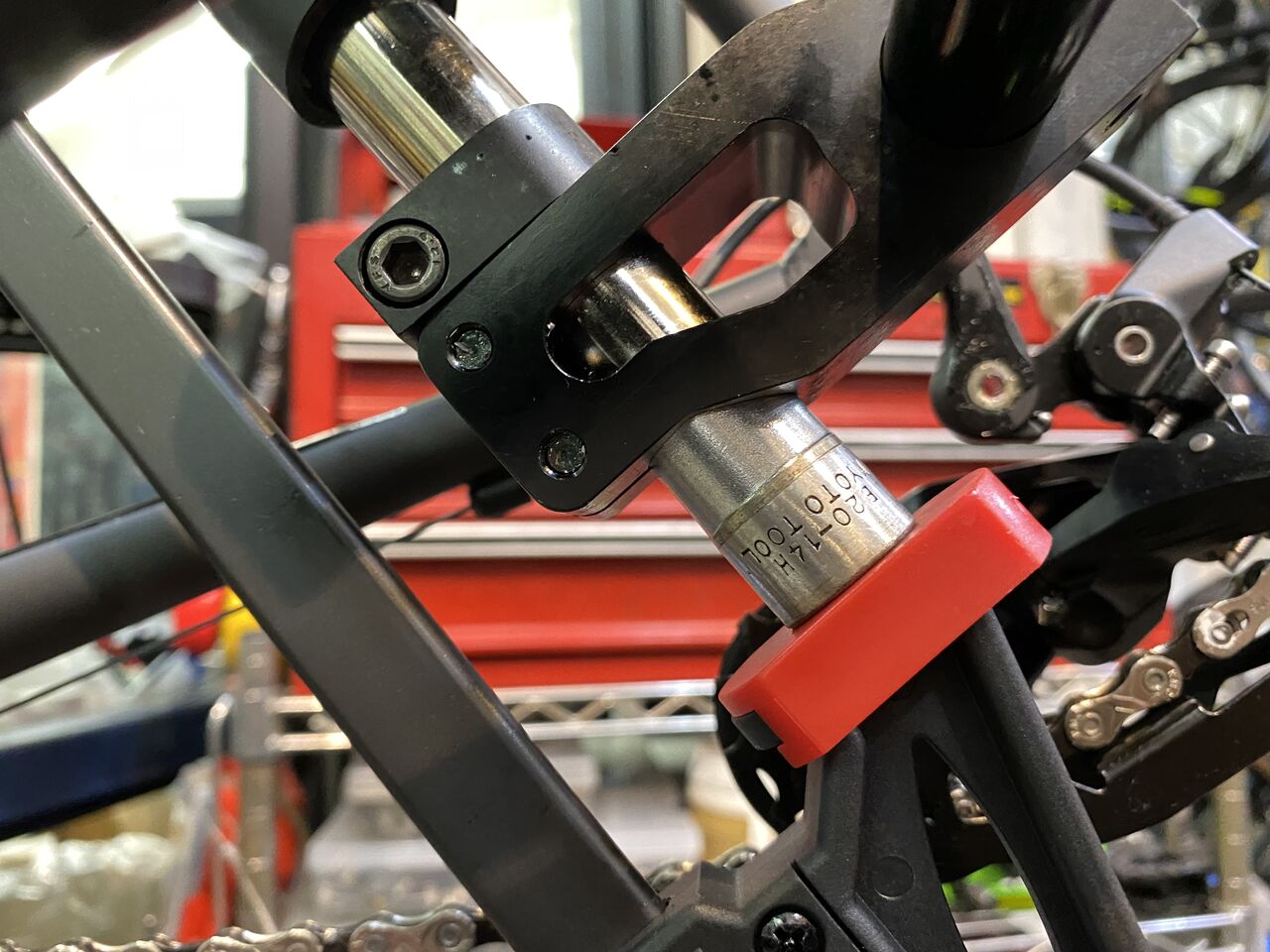 非常に狭い DAHON K3 のリヤに装着してみましょう。ブルーの仏式が飛び出した状態で挿入し、
