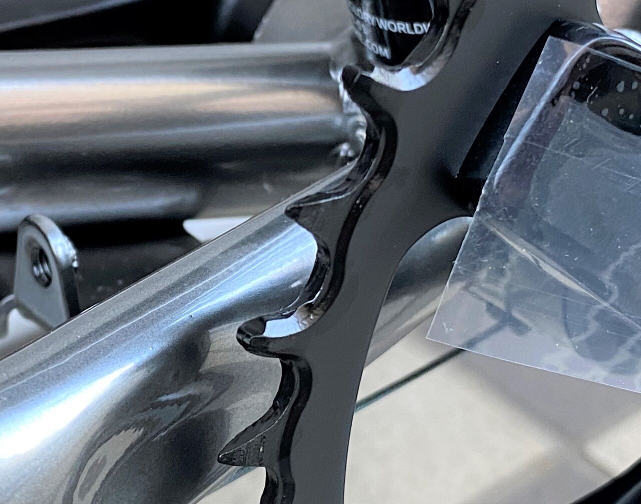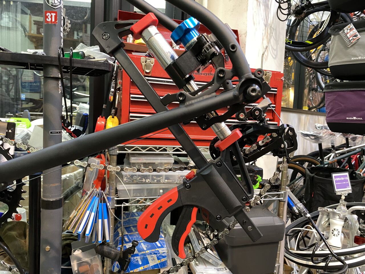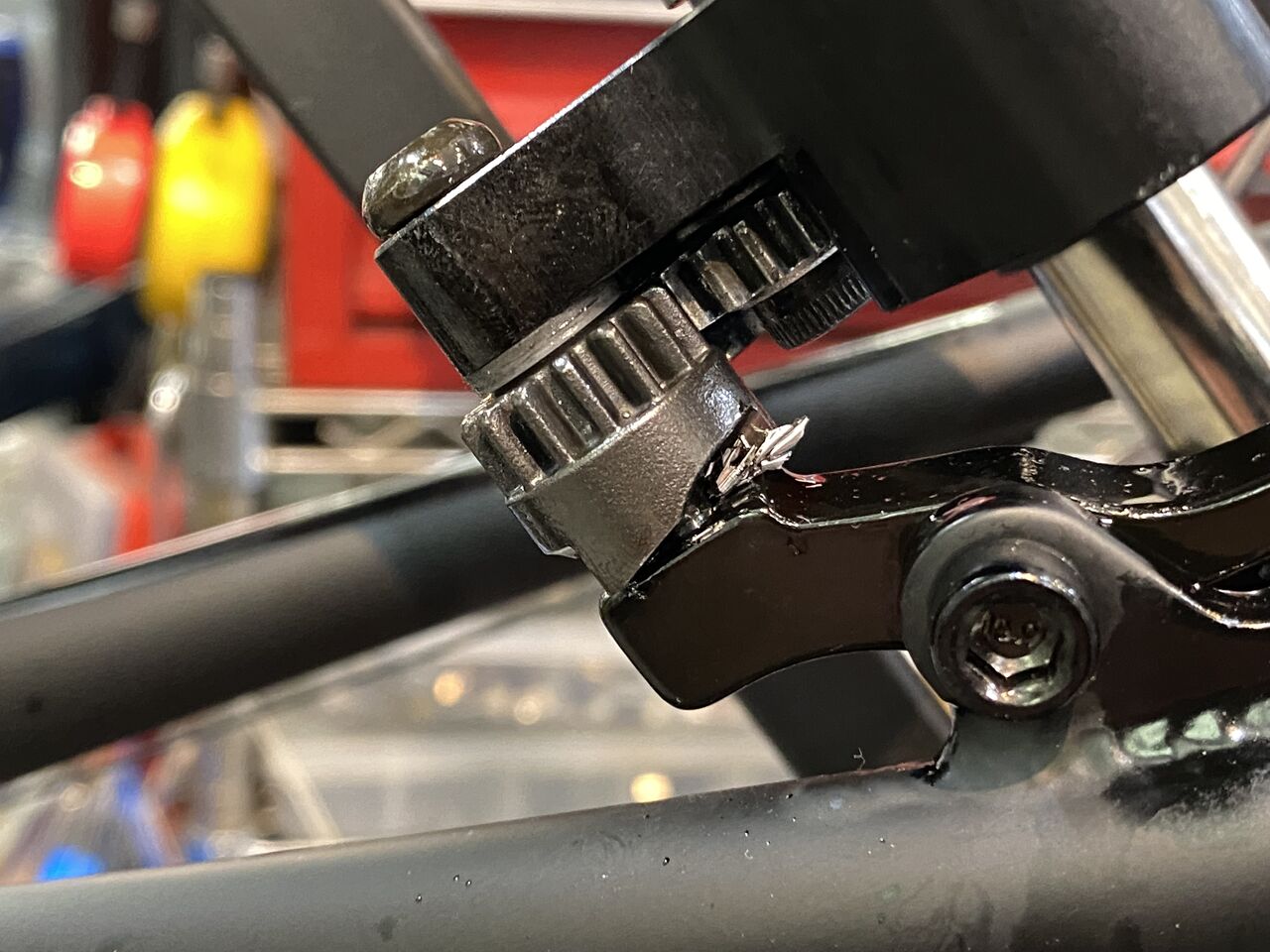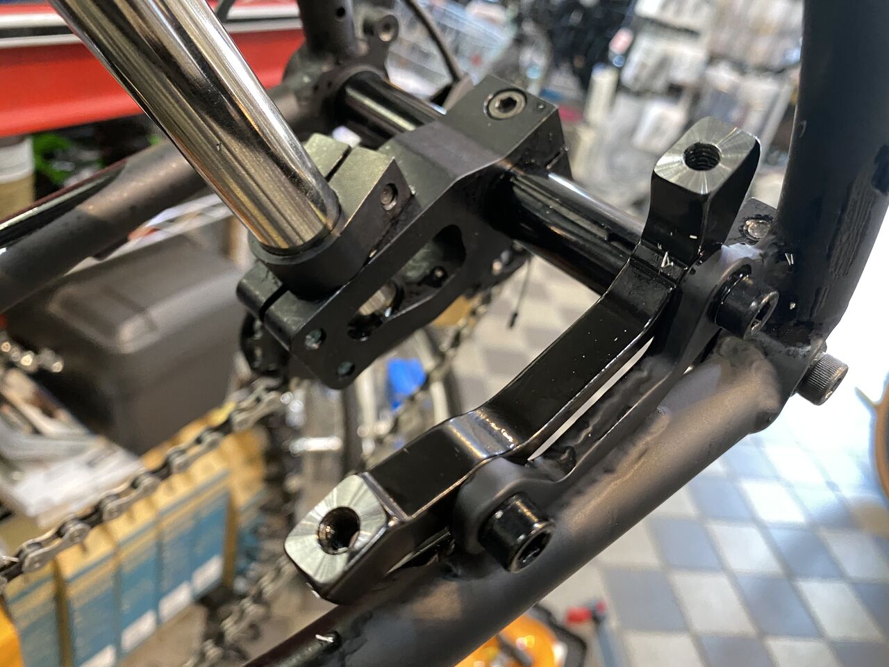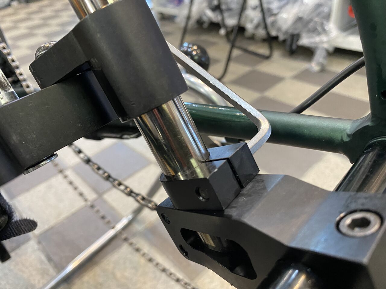 非常に狭い DAHON K3 のリヤに装着してみましょう。ブルーの仏式が飛び出した状態で挿入し、