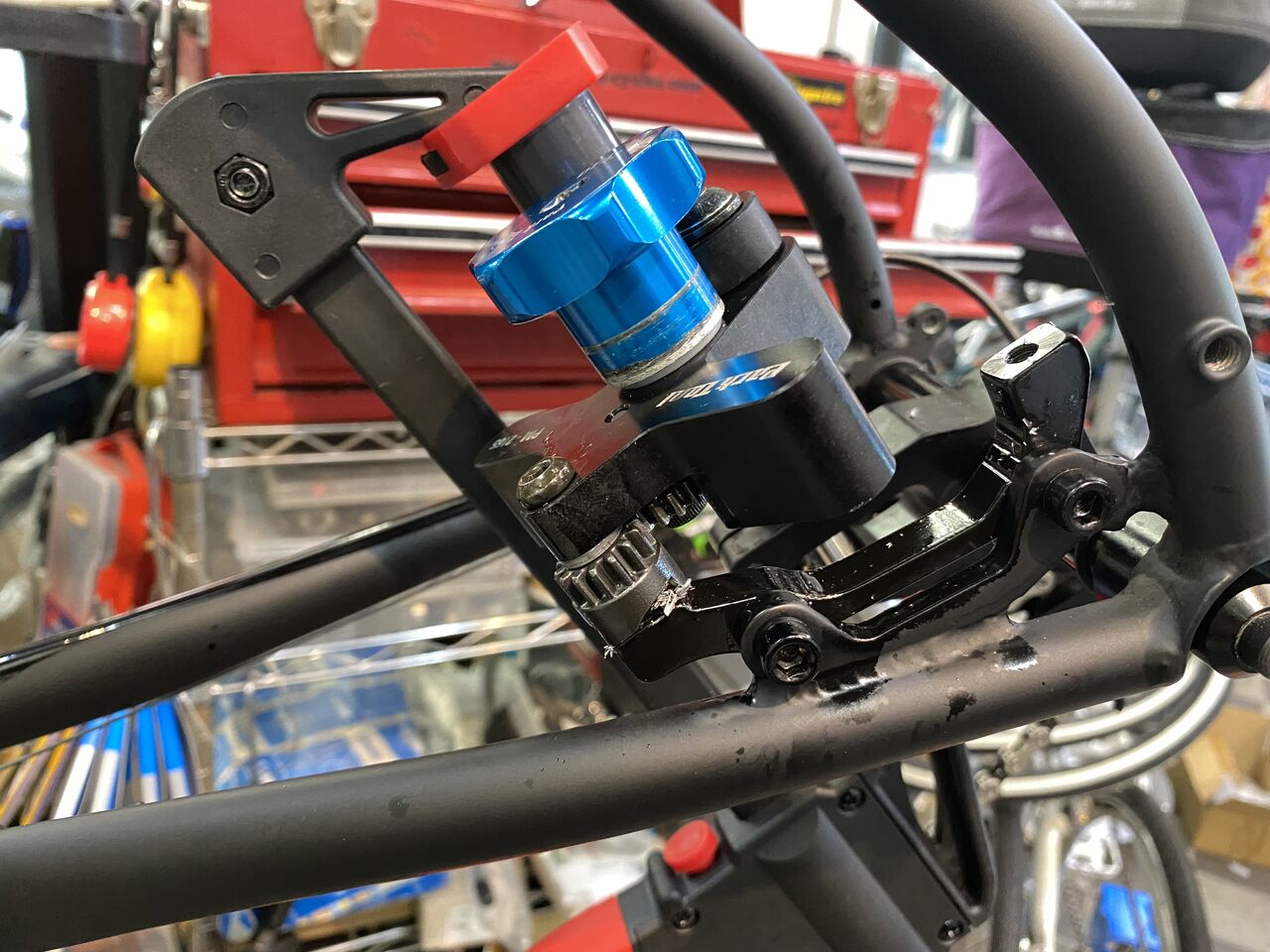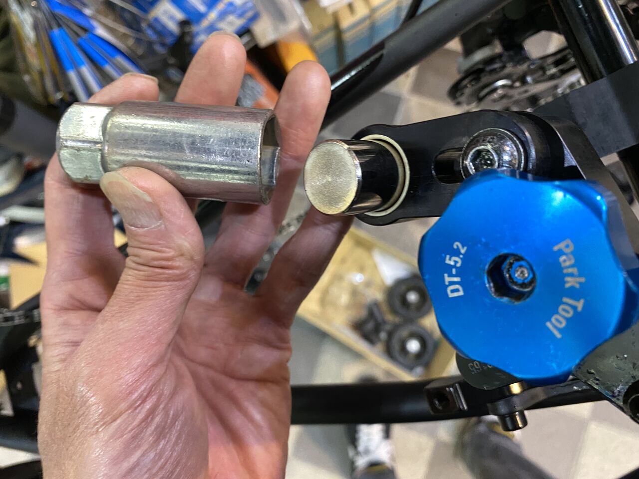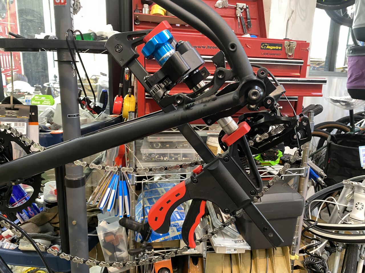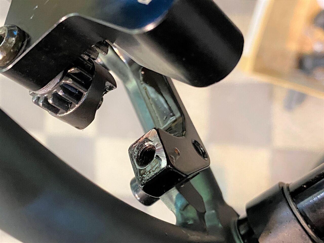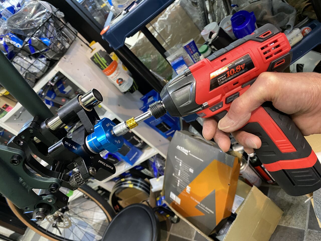 非常に狭い DAHON K3 のリヤに装着してみましょう。ブルーの仏式が飛び出した状態で挿入し、