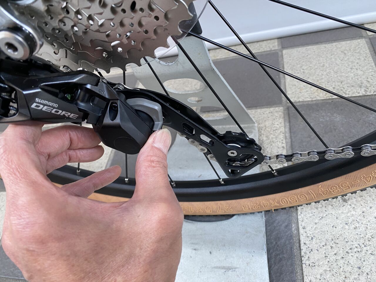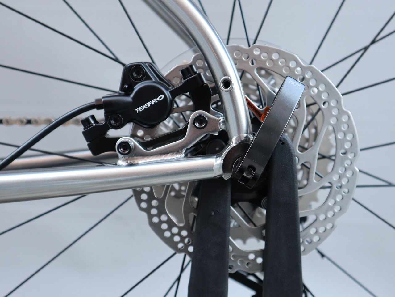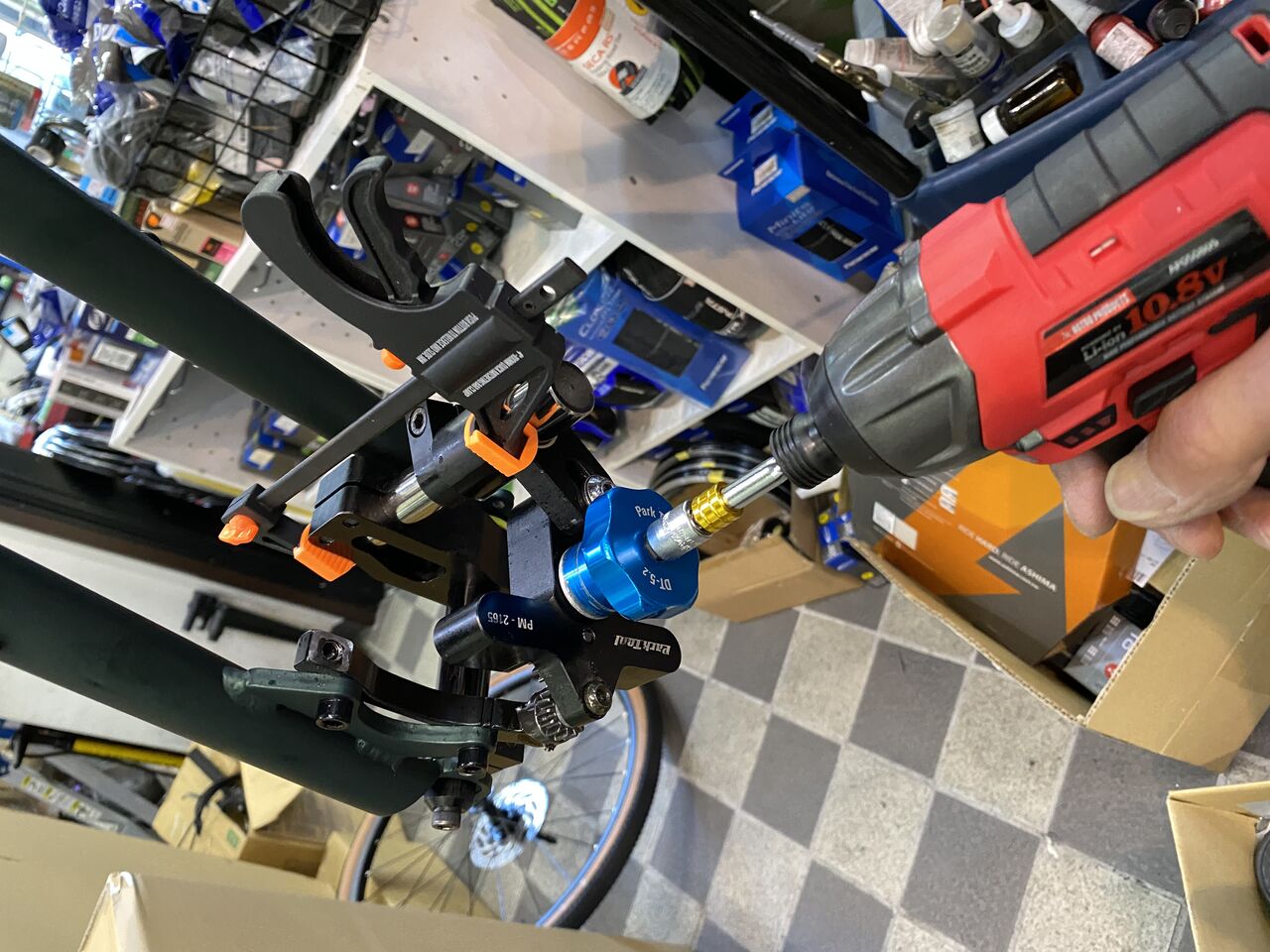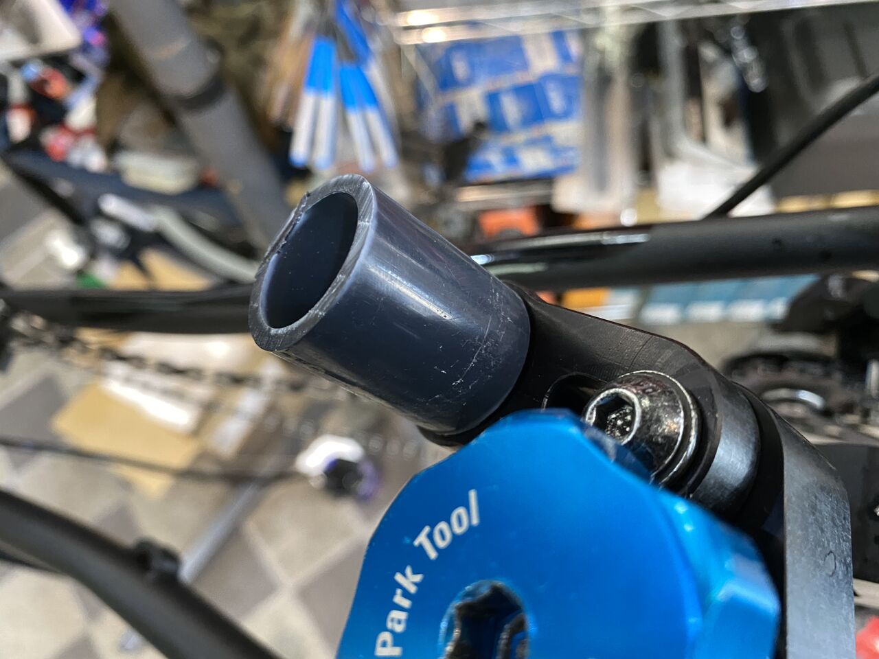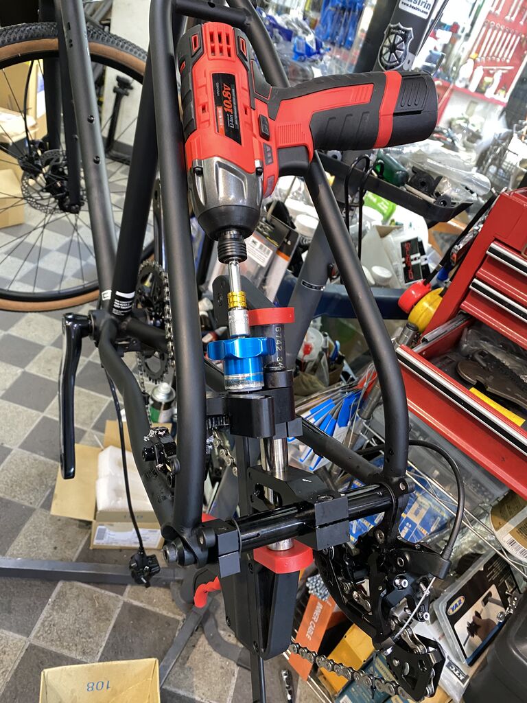 非常に狭い DAHON K3 のリヤに装着してみましょう。ブルーの仏式が飛び出した状態で挿入し、