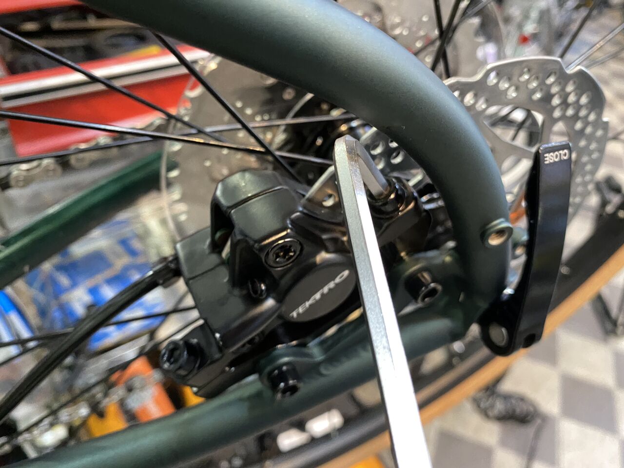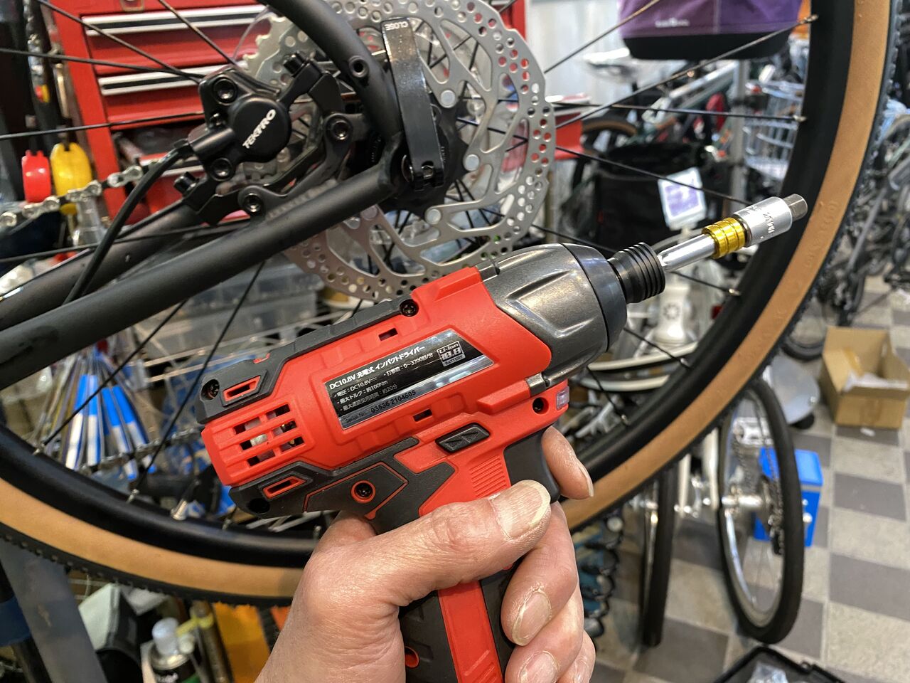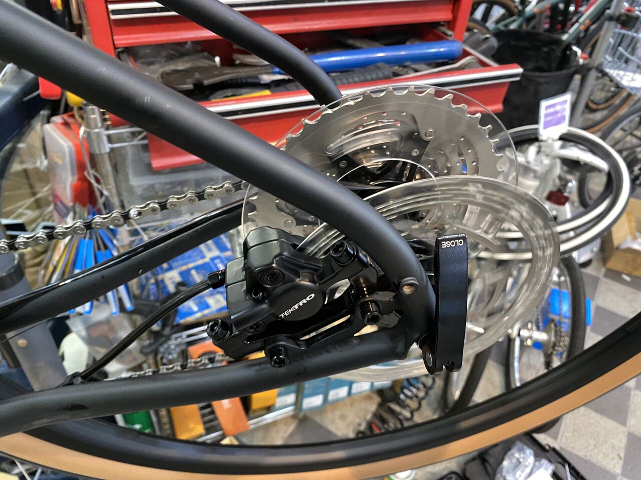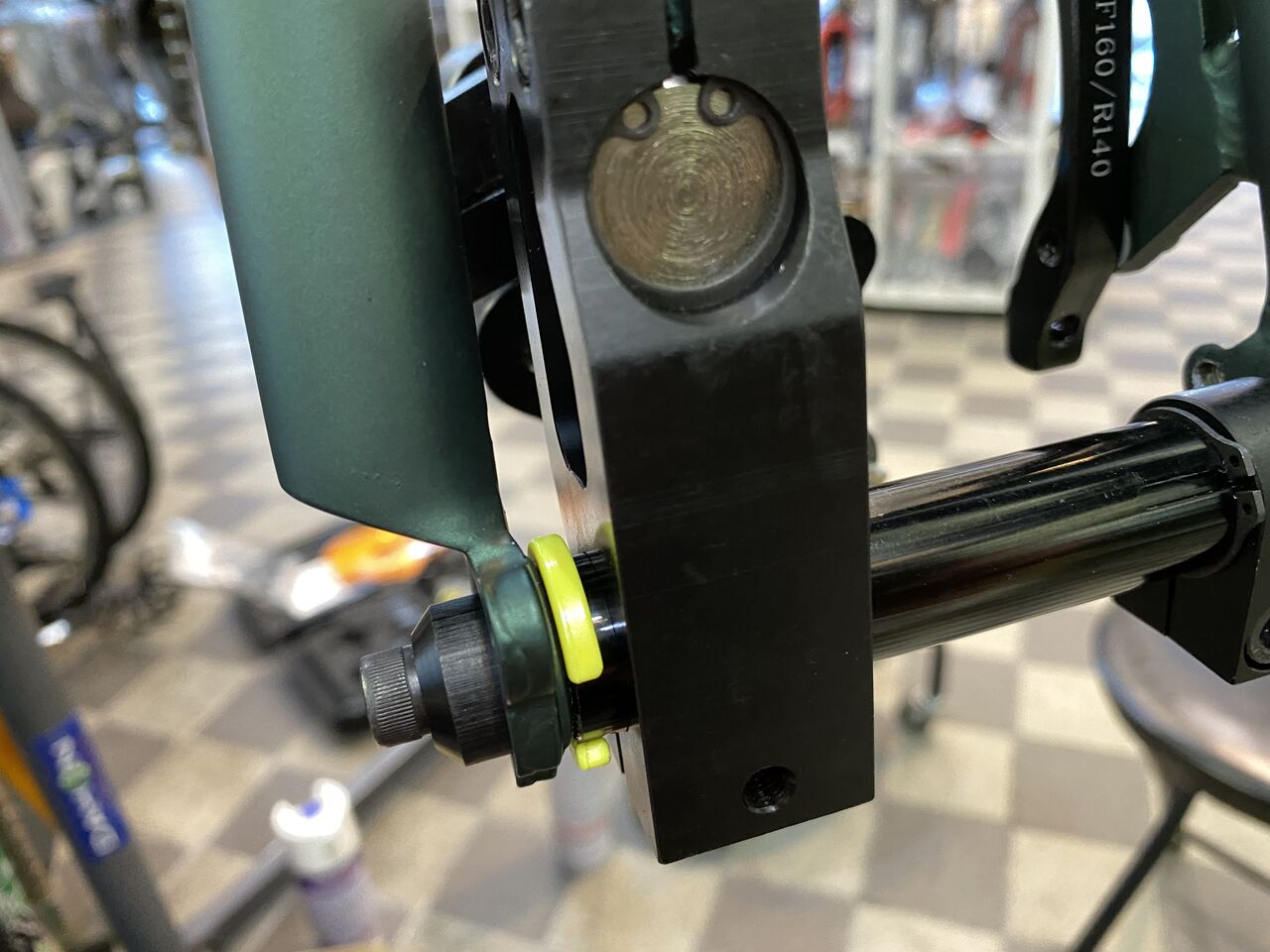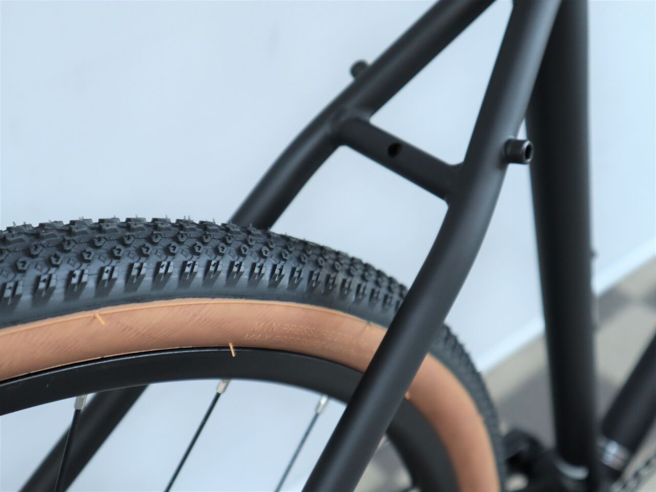 非常に狭い DAHON K3 のリヤに装着してみましょう。ブルーの仏式が飛び出した状態で挿入し、