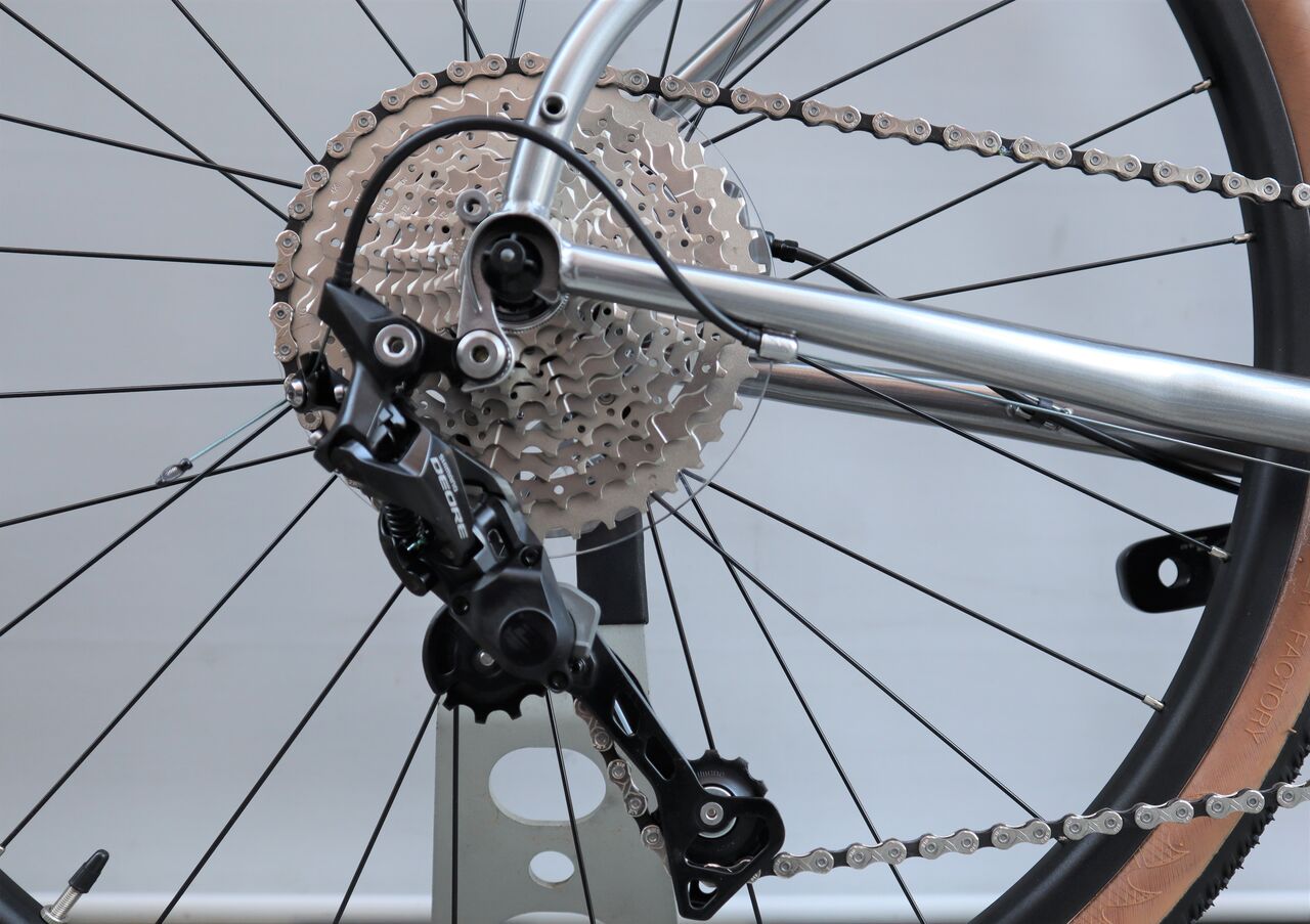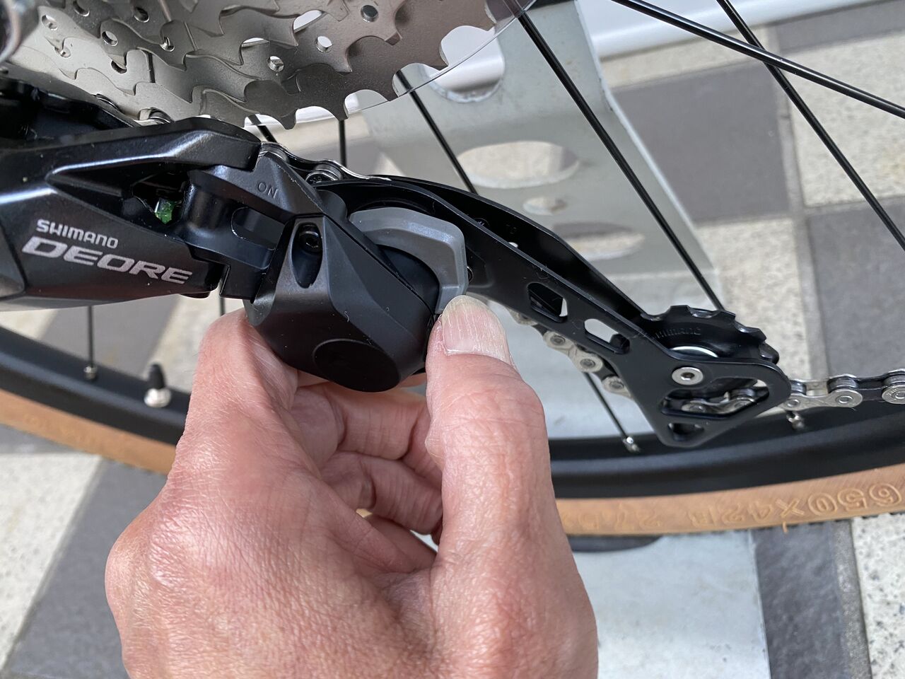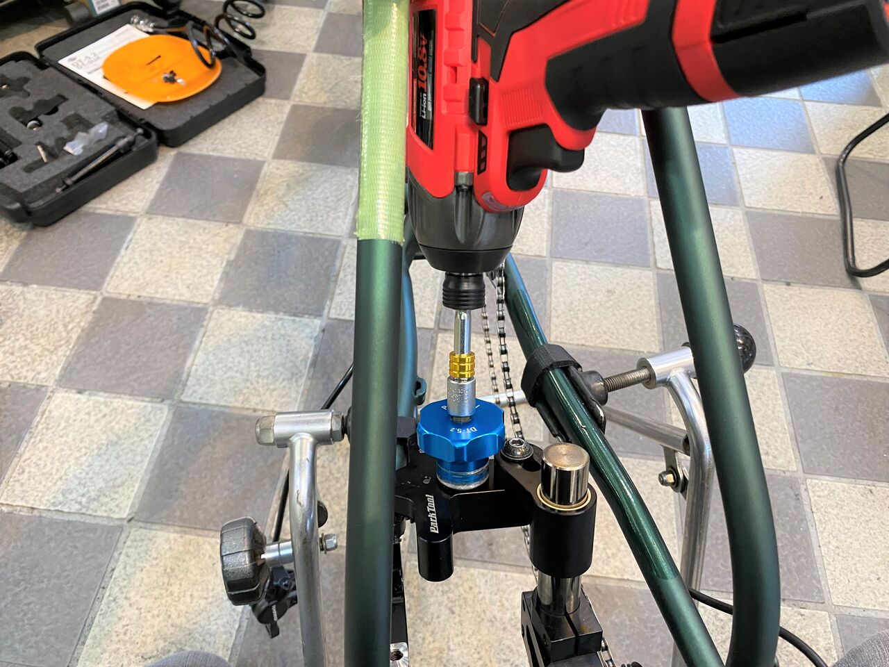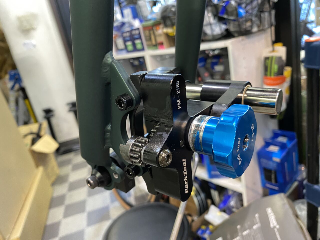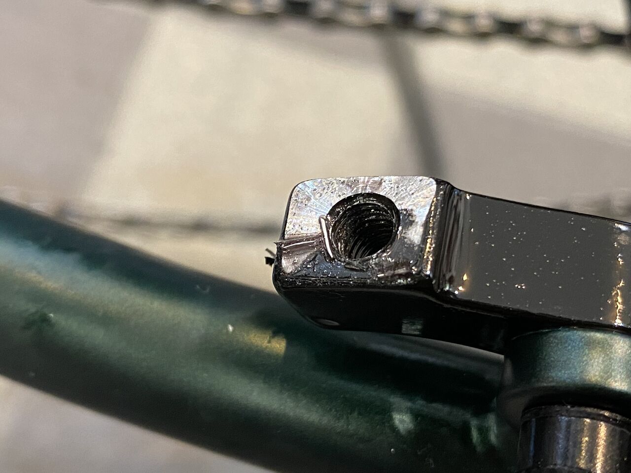 非常に狭い DAHON K3 のリヤに装着してみましょう。ブルーの仏式が飛び出した状態で挿入し、