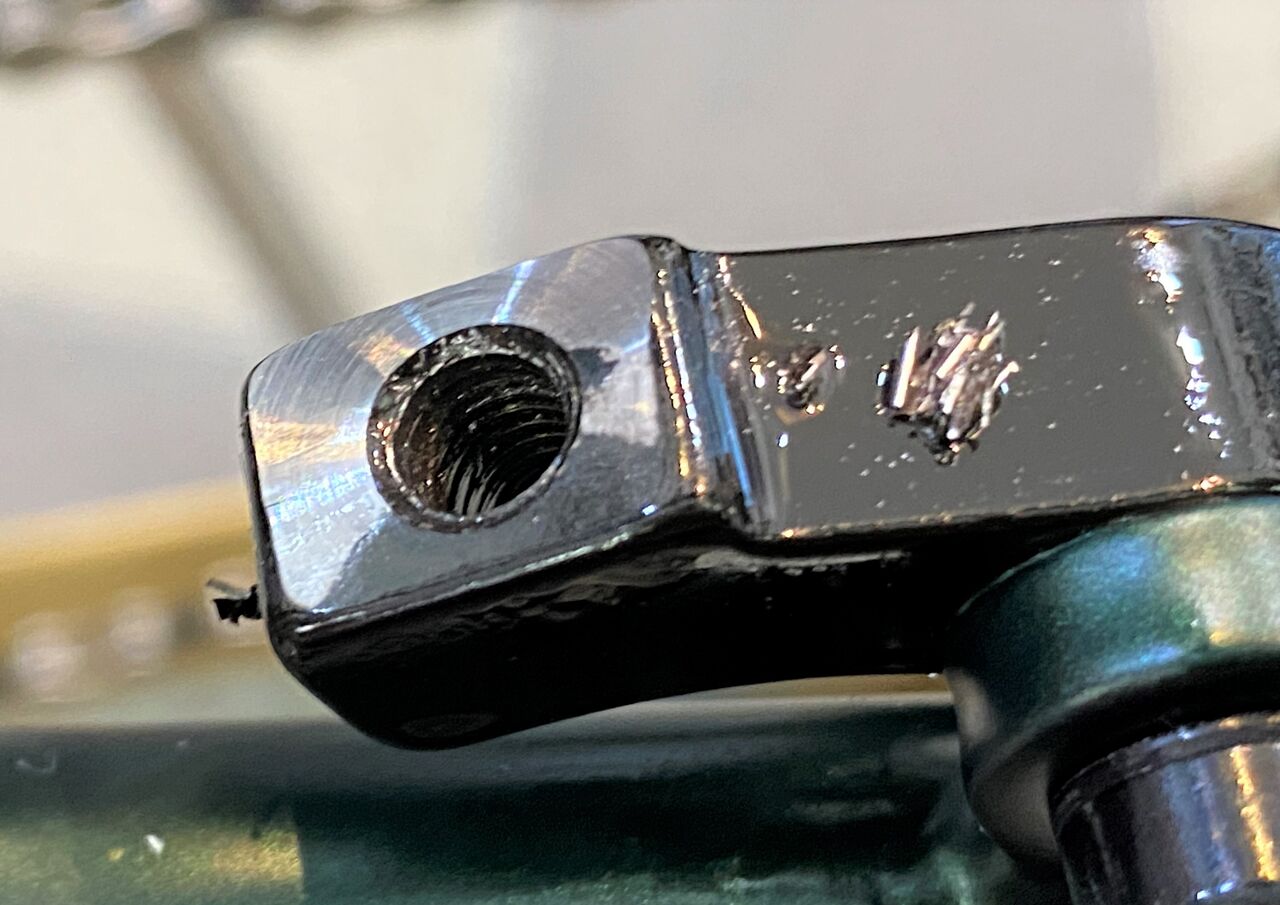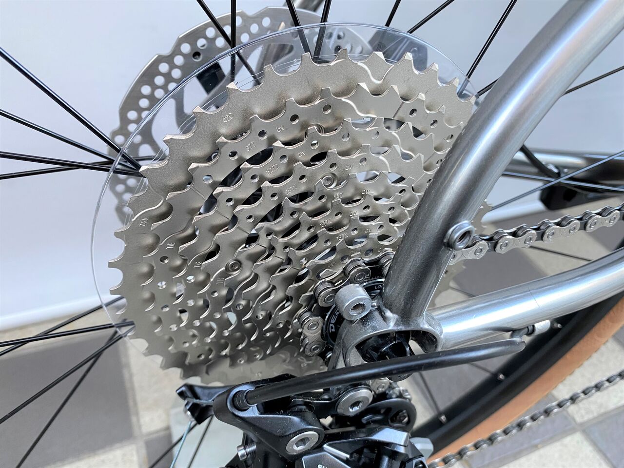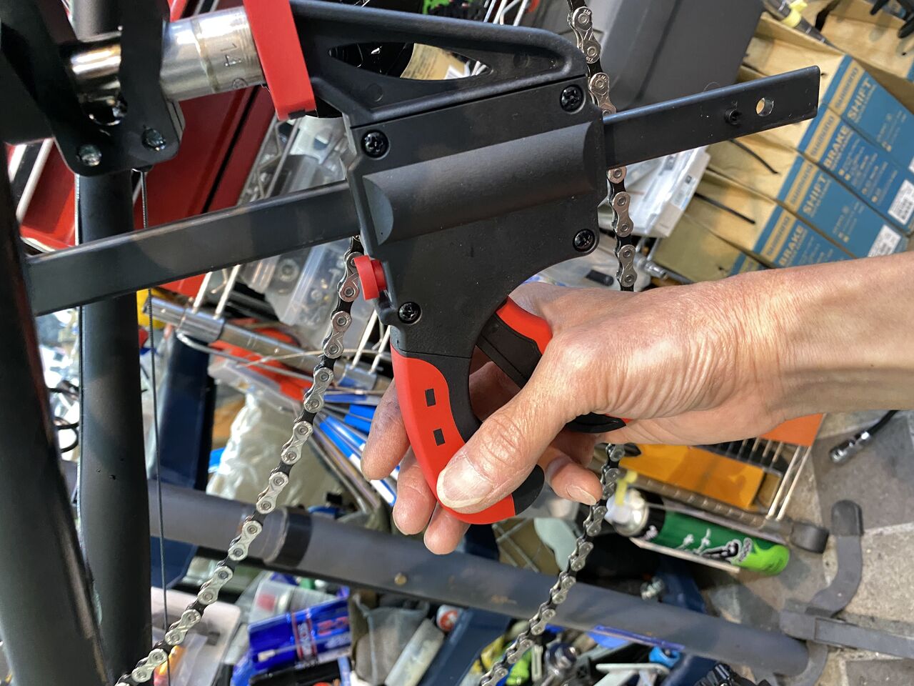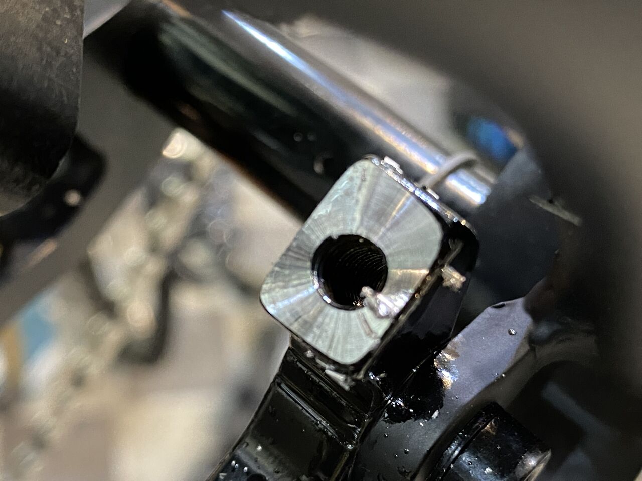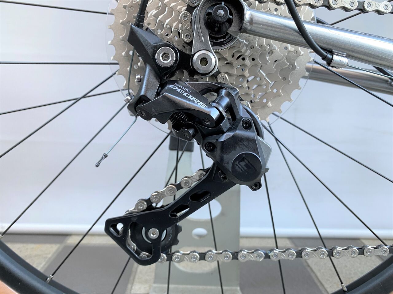 非常に狭い DAHON K3 のリヤに装着してみましょう。ブルーの仏式が飛び出した状態で挿入し、
