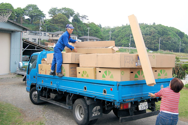 この箱達がたまってくると橋輪サティアンもイッパイになってしまいます。そんな訳で本日は箱の片付け日。キレイに並べないとトラックにも積みきれません↓