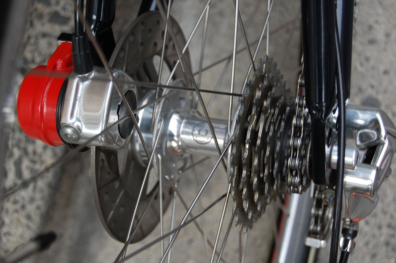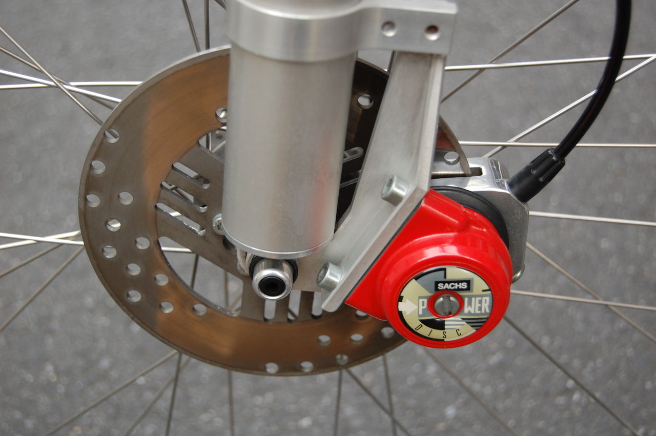 1980年代のDUCATIなどに使われた、分厚い(現行SHIMANOの倍ぐらいの厚さ)鋳鉄ローターで、キャリパーは片押し式のアルミの塊だ。