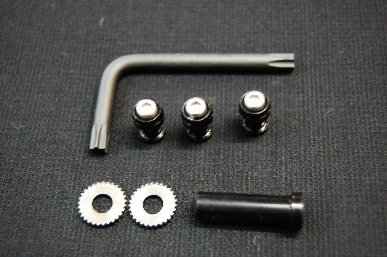 付属のトルクスレンチで締めるキャリパー取付用アルミナットは、18mmと25mmの2種類付いてくるのでエアロフォークにも対応。