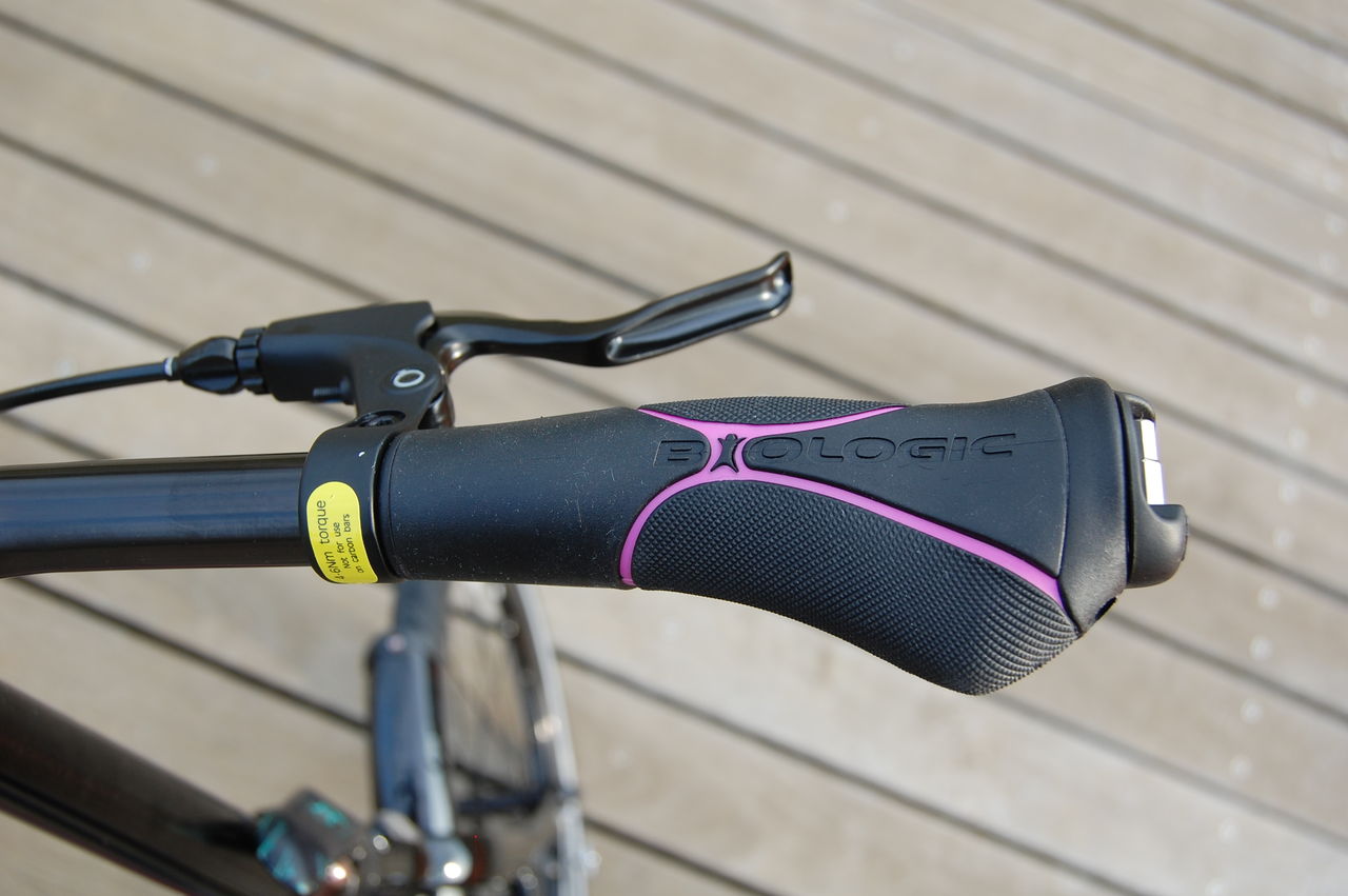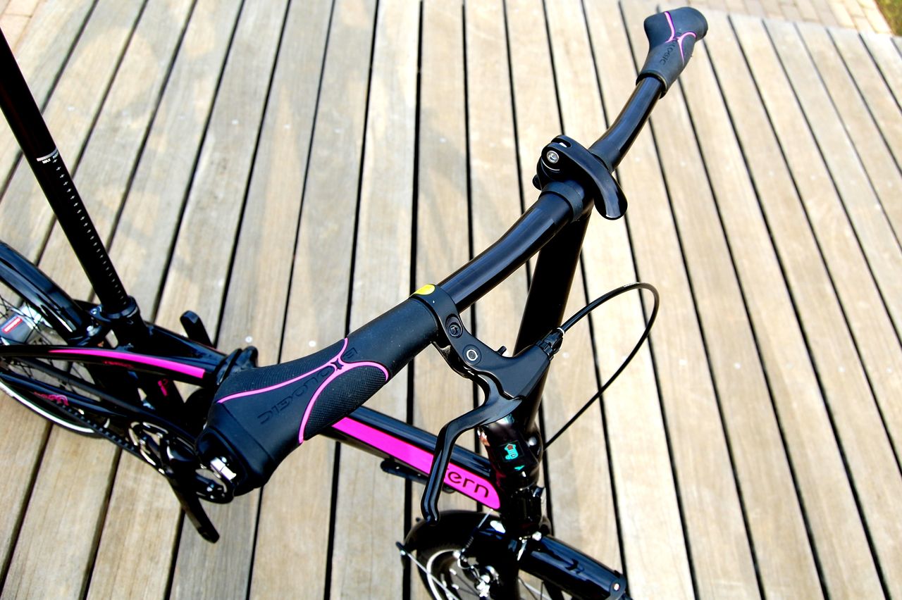 グリップとサドルにはフレームと同じピンクのストライプ