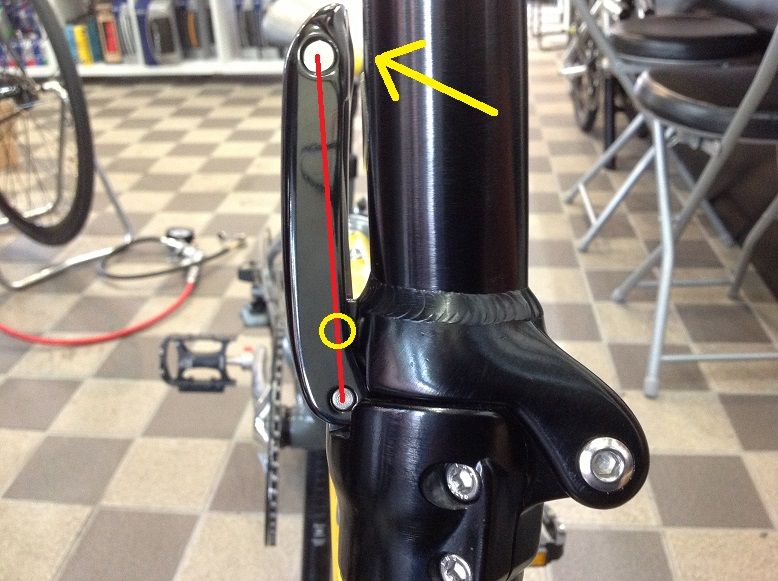ここまで来ると三角形が一直線に重なってしまいました。ここが一番トルクが高い(圧着力が強い)位置になり、先ほどから言う「どっち付かず」の状態です。黄色矢印を見るとレバーとポストにまだ倒せる隙間が見えますが、Hさんのポストはこの時点で止まって