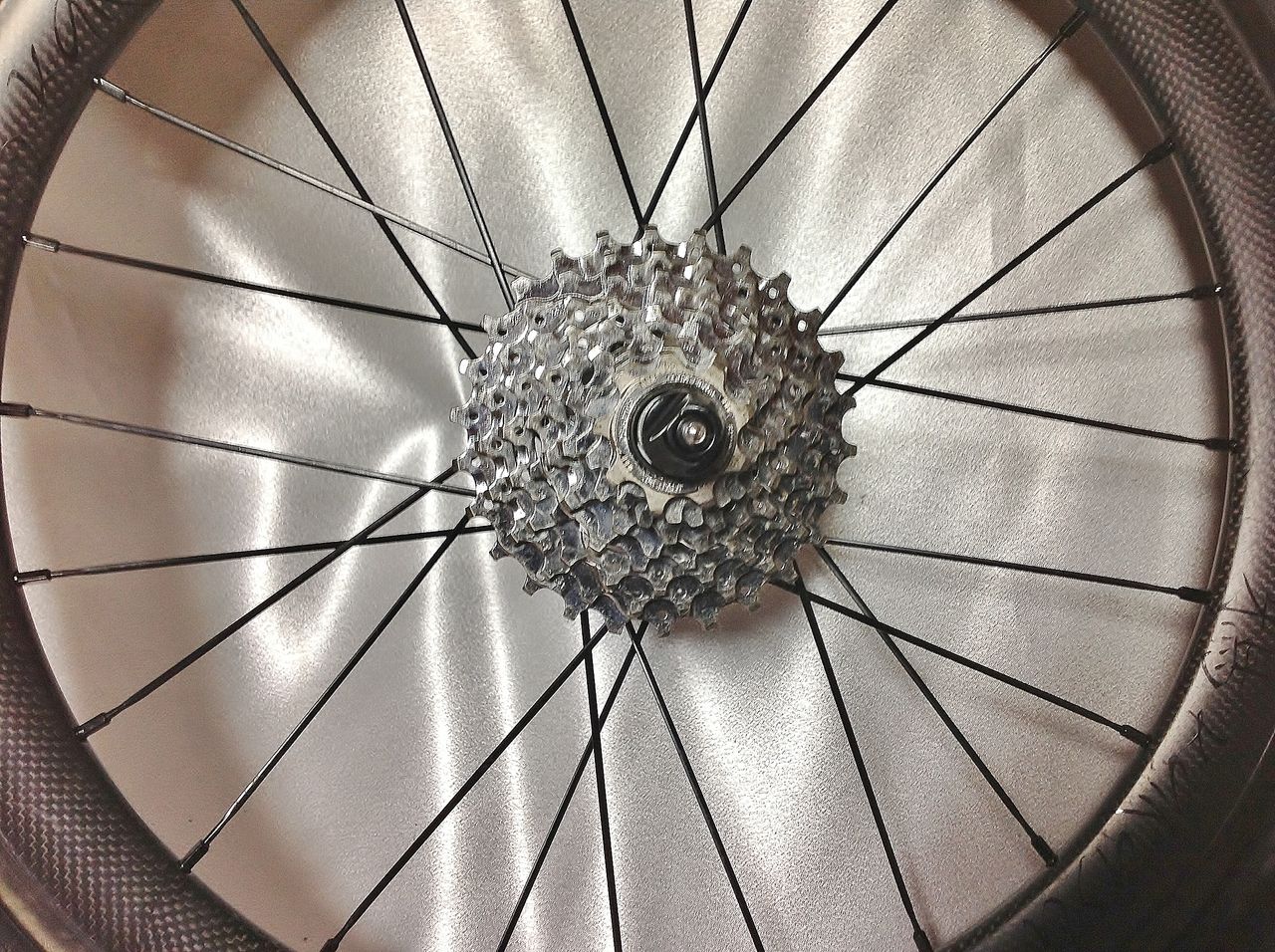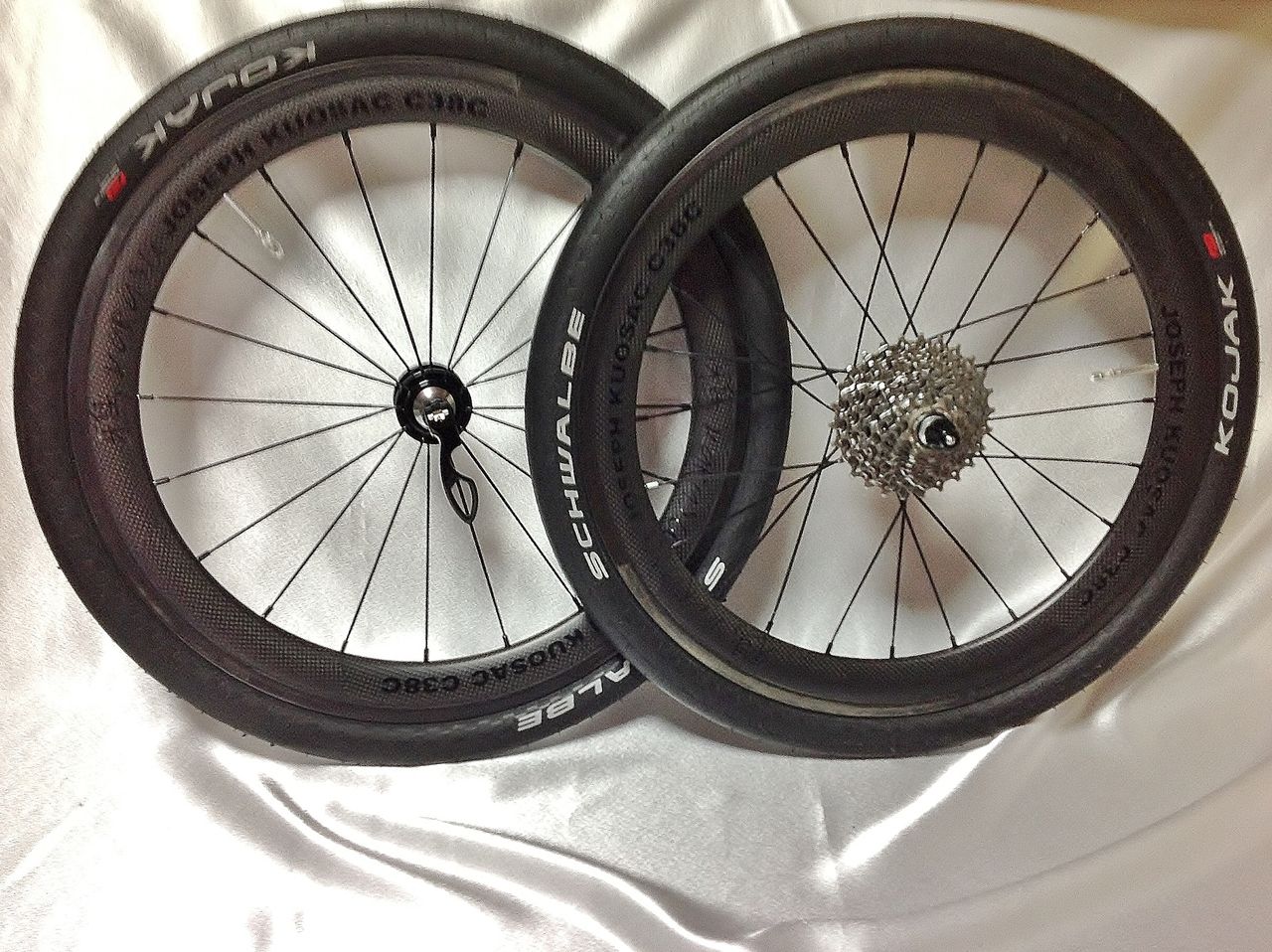 「赤 / メッキモリ」に付いていたカーボンホイール、走行少ないです。