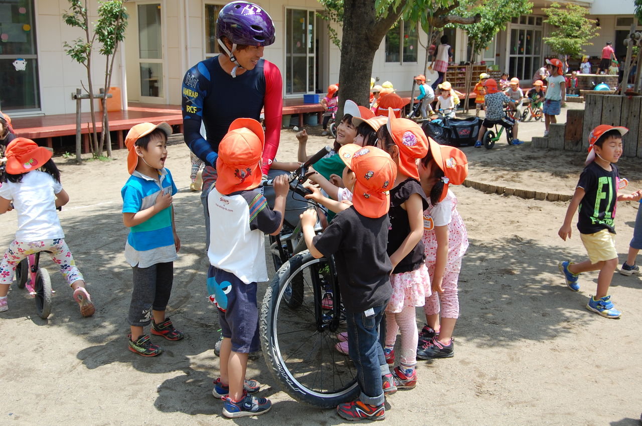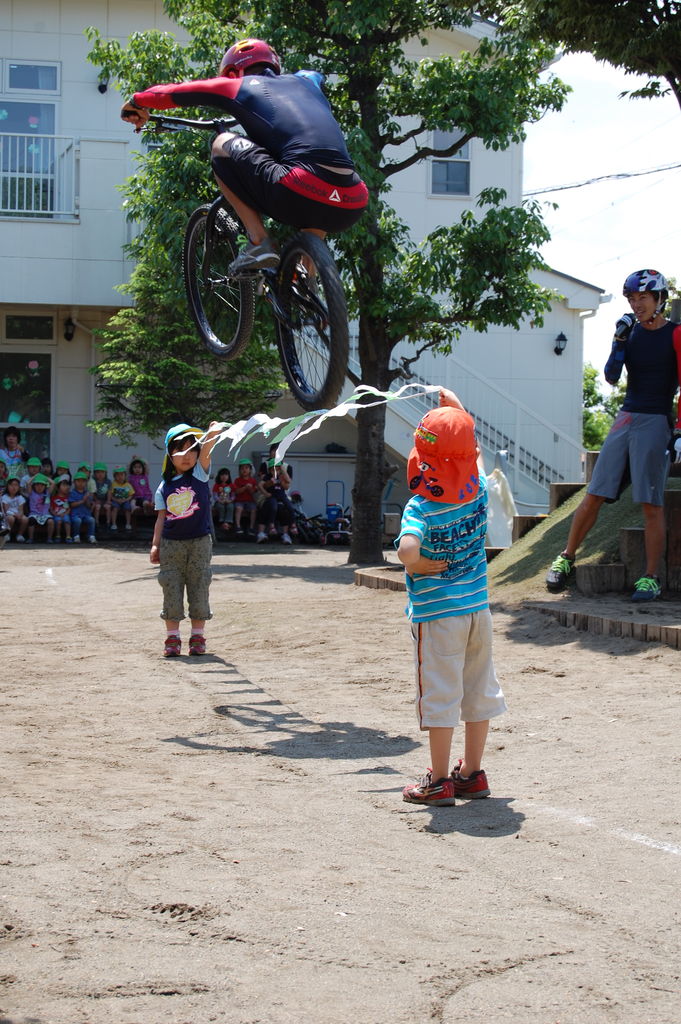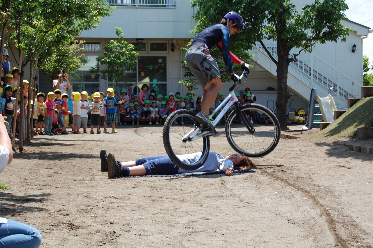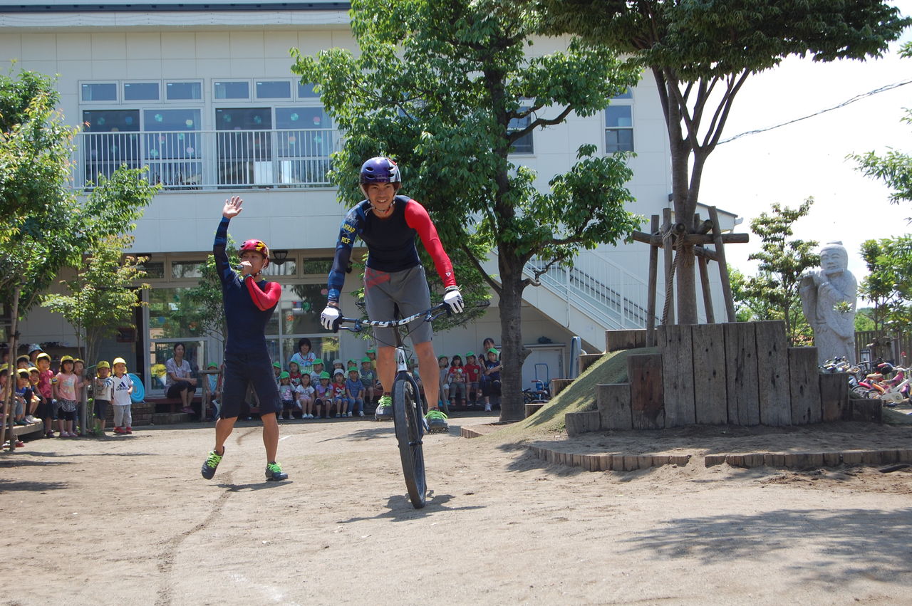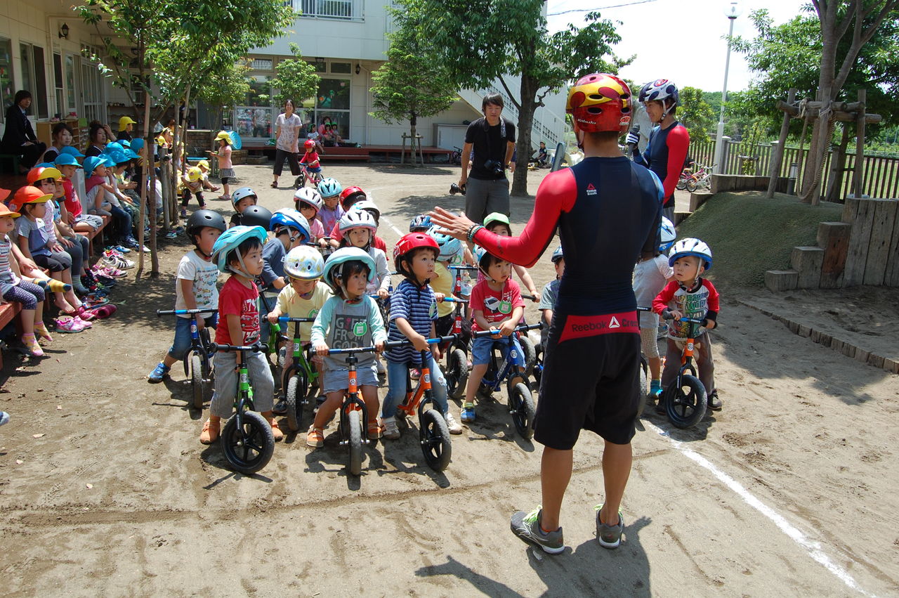 バイシクルトライアル世界チャンピオンであり、シルク・ドゥ・ソレイユ / マッスルミュージカルで活躍した有薗啓剛選手(アリちゃん)と守上大輔選手(ダイちゃん)によるストライダーライディングスクールが5月22日、柏市の柏さかさい保育園で開催されました。