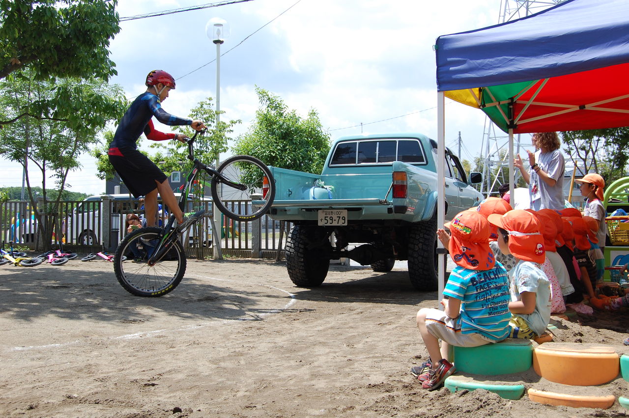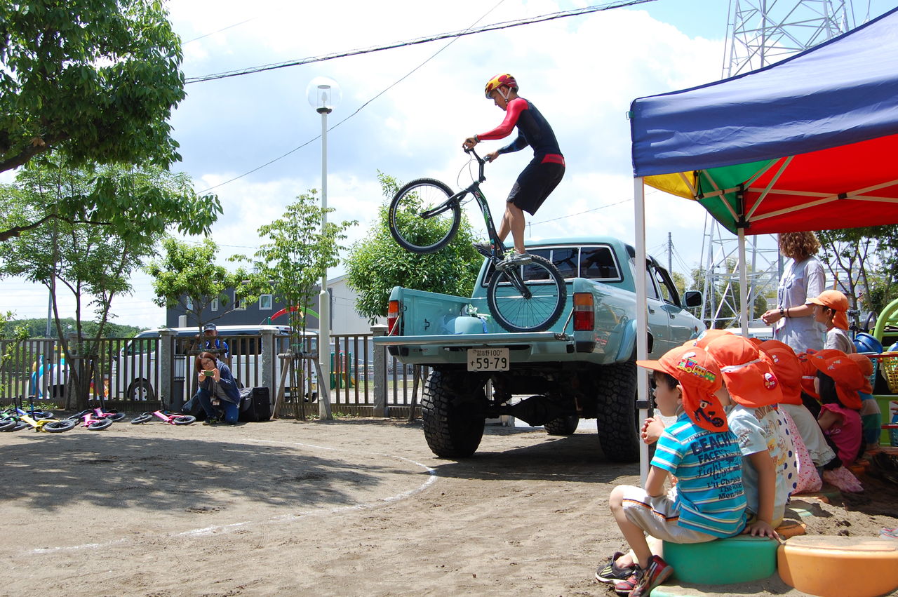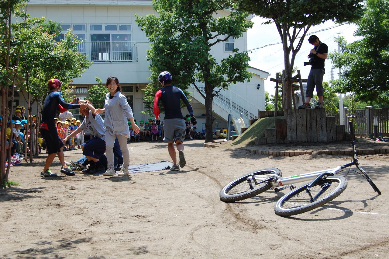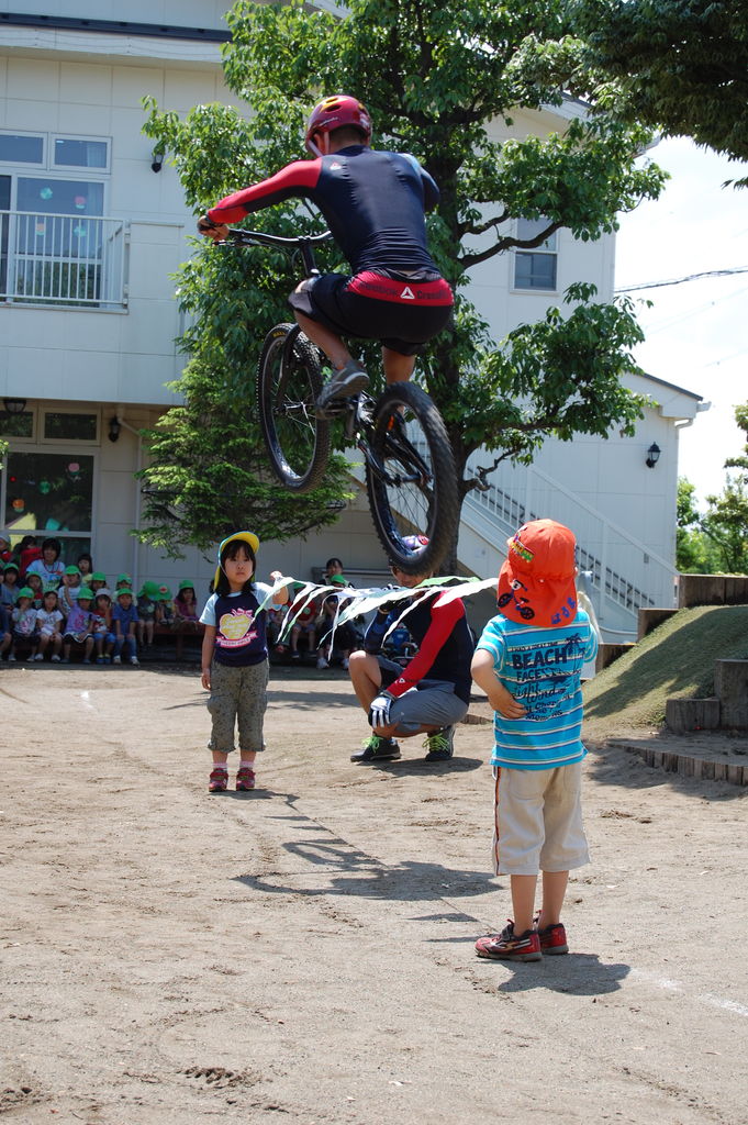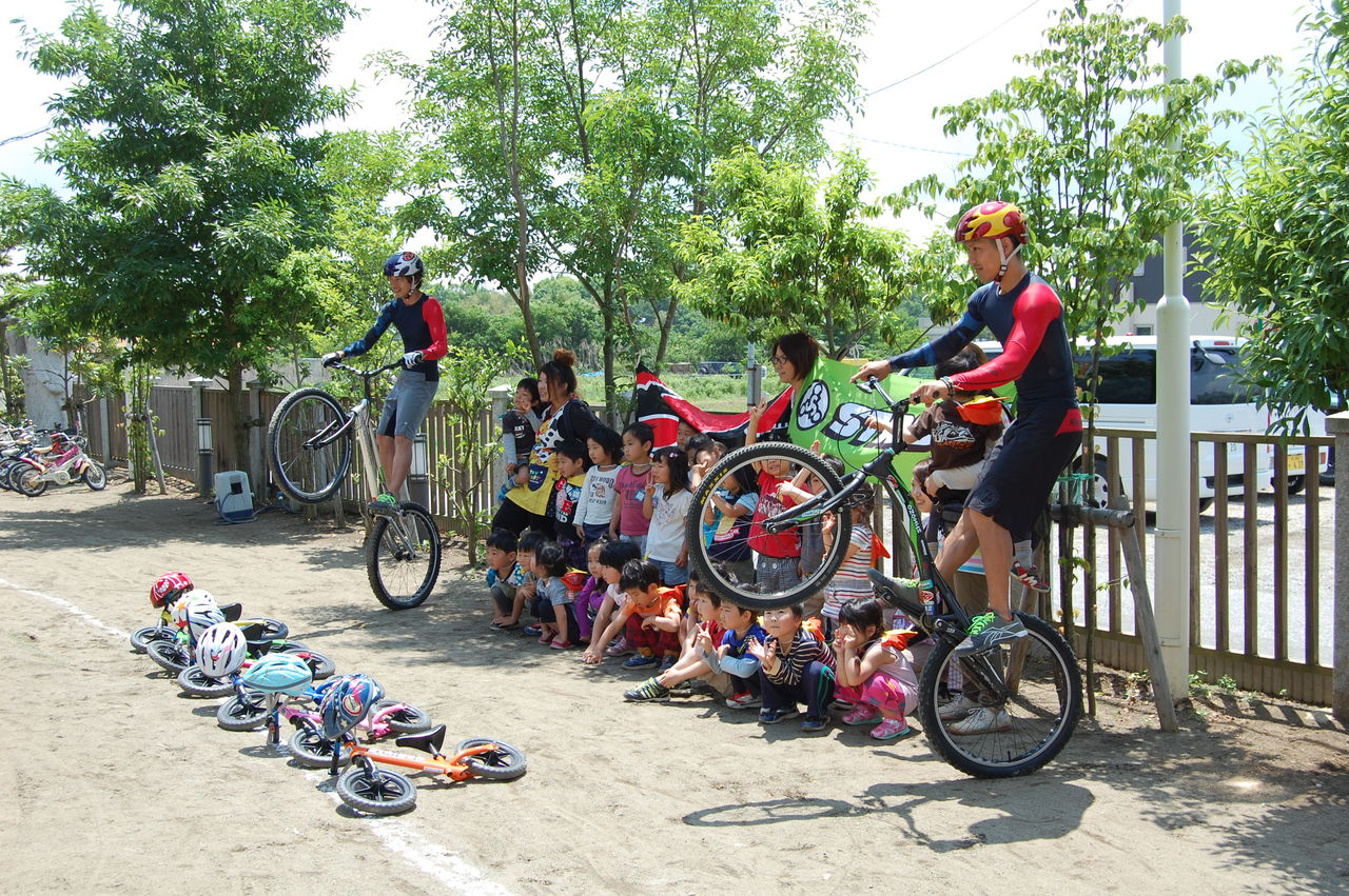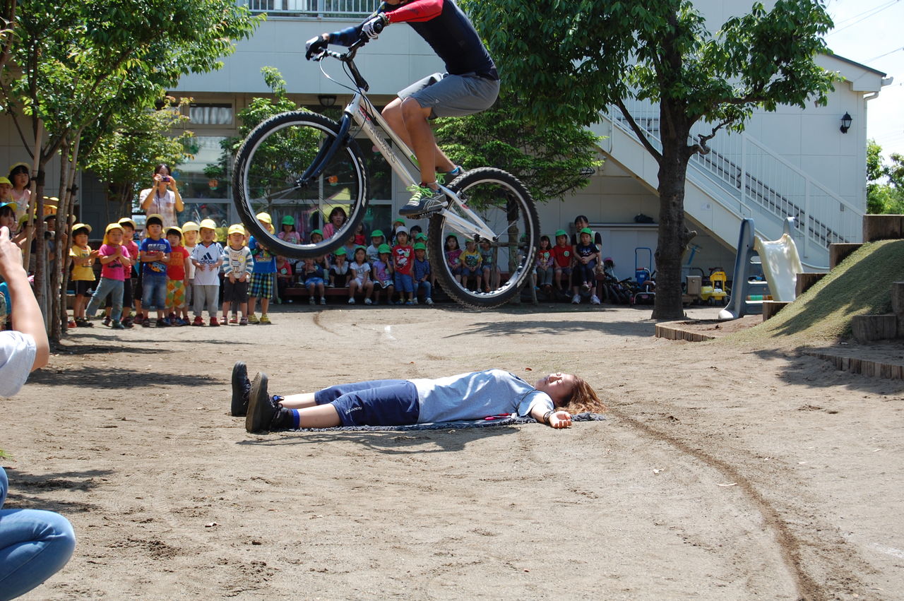 バイシクルトライアル世界チャンピオンであり、シルク・ドゥ・ソレイユ / マッスルミュージカルで活躍した有薗啓剛選手(アリちゃん)と守上大輔選手(ダイちゃん)によるストライダーライディングスクールが5月22日、柏市の柏さかさい保育園で開催されました。