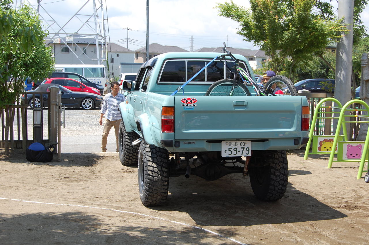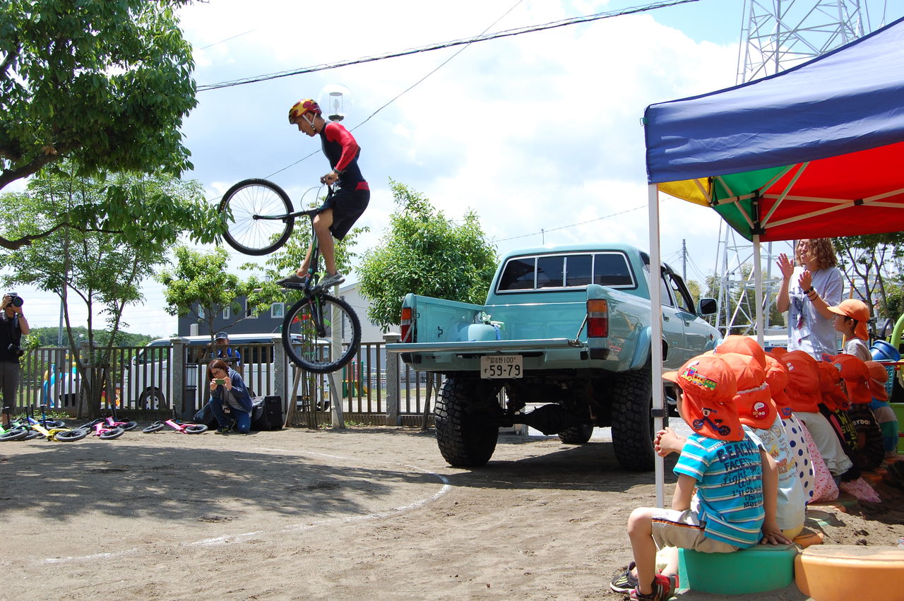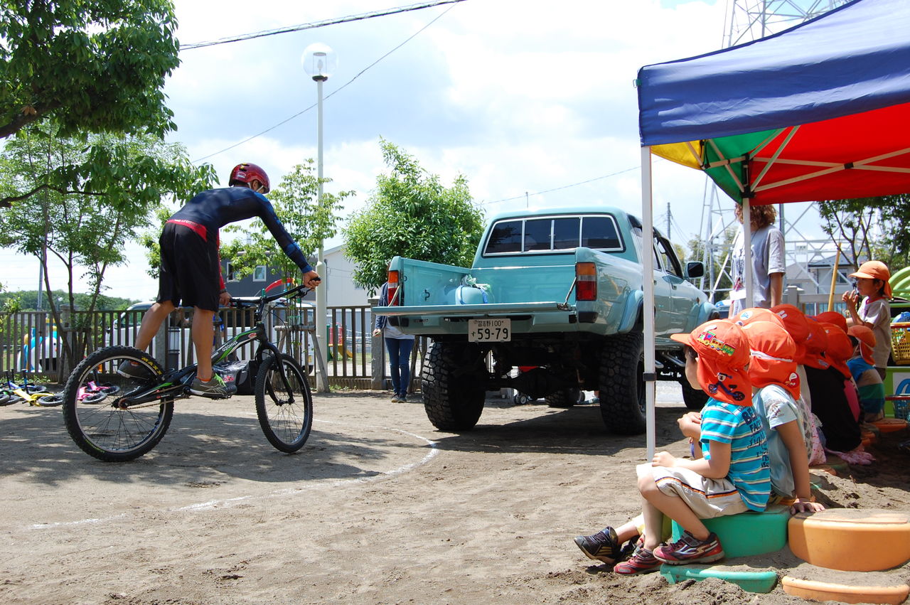 さー、バイクパフォーマンスの開始です。まずはダイちゃん、自分のゴッツイ車を使って技を披露。
