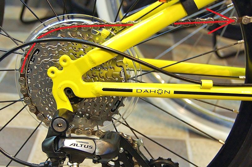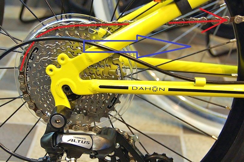 赤線はスプロケットに掛かるチェーンの引っ張る方向を示している。