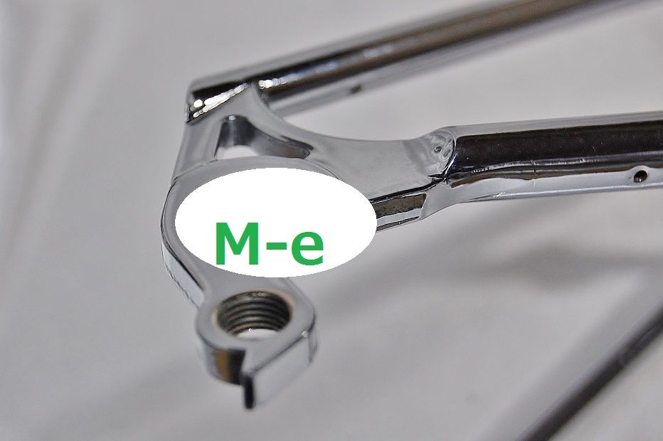 キモリオリジナルのリヤエンドは、スチールプレートによる普通のドロップエンドだ。上の写真は同時に作った”オッサン”の黒塗りリヤアーム。ぼくのコロッサスはメッキしたため、どうも調子が悪かった。走行中ホイールのセンターがずれて、ブレーキが引きずり始め、段々と重くなる。またクイックを締め直すの繰り返し。トラックエンドを持つピストではナット留めのため十分なトルクで締め付けができ、メッキでも滑らない。 「あ〜クイックでは十分なトルクが掛からないからメッキじゃ滑るんだな」 位にしか思っていなかった。