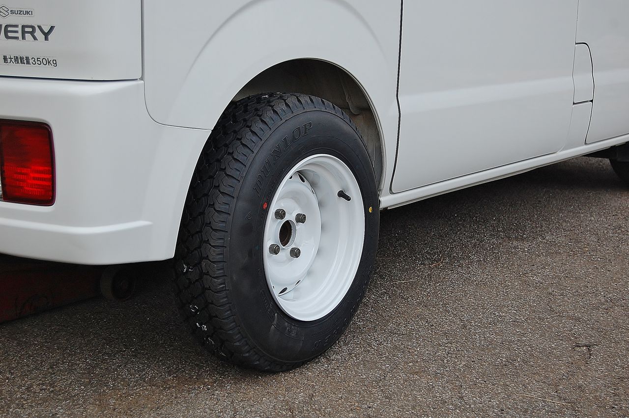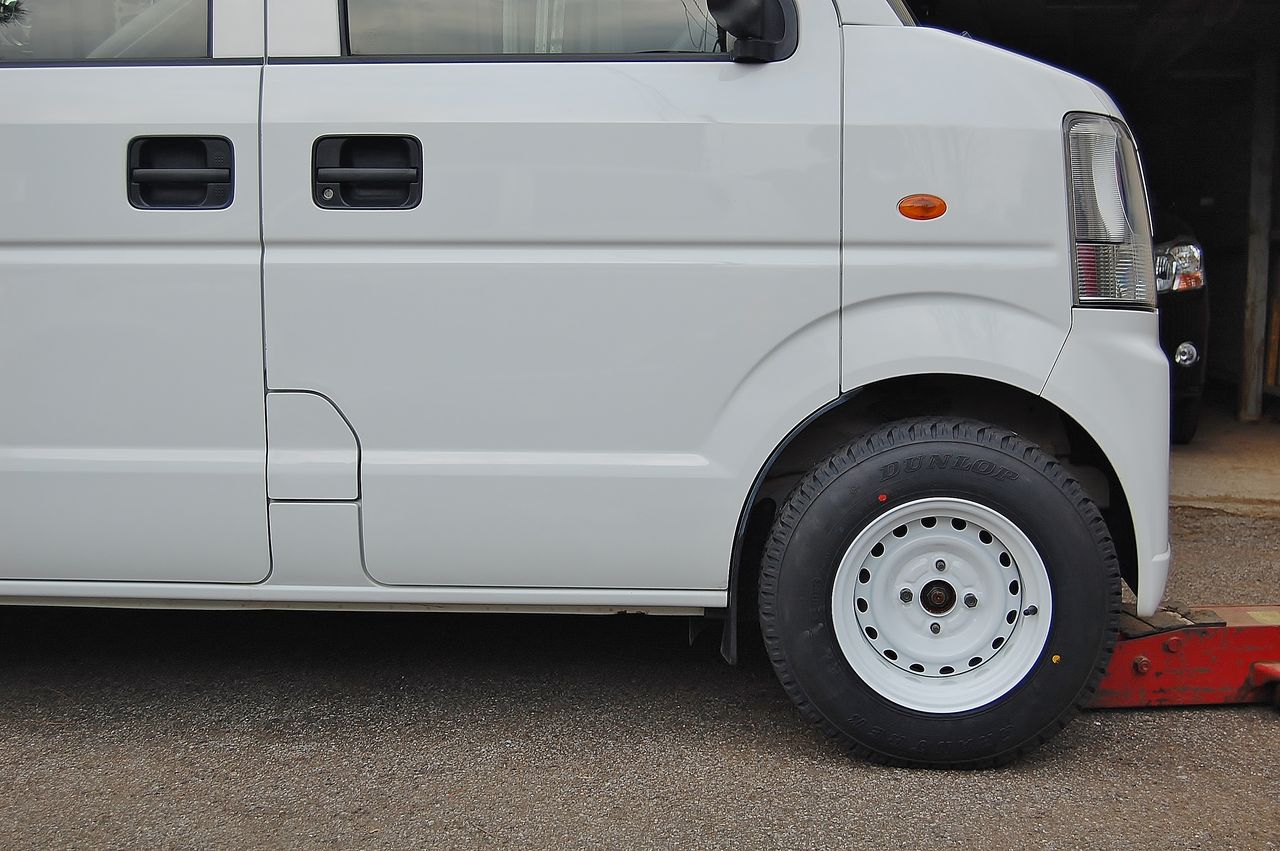 ホワイトペイントの6.5インチワイドホイールが完成。ツーインチダウンの試みは見事に当たってグットルッキン! 10インチ時代のモーリス・ミニに、ダンロップセミレーシングタイヤのG5 をスピードスターホイールで引っ張るのが流行っていた頃を思い出す。写真では解りづらいと思うが。パンパンに膨れてます。ホイールにタイヤを組んでもガバガバで、普通の空気の入れ方では、一向にビードが上がらない。それでは、ぼくのハイセンスで、ゴルフカートのようになったEVERY をご覧ください。