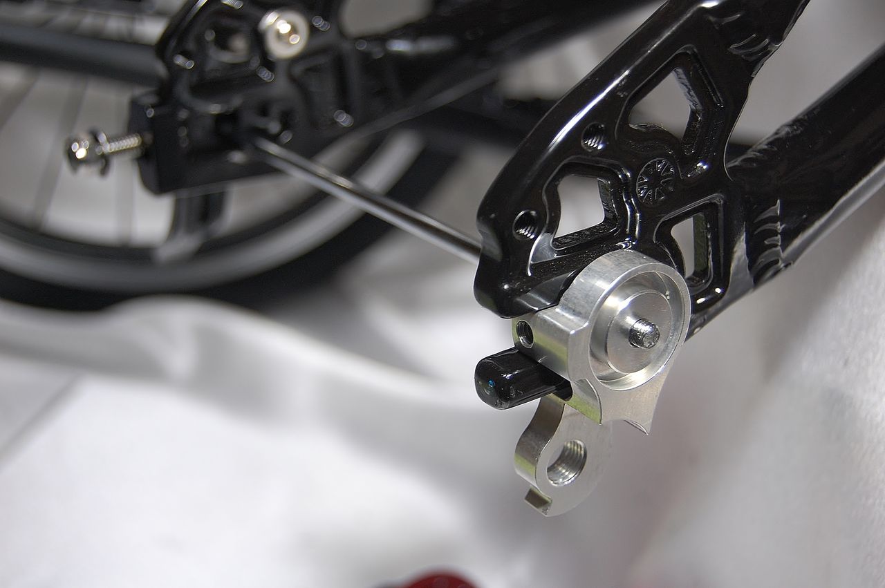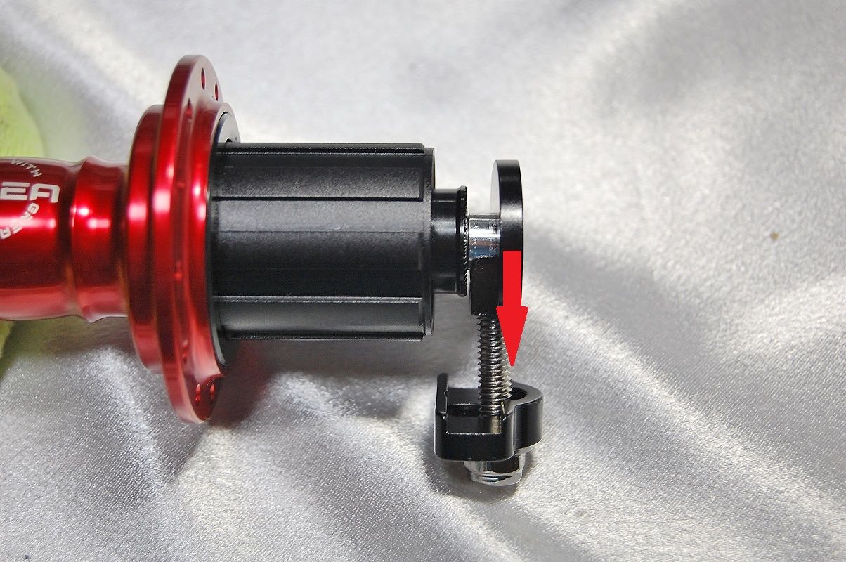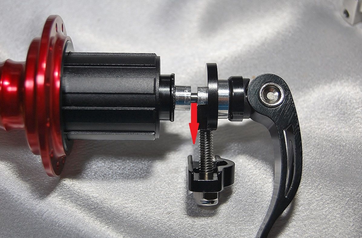 変換アダプターがチェーン引きやリヤディレーラーハンガーに掛かるまで伸ばせば段付きカラーも要らないし、チェーン引きが、直接ハブを引っ張ることになるではないか。そうなればクイックシャフトに掛かるストレスは一切なくなり、以前に書いた「シャフトではなく紐でも良いわけだ」が成り立つ。これは、普通の10mm シャフトのハブでは出来ない戦法だ