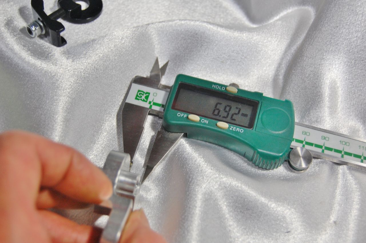 それでは、両側面に入るカラーの寸法を当たって行こう。ノギスのデプスを使ってエンドの面から変換アダプターまでの距離を測ると、