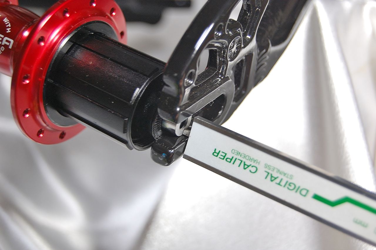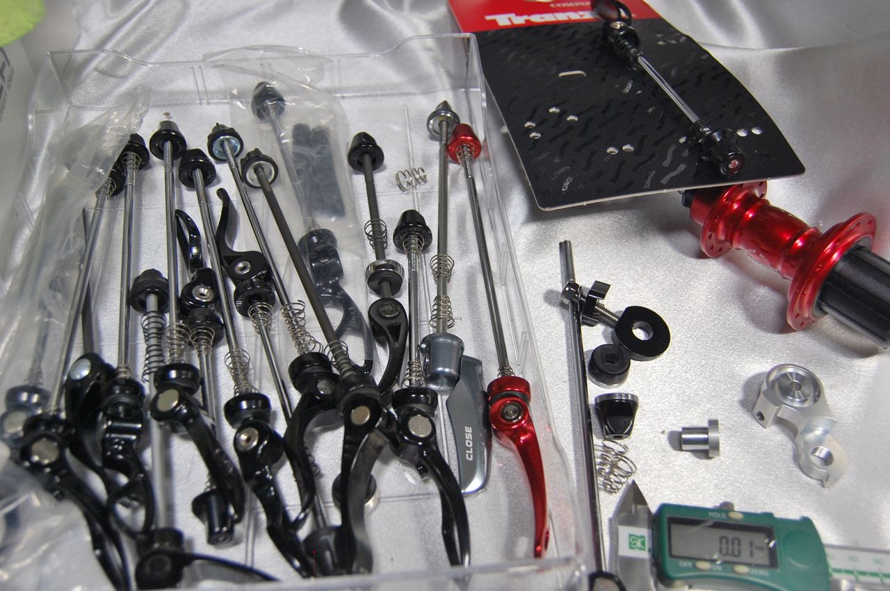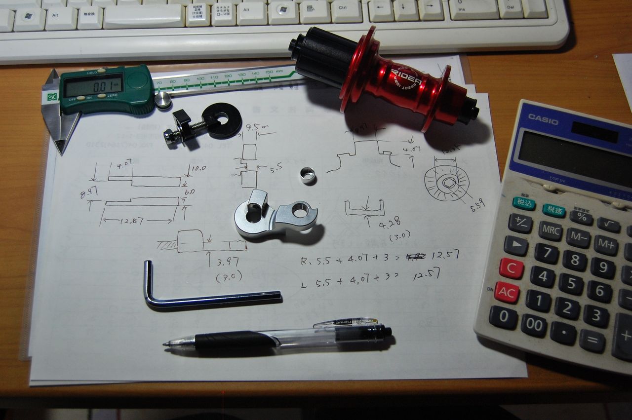 145mm の超ロングクイックも手に入った。さて、大恥をかいた変換アダプターでハブのエンドへの支持は解決。後は、右ディレーラーハンガーと左チェーン引きの外側から入る段付きカラーの寸法を出し、暗黒さんに削って貰えば何とかなりそうだ。