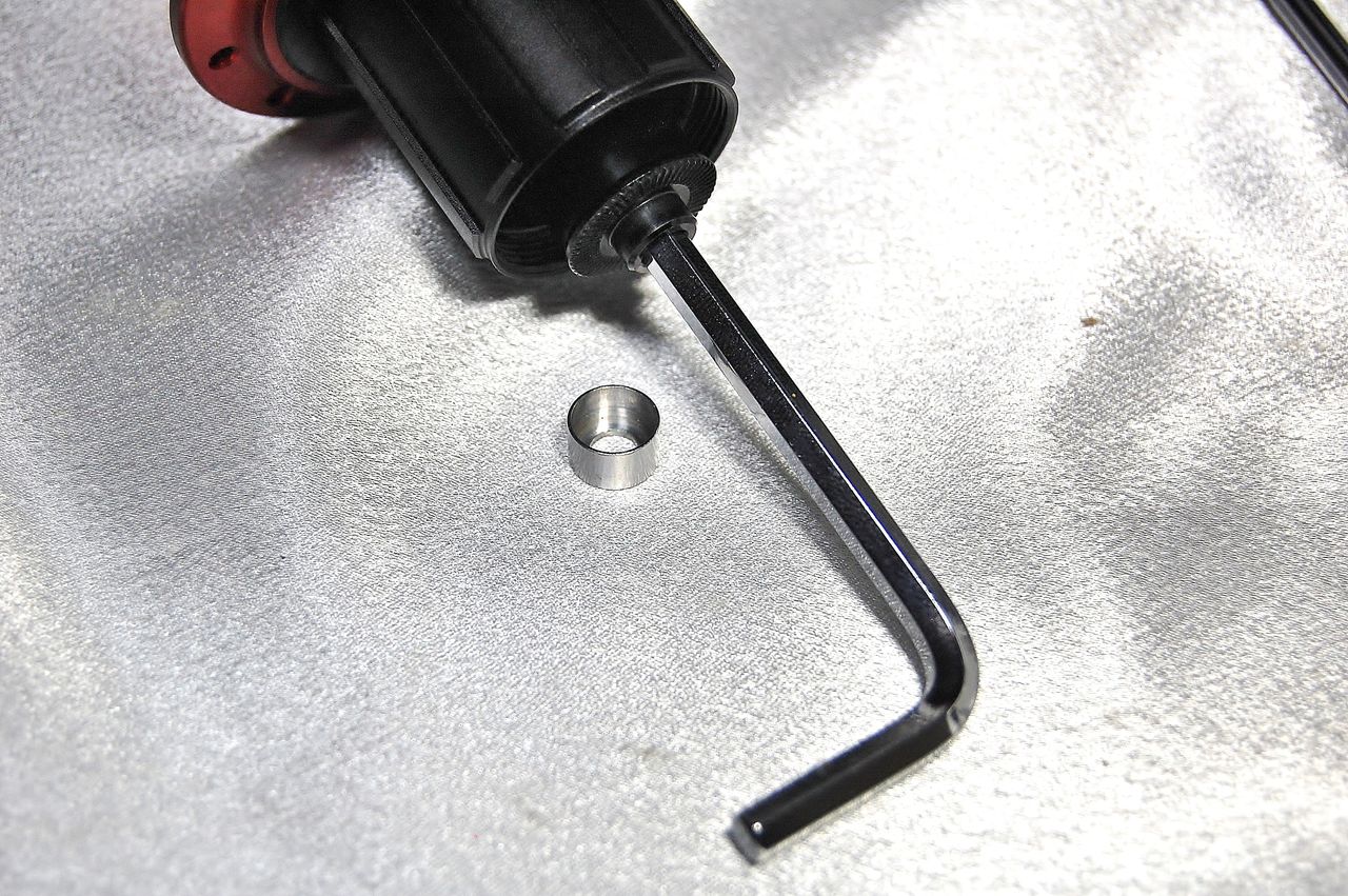 よって、5mm のアレーンキーが通る穴に広げておけば、圧入した変換アダプターを外さなくとも後のハブ分解が可能となる。