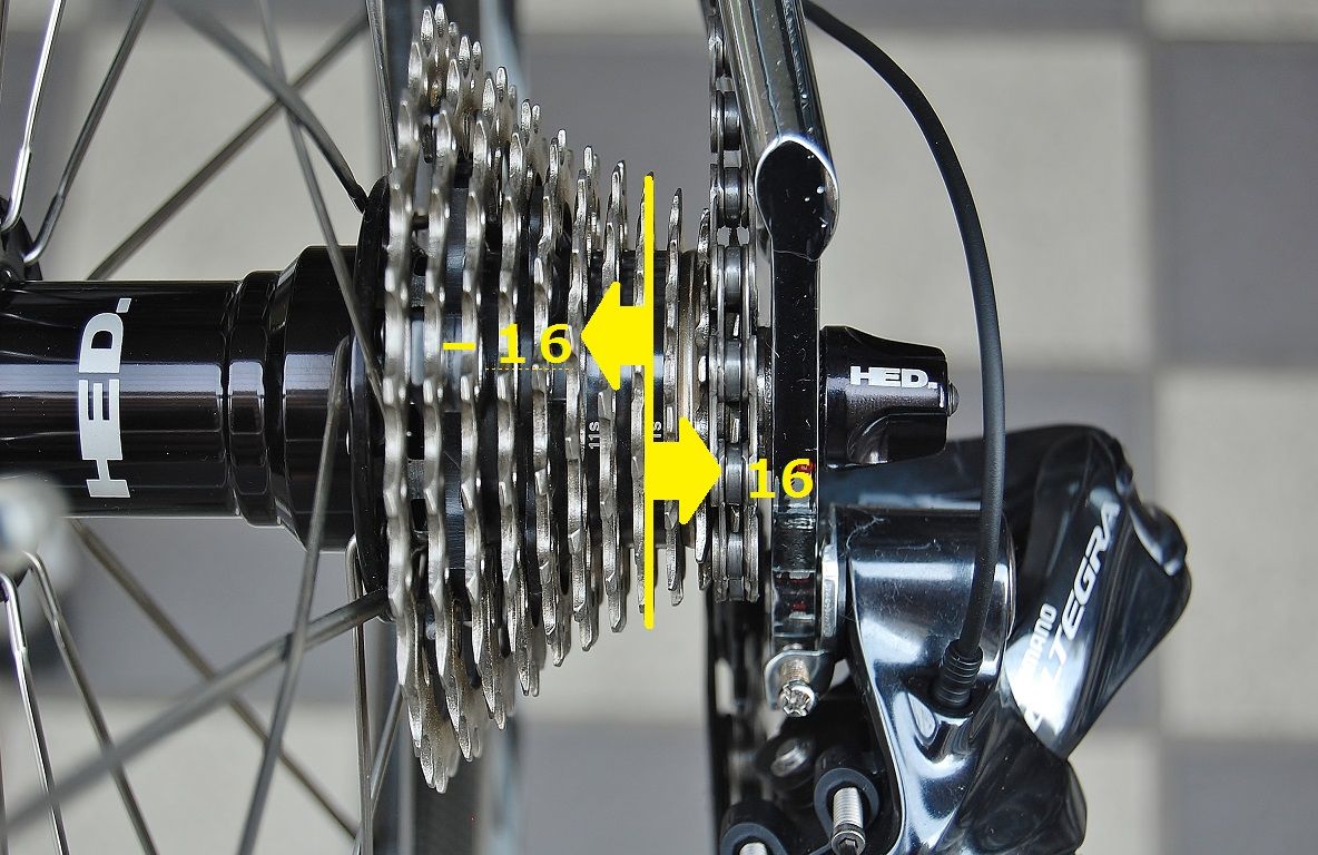 リヤディレーラーとディレーラーハンガーの間にワッシャーを噛ませて外に出す裏ワザを試みる。