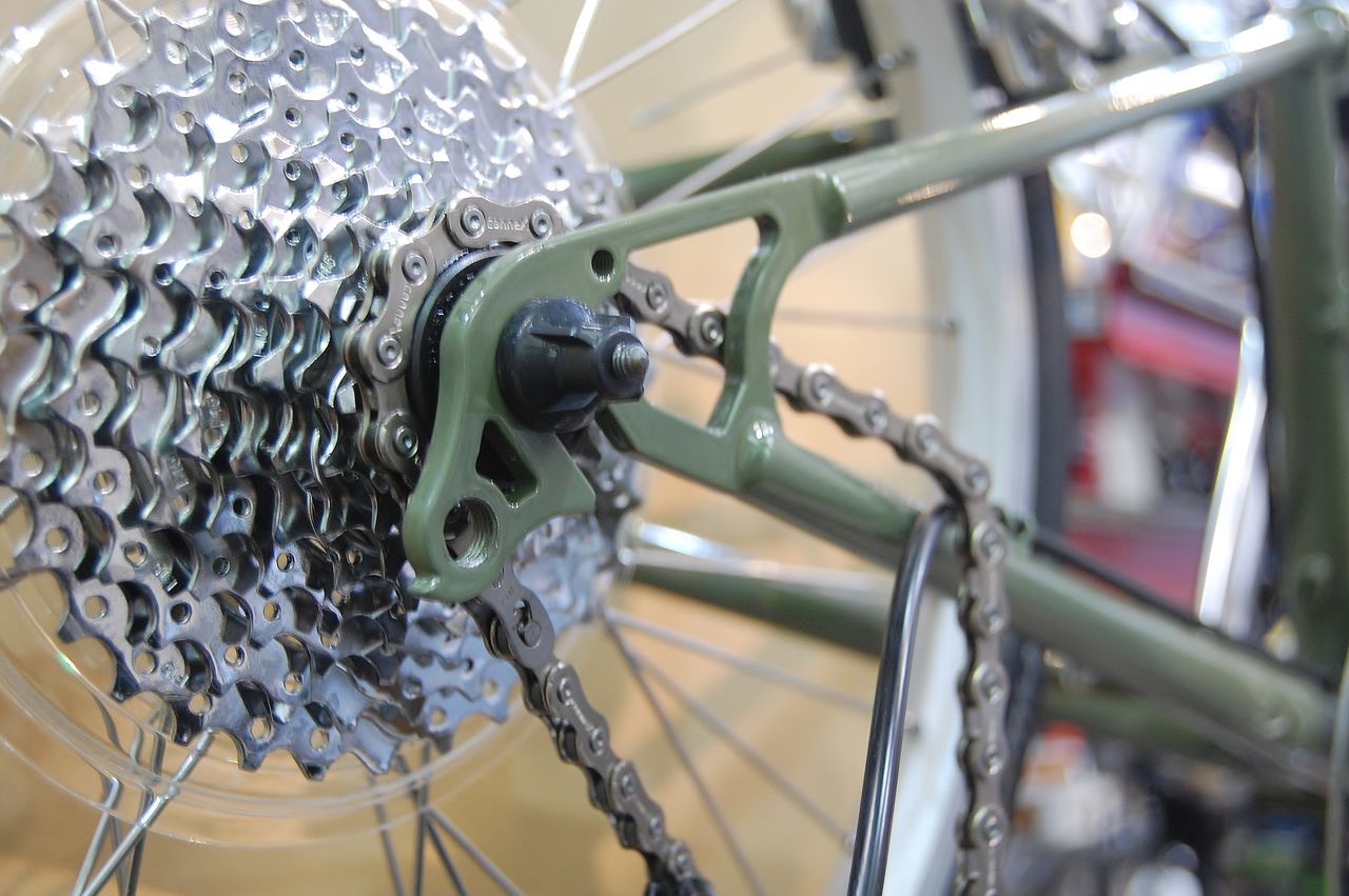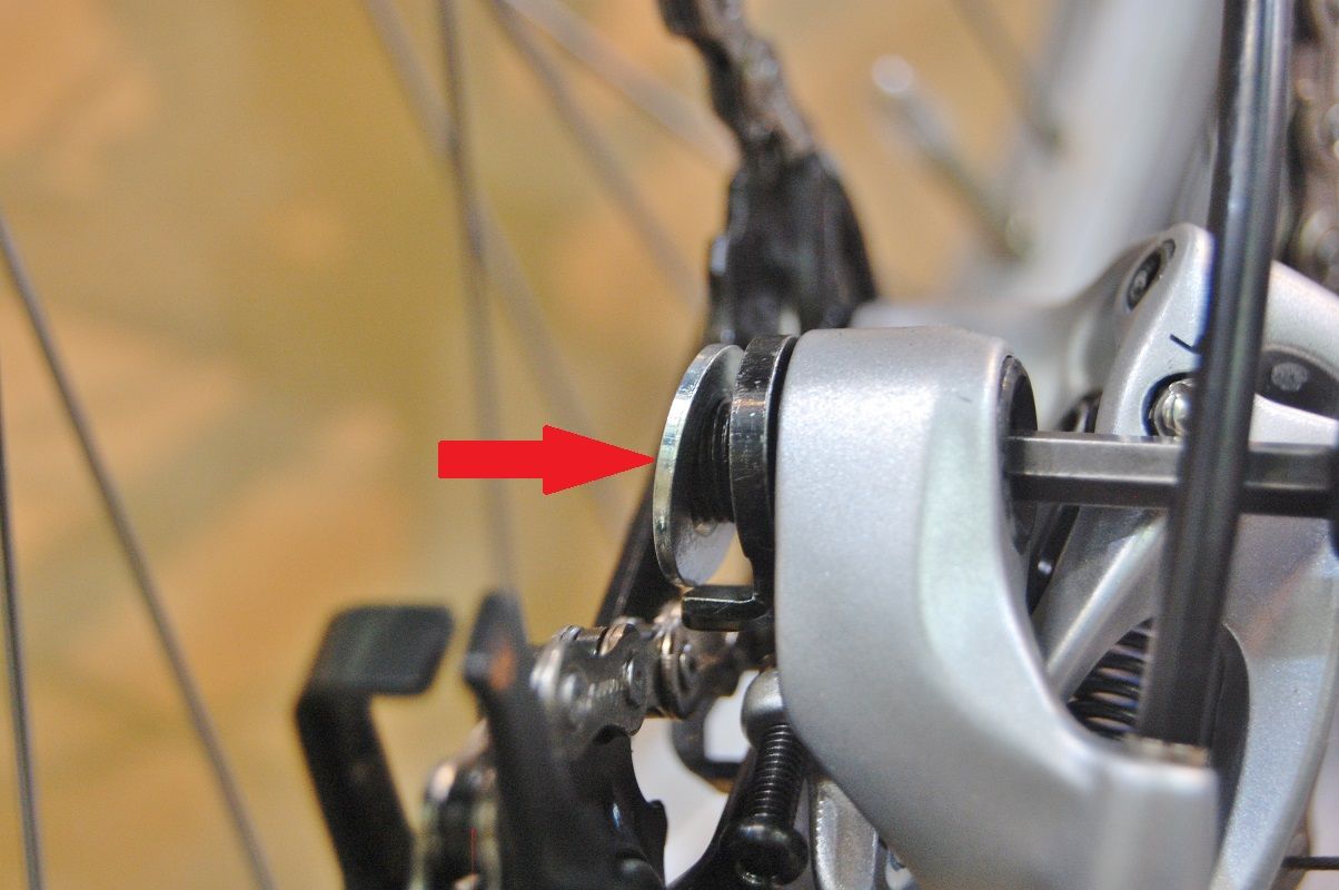 リヤディレーラーを外すとワッシャーが1枚。これはSRAM に付いてくるのだろうか、それともパシュレー社がアッセンブリーする際、入れた物なのか? その右にあるフック式のBテンションは、エンドが極端に薄いモールトンには有利だ。