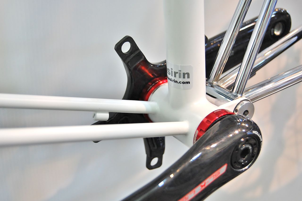 てことは、この画像のものは SRAM の展示会で見た ROTAR のような左クランクアームにプリロード調整機構が付いているやつです。おのずと左クランクアームとシャフトは一体ですから右クランクアームを繋ぐフィキシングボルトは右側に来るわけです。