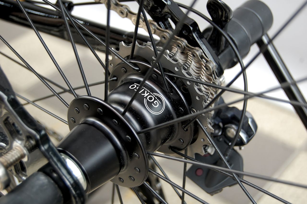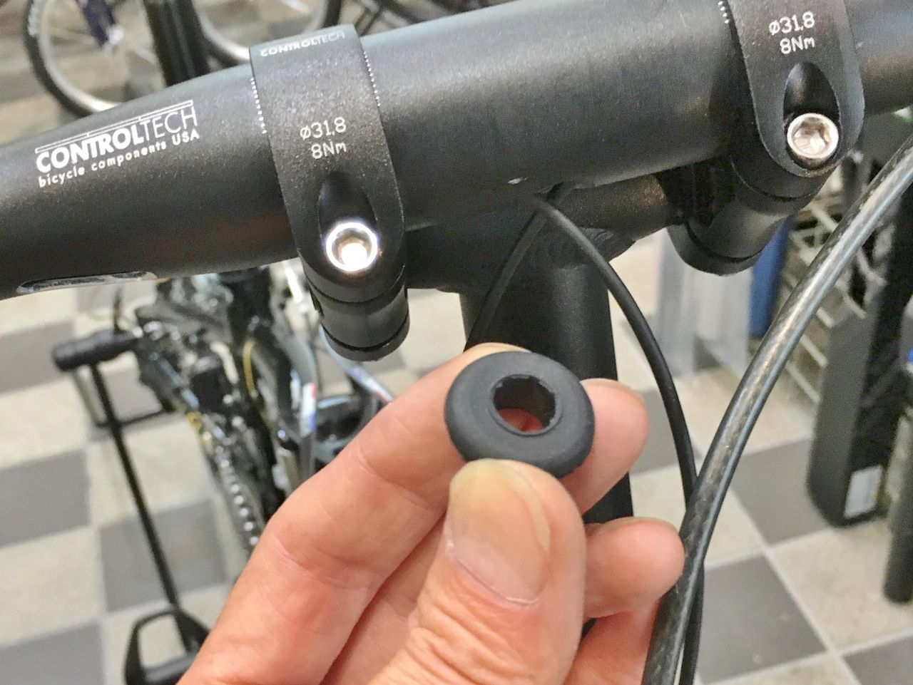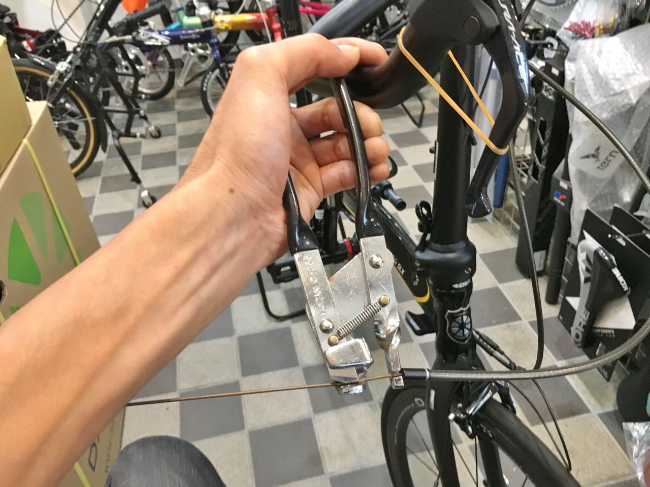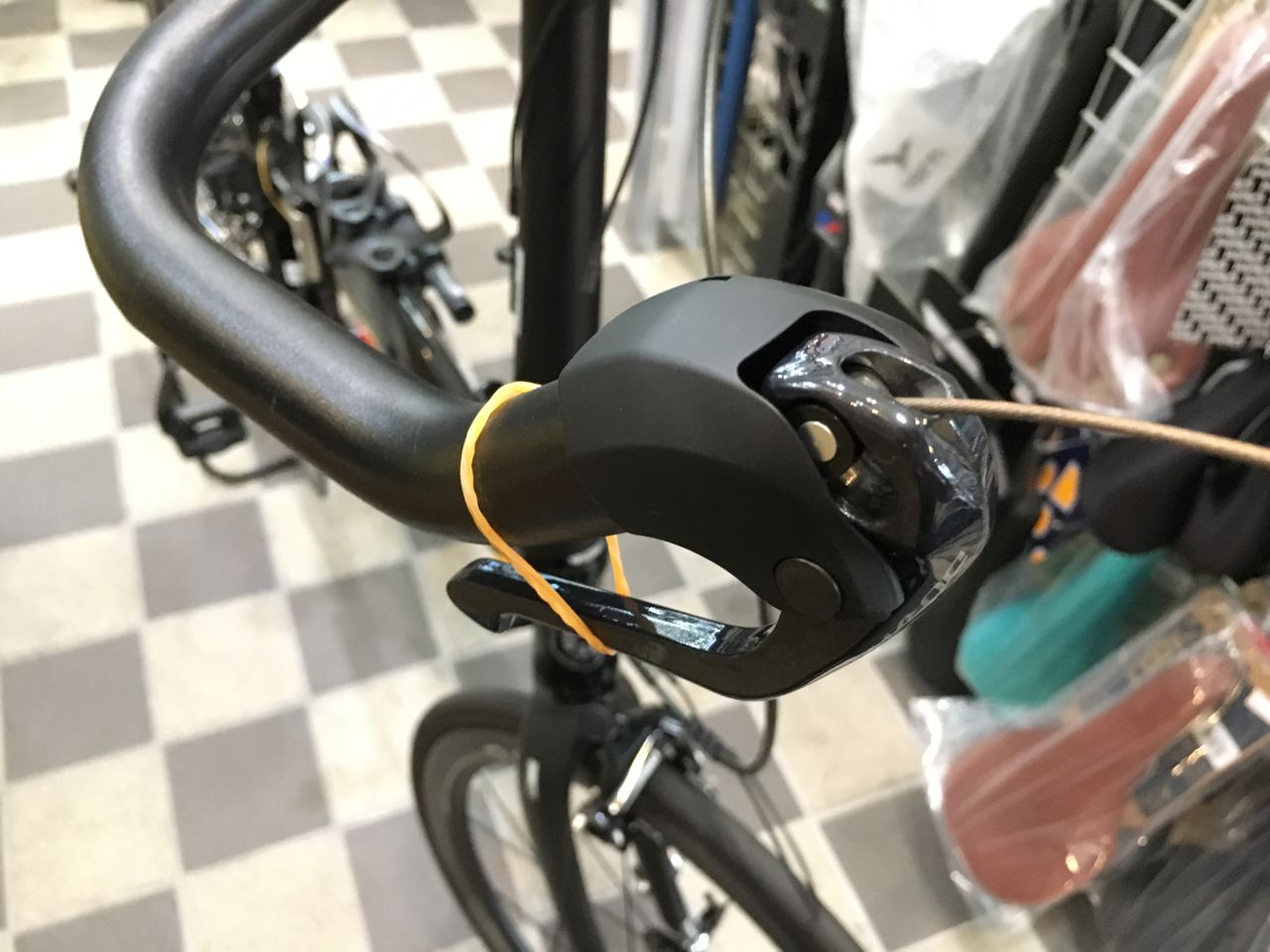 DURA のブレーキインナーケーブルを通していきます。輪ゴムは、便利。