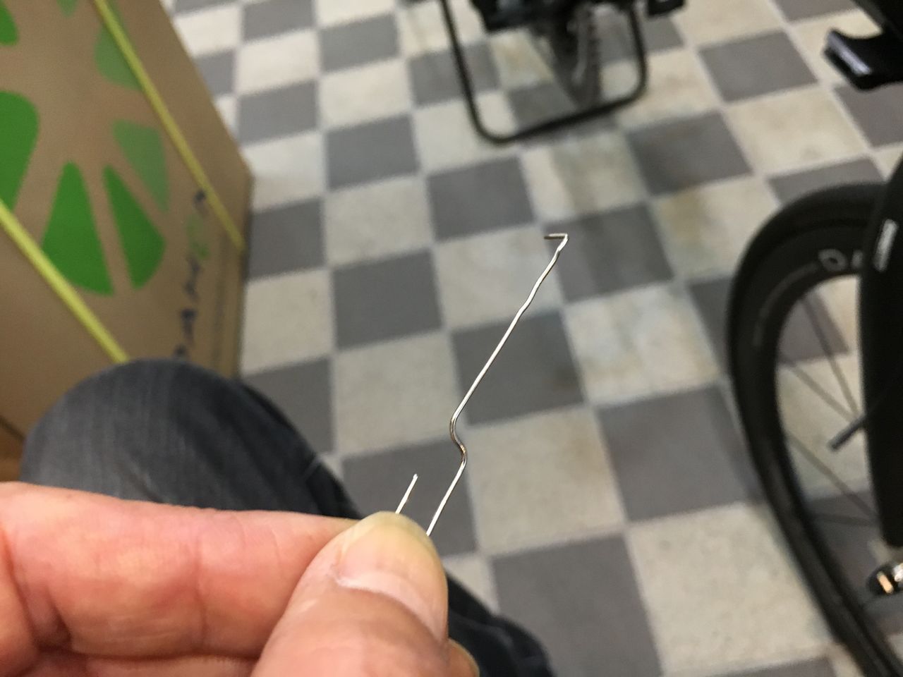 ペーパークリップの先をカギ形に曲げた特殊工具。