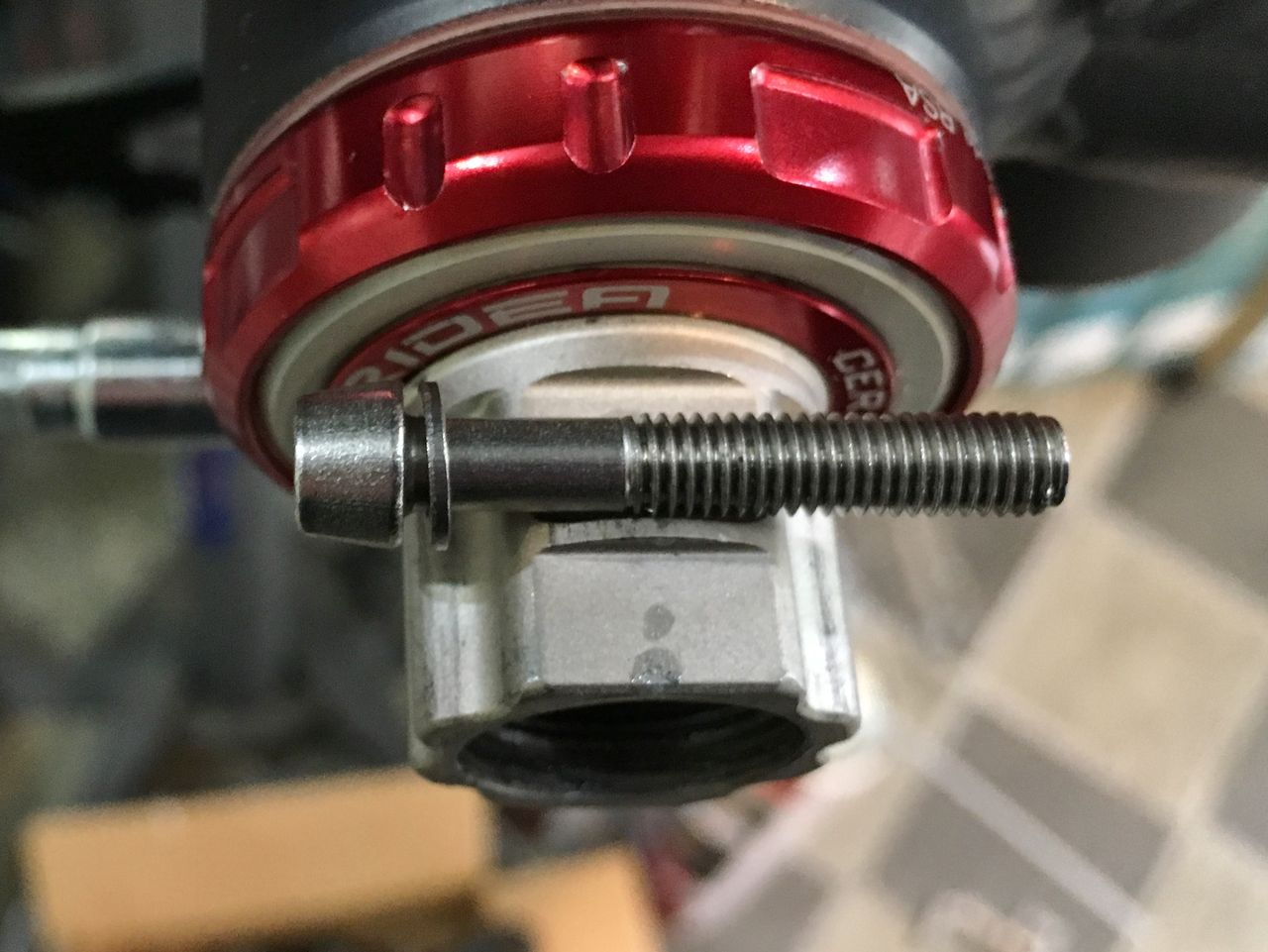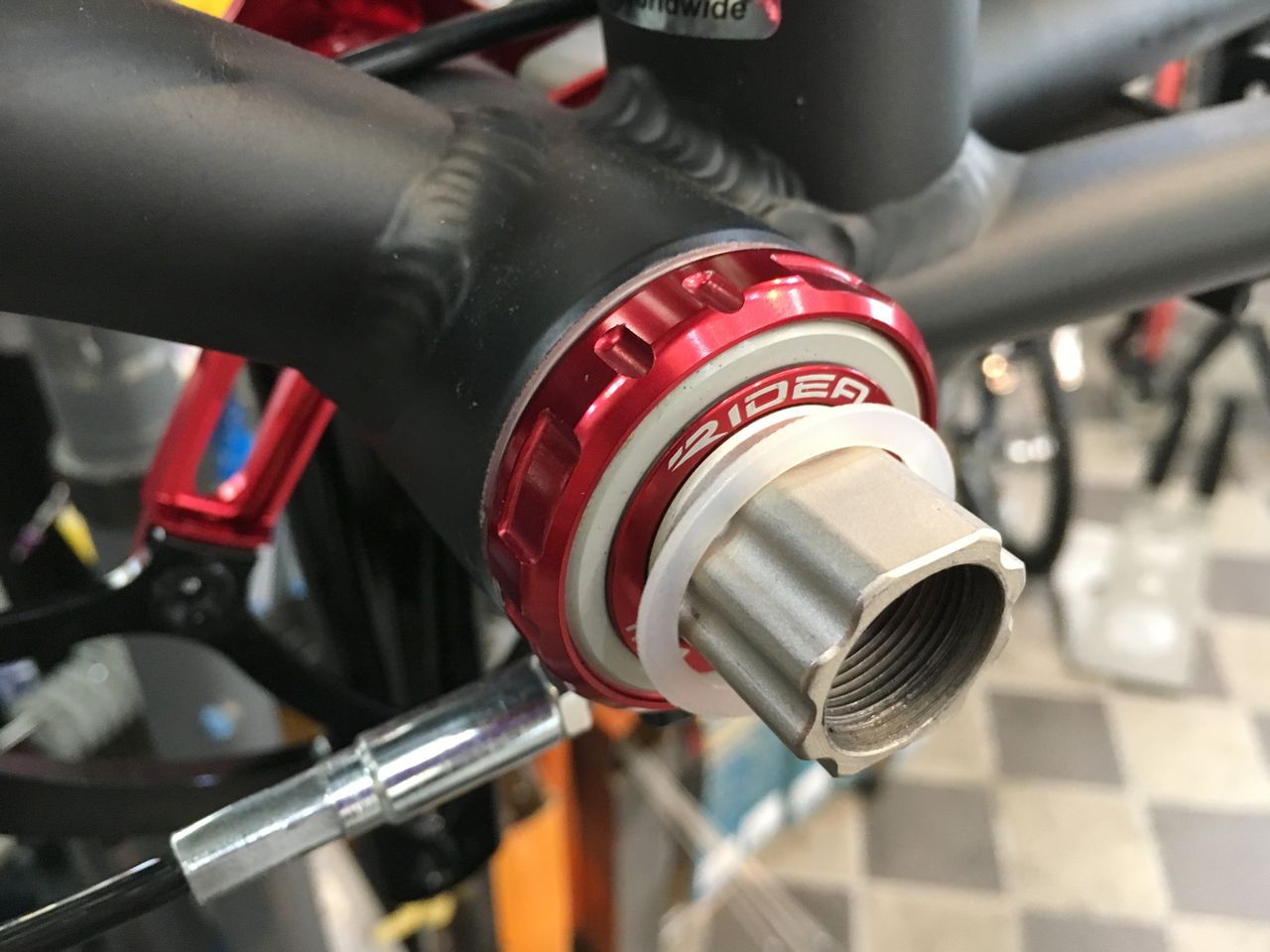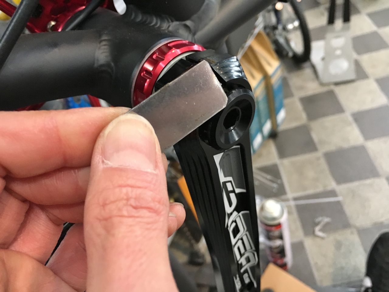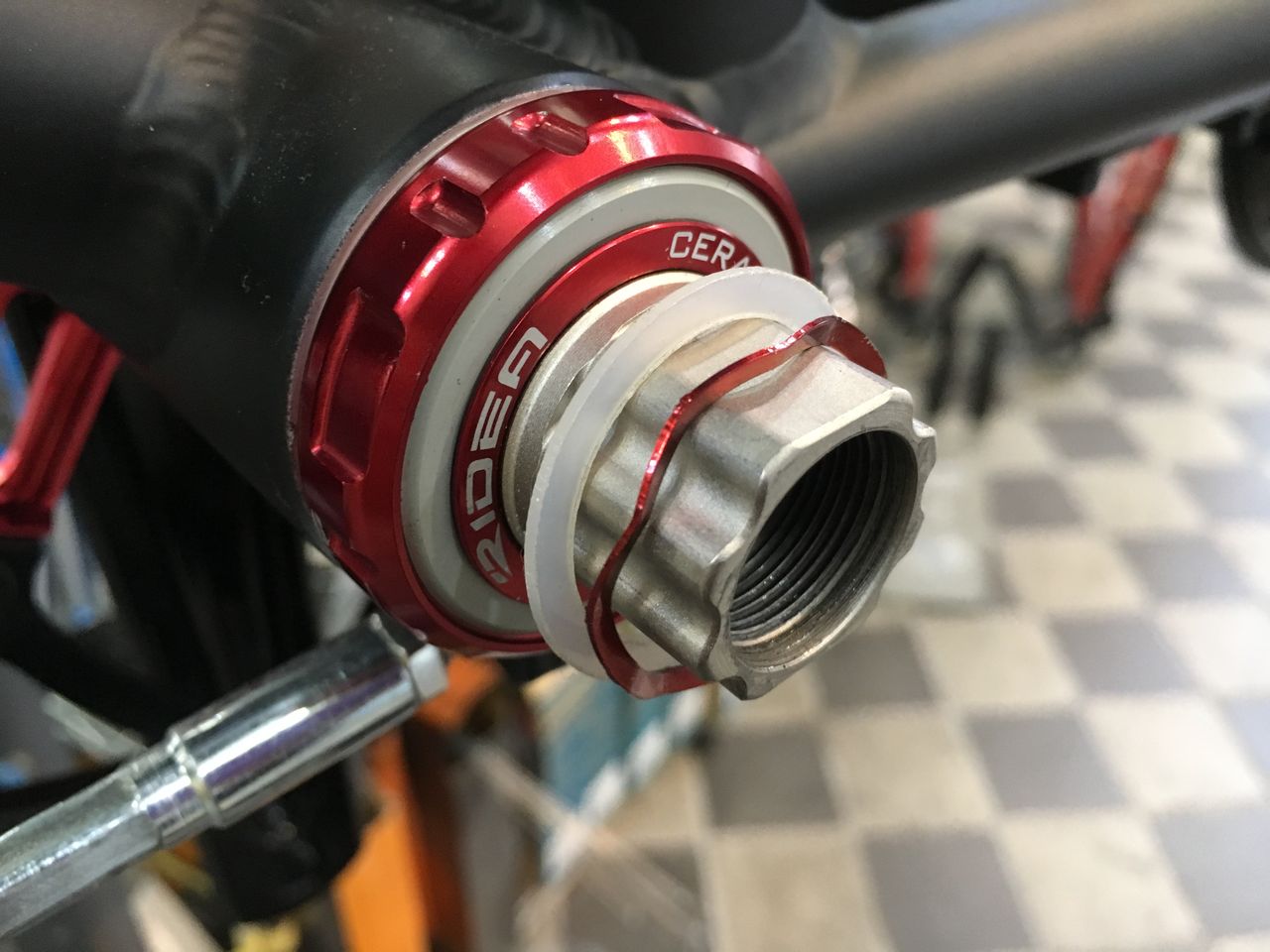 BB クランクに付属してくるシムは、この0.2mm ×2、アルミ1mm ×1と樹脂の1.2mm、ウェーブワッシャーです。これから厚さの異なるシムを何回も入れ替えなければなりません。