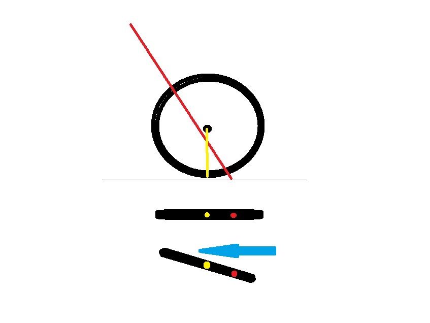 それでは、なぜトレールが長くなると直進安定性が増すのかは、これを縦から(キャスター角の上から)見ると分かりやすいです。進行方向前方の赤点が、ハンドルを切るコラム中心線です。それに引っ張られているのが黄色の地面とタイヤの接点です。(この図書くの大変だった!)