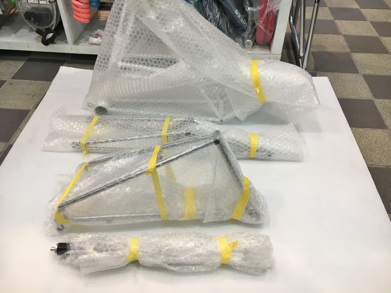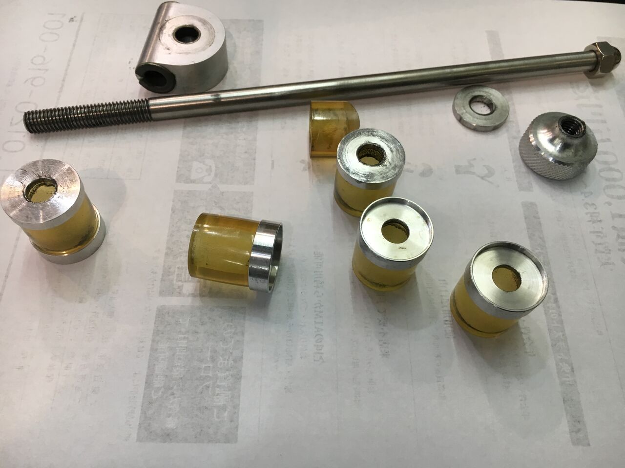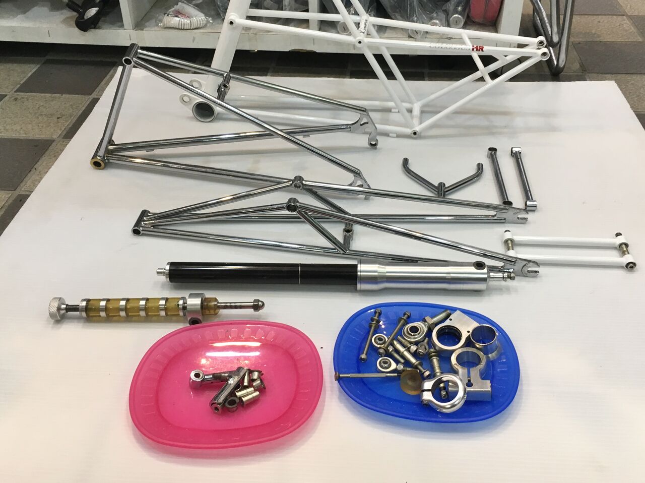 昨日書いたようにメッキパーツは全てクリアー塗装の剥離をします。フロントダンパーユニットはオーバーホールしてオイルシールの交換。リヤピポットブッシュは、交換後実際のメインフレームとリヤアームに合わせて加工するため現物が必要。これらをキモリファクトリーに送ります。