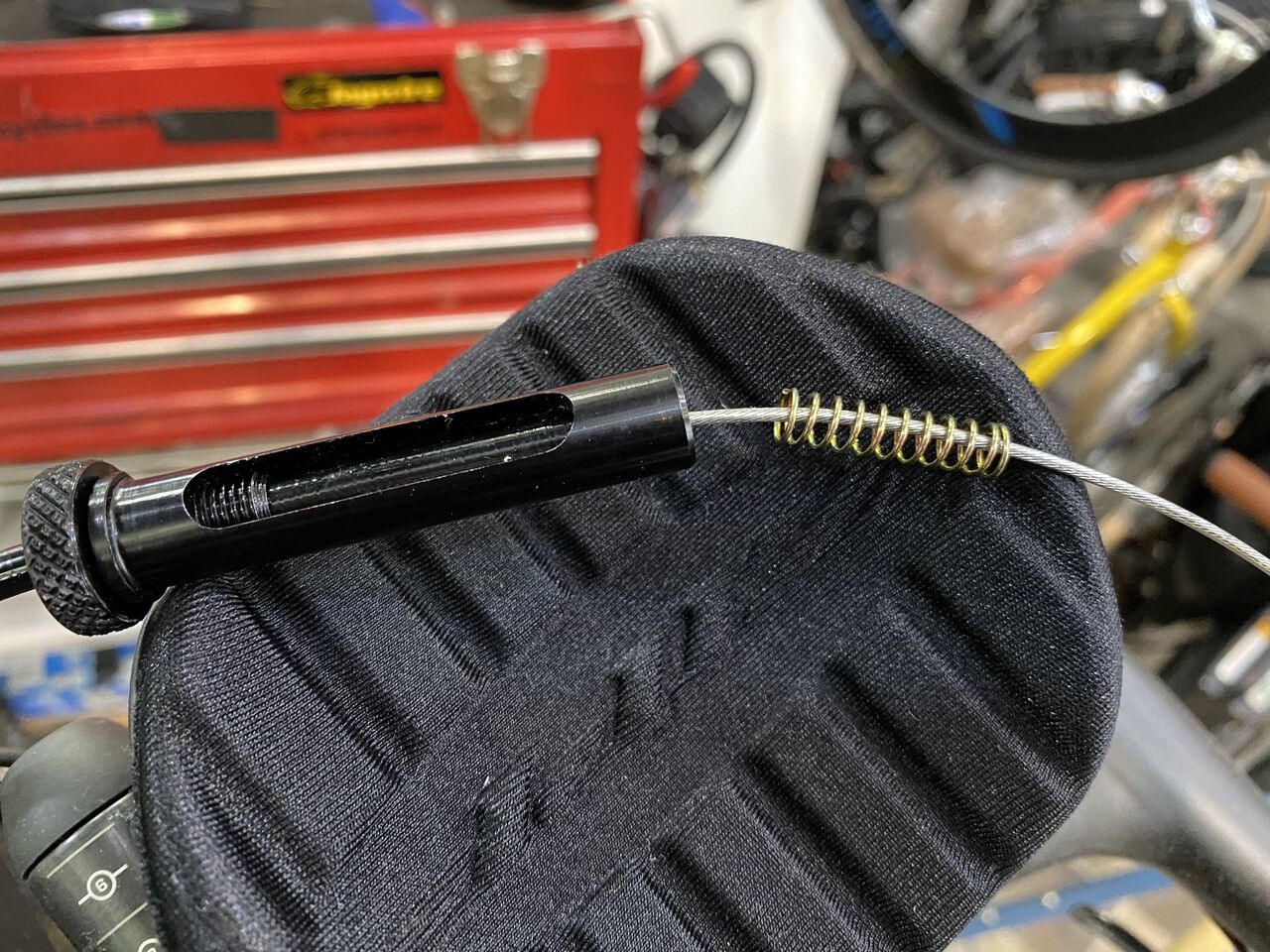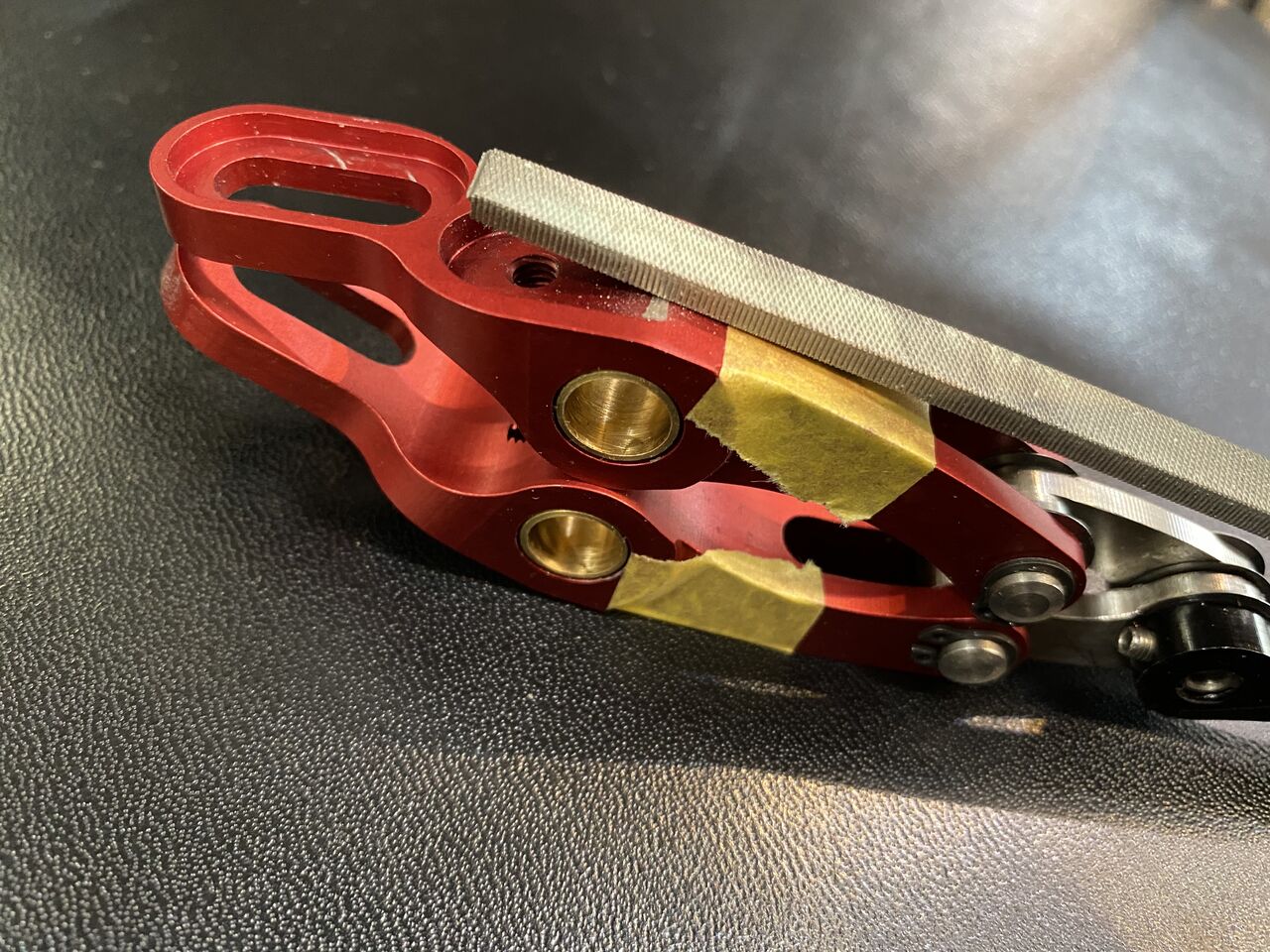 スプリングの力強くなったからカーボンフォークと擦れあってキコキコ行ってたんだ。だから最初グリスが塗ってあったのね。綺麗に拭き取っちゃたよ。先端少し仕上げておきましょう。