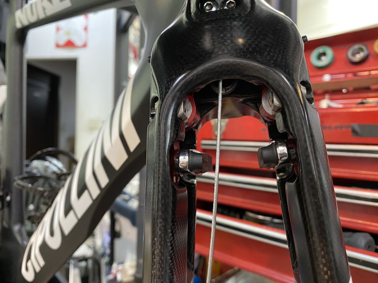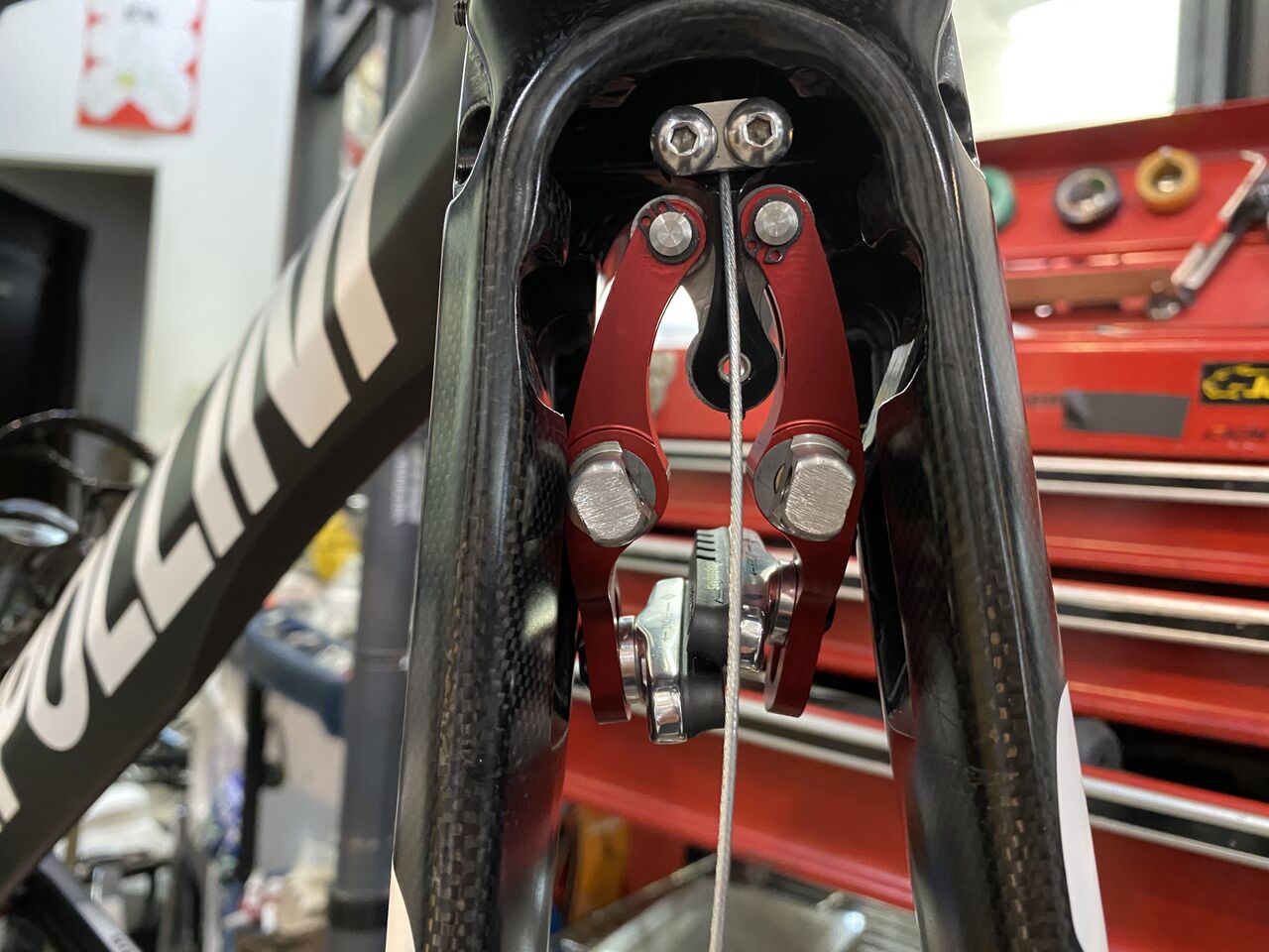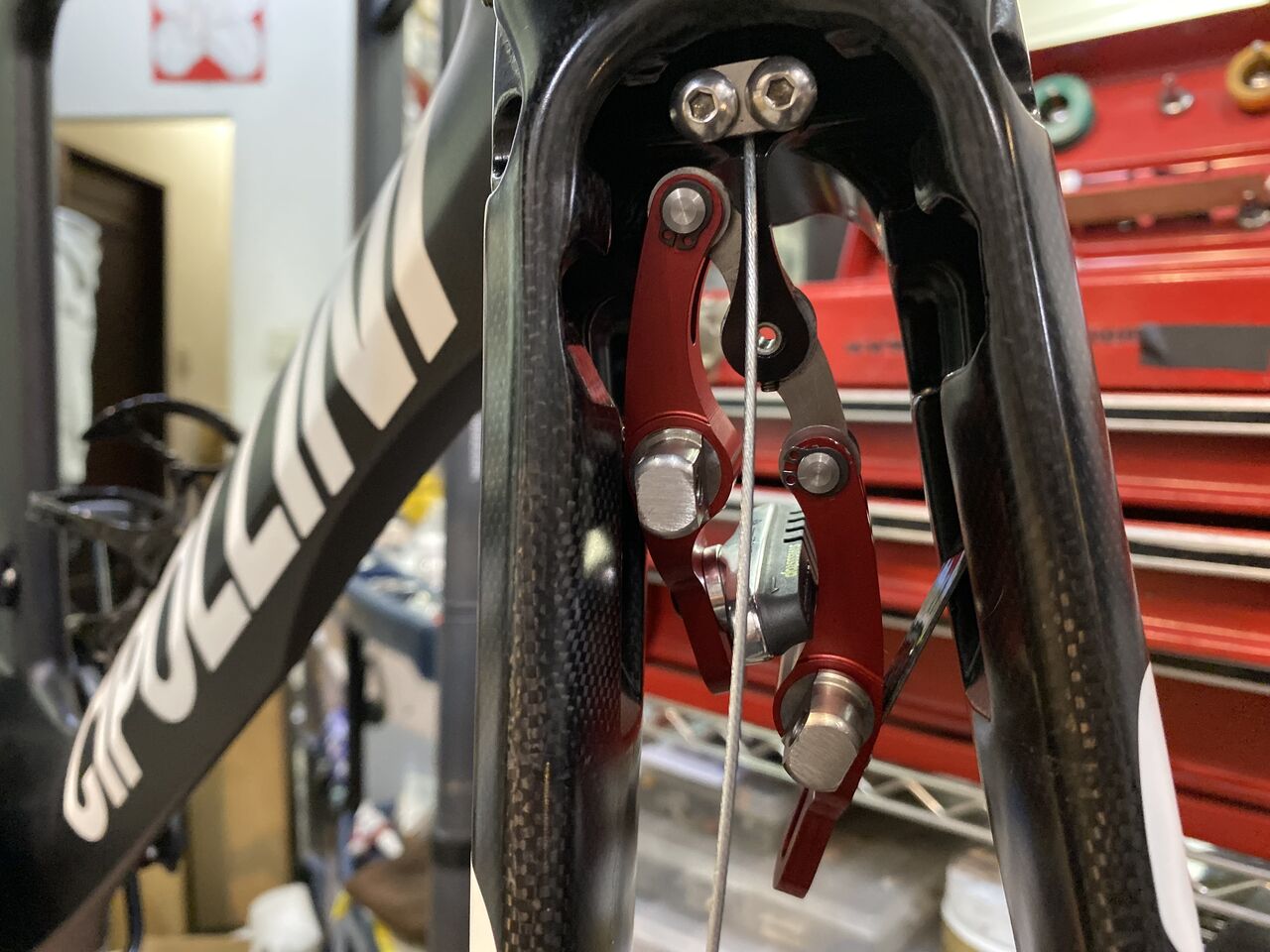 もしかしてリーフスプリングのイモネジアジャスター締め込めば直接フォークに触らなくなるからキコキコ音しなくなったかもね。でももう一度4プライリーフの点検も兼ねたってことで。ああ、何回バラしたことやら。やはりリーフは、耐久性も考慮してカーボンではなく鋼にしてほしかったな。そうそうホイールレスの状態では、カーボンリーフ保護のためにブレーキレバーは半分までしか引いてはダメですぞ!