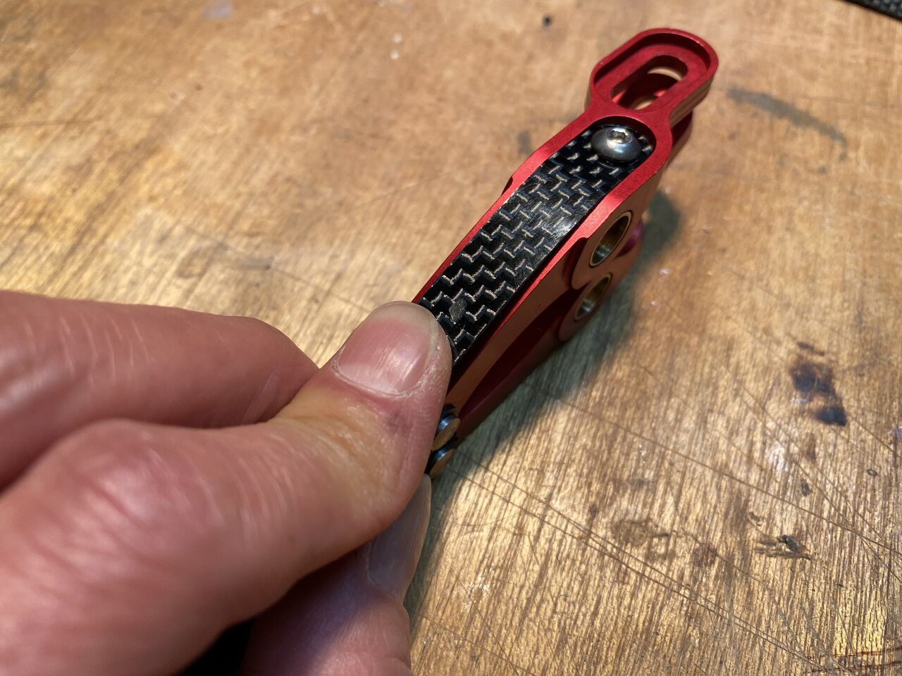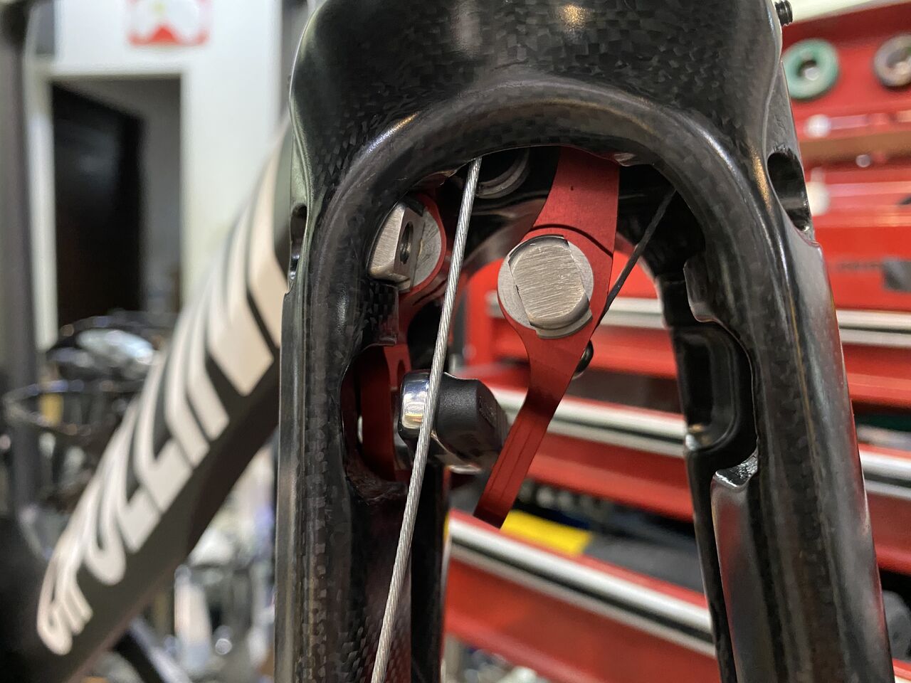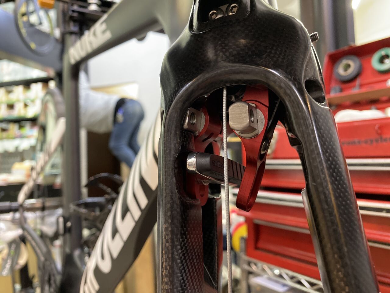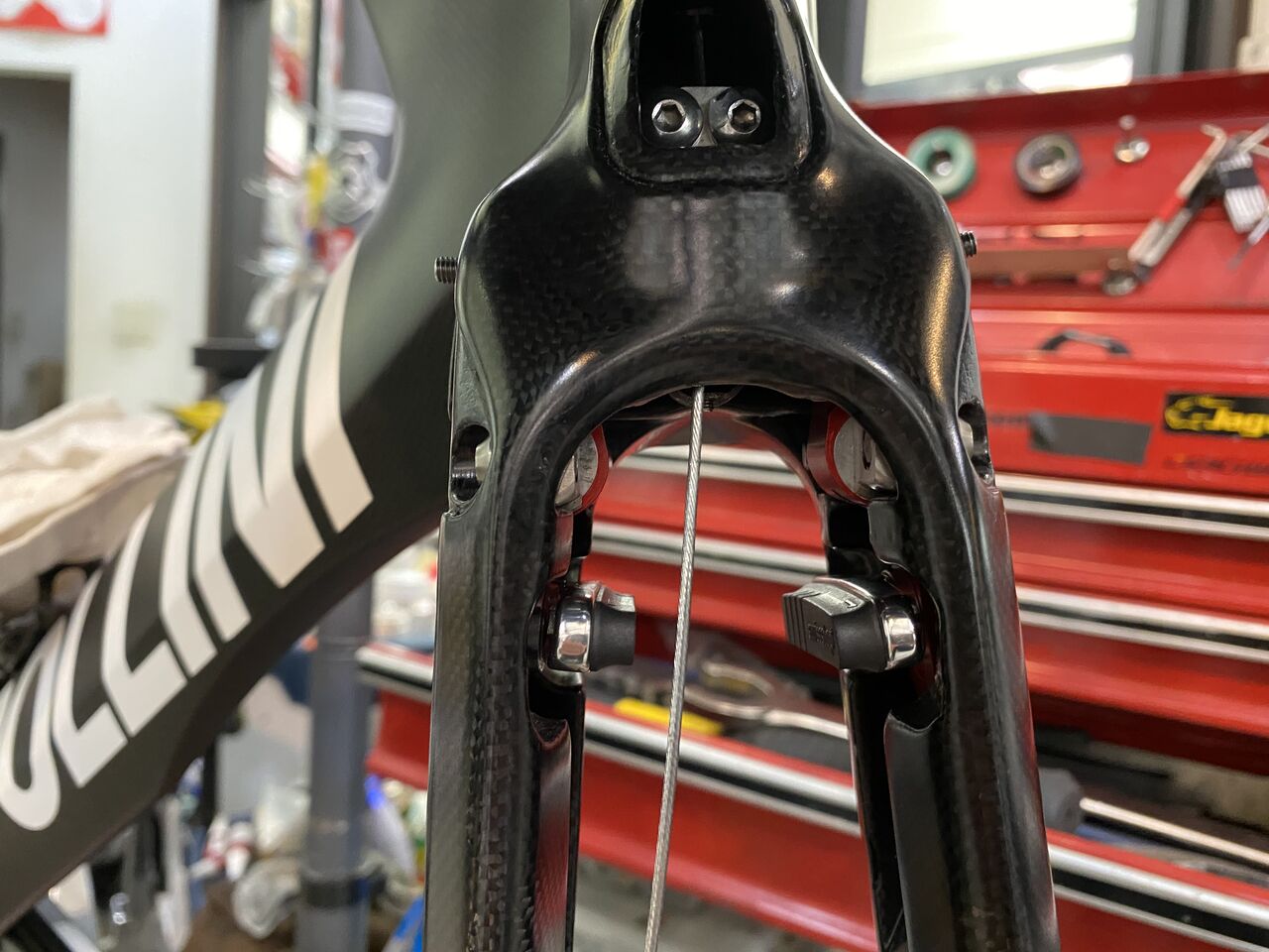 もしかしてリーフスプリングのイモネジアジャスター締め込めば直接フォークに触らなくなるからキコキコ音しなくなったかもね。でももう一度4プライリーフの点検も兼ねたってことで。ああ、何回バラしたことやら。やはりリーフは、耐久性も考慮してカーボンではなく鋼にしてほしかったな。そうそうホイールレスの状態では、カーボンリーフ保護のためにブレーキレバーは半分までしか引いてはダメですぞ!