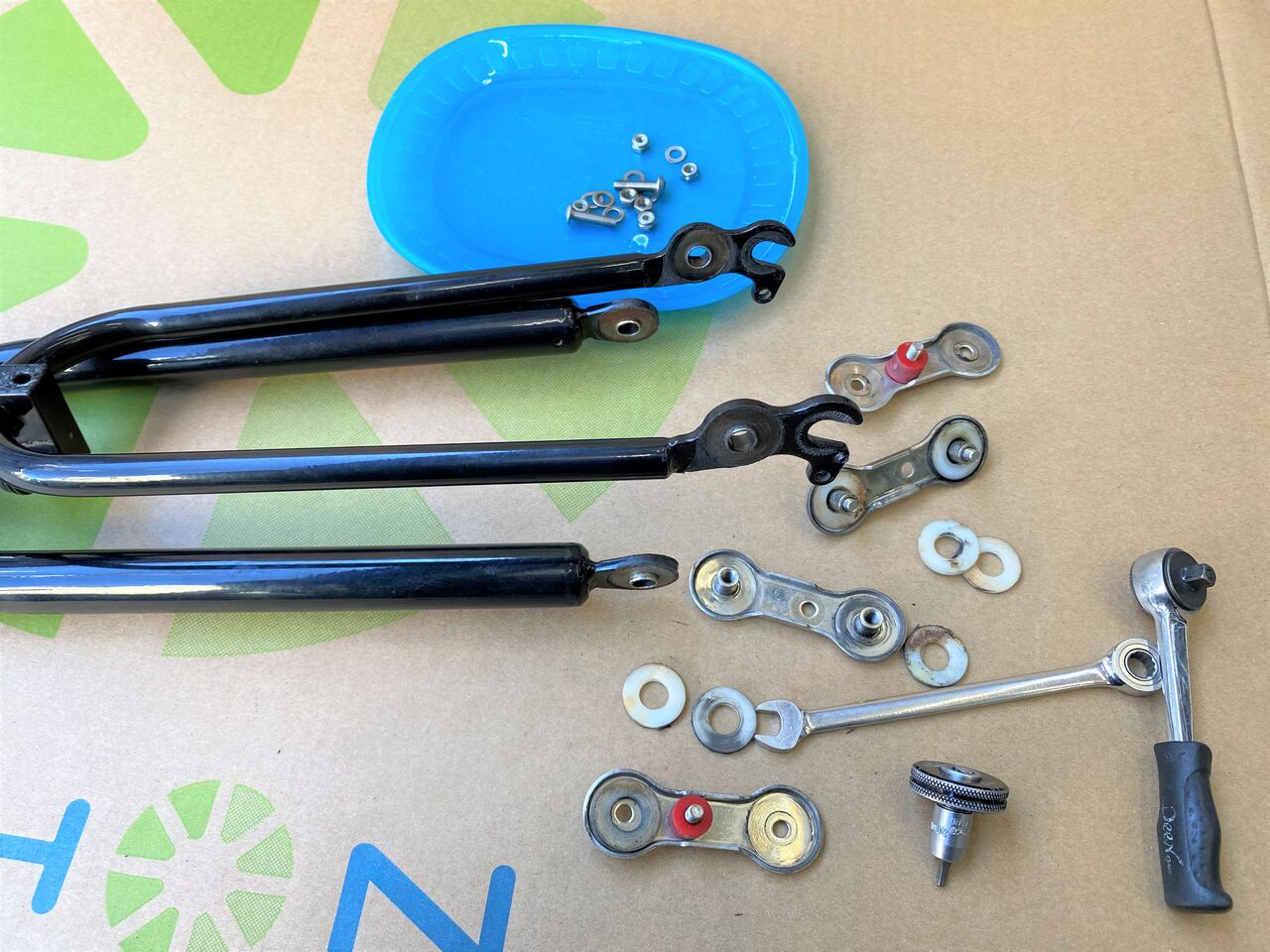 余計なパーツに目が行ったために進行が遅れました。本題のサスペンションフォークの分解に入ります。