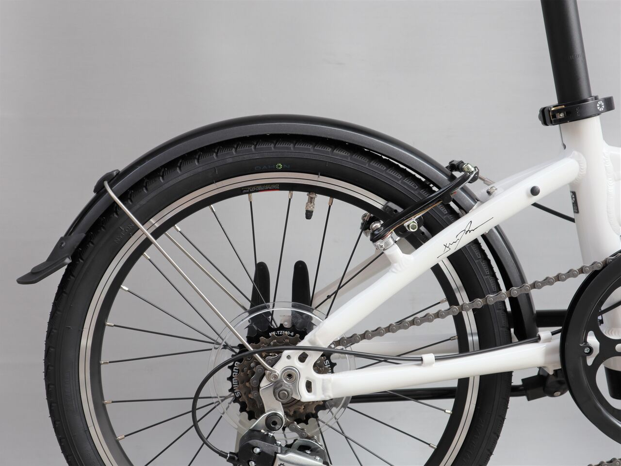 DAHON オリジナルのクランクにはチェーンガード付きの52T 。