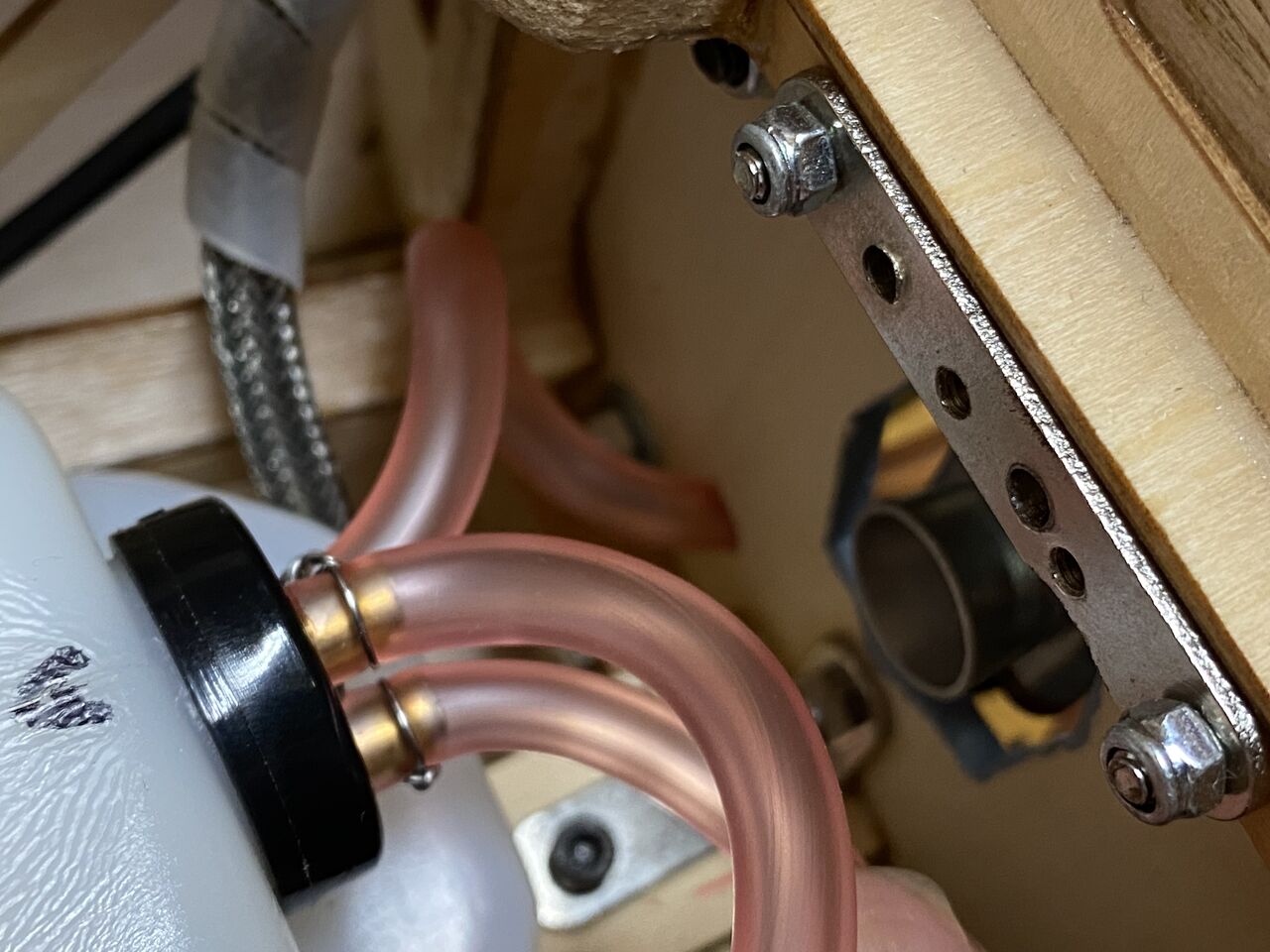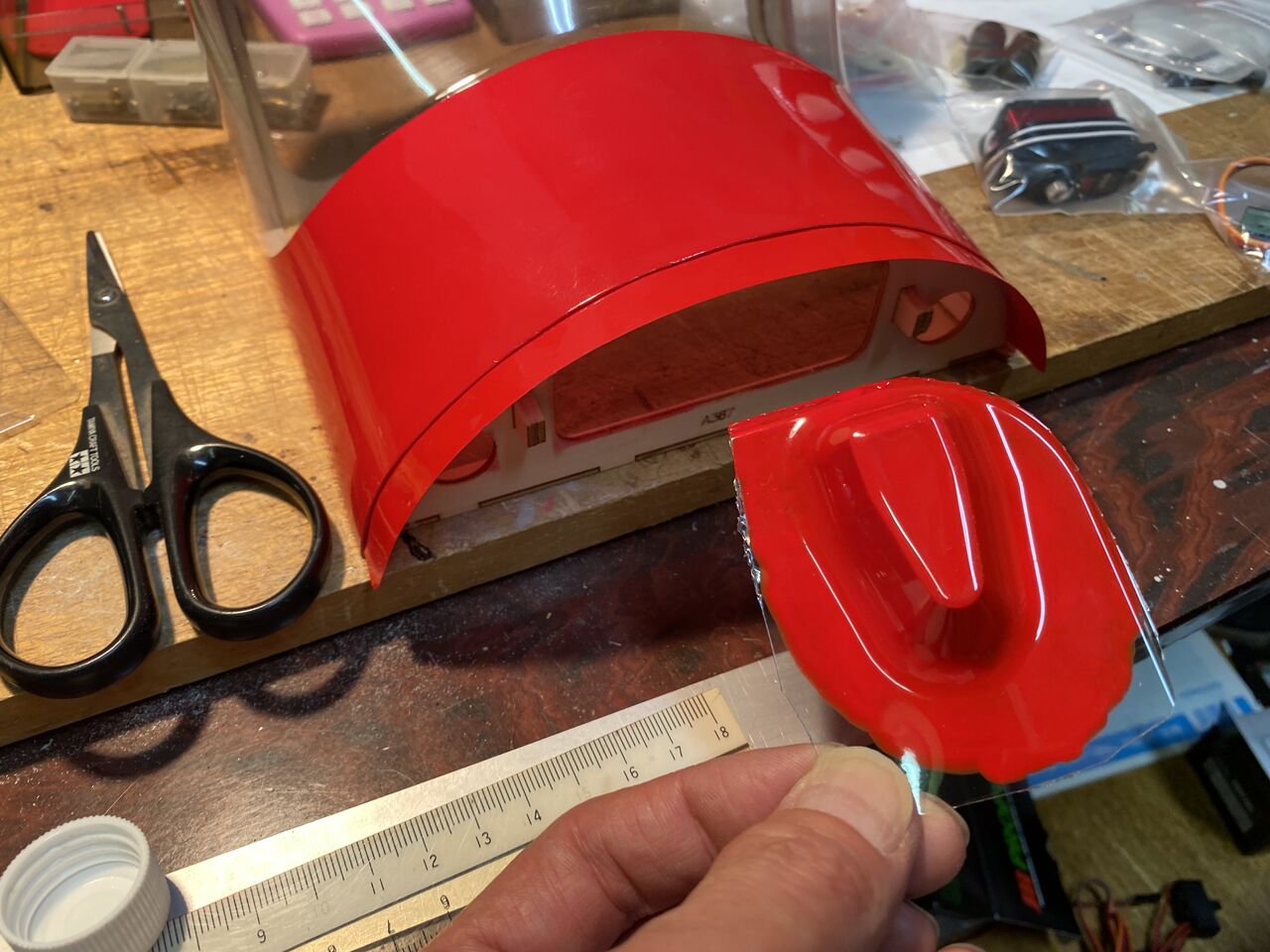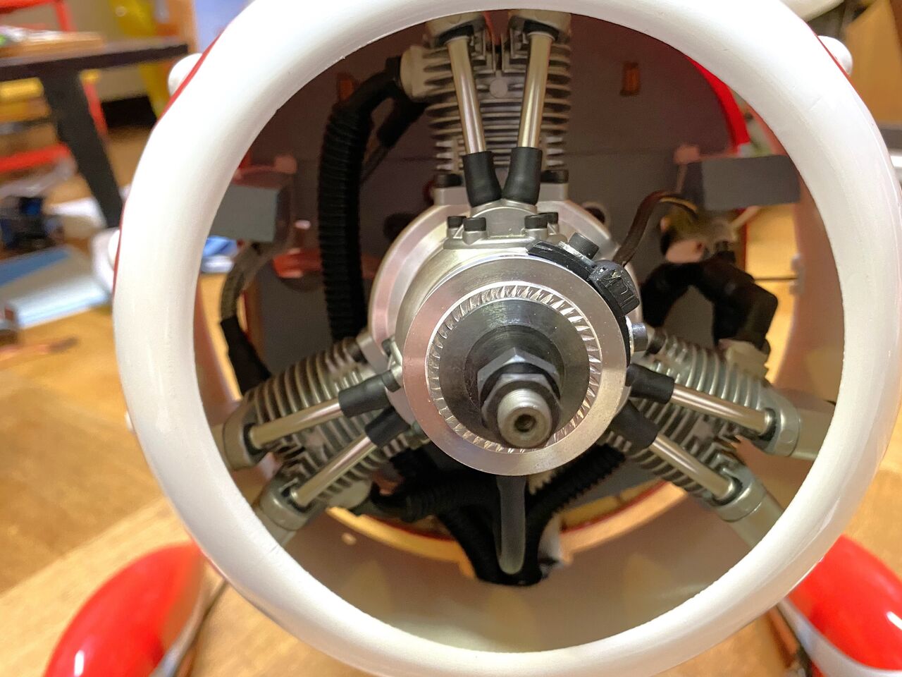 本日は、ちと忙しかったので社長室からお届けする。ここでエンジン回りに RC DEPOT メカニックより指摘を受けた2点を改善すべく努力してみる。一つは、エンジンクーリングのためのエアシュラウドとキャブへのフレッシュエアーを導くエアダクトであります。