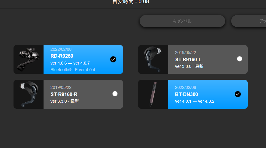 それでも高い機器を購入したんで SM-PCE02 でアップデートしました。シフトスイッチの ST-R9160 R / L は、3.3.0の最新のままで、リヤディレーラーの RD-R9250 が、4.0.6から4.0.7に、バッテリーの ET-DN300 が4.0.1から4.0.2にアップデートされました。