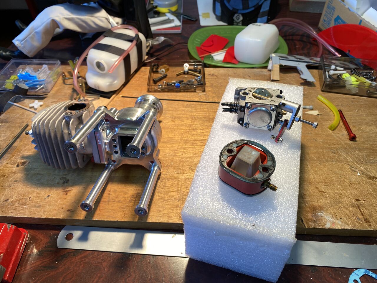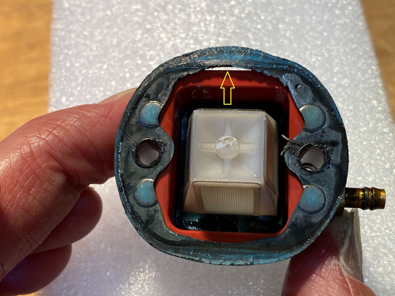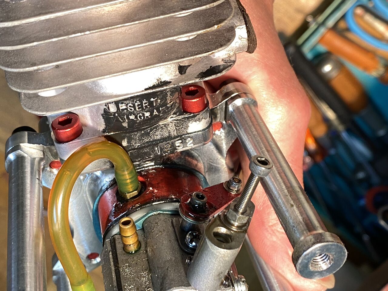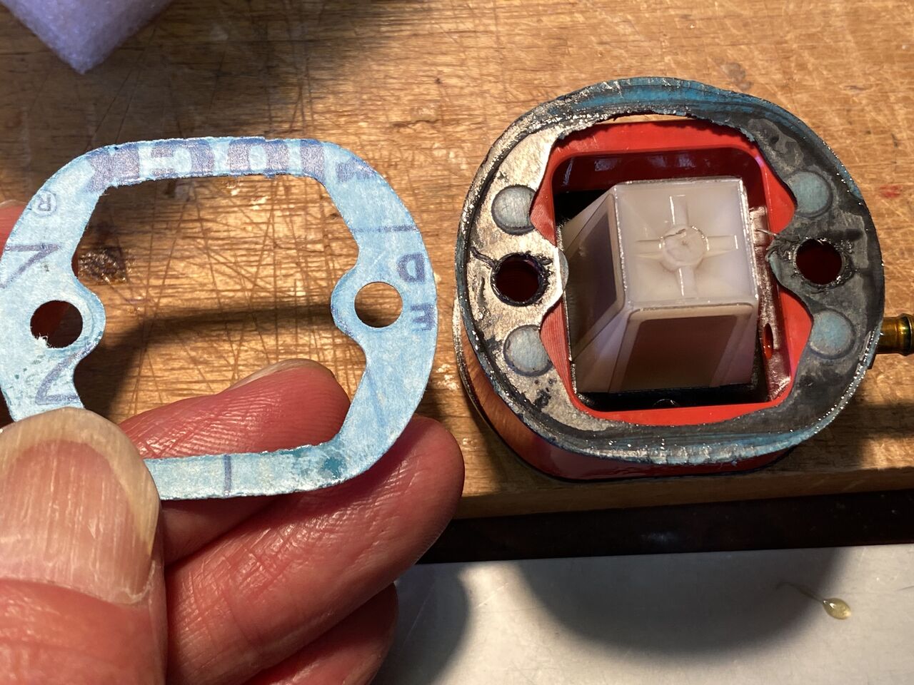 二日目、プラグは勢いよくスパークしているが今度はガスが来ない。完全にチョークバルブを閉じてクランキングしてもキャブの吸入口が乾いたままだ。これまた工作室で調べるとリードブロックパッキンの不良でここから多くのエアーを吸っていたみたい。リードブロック、キャブレター両方のパッキンを新品に交換した。
