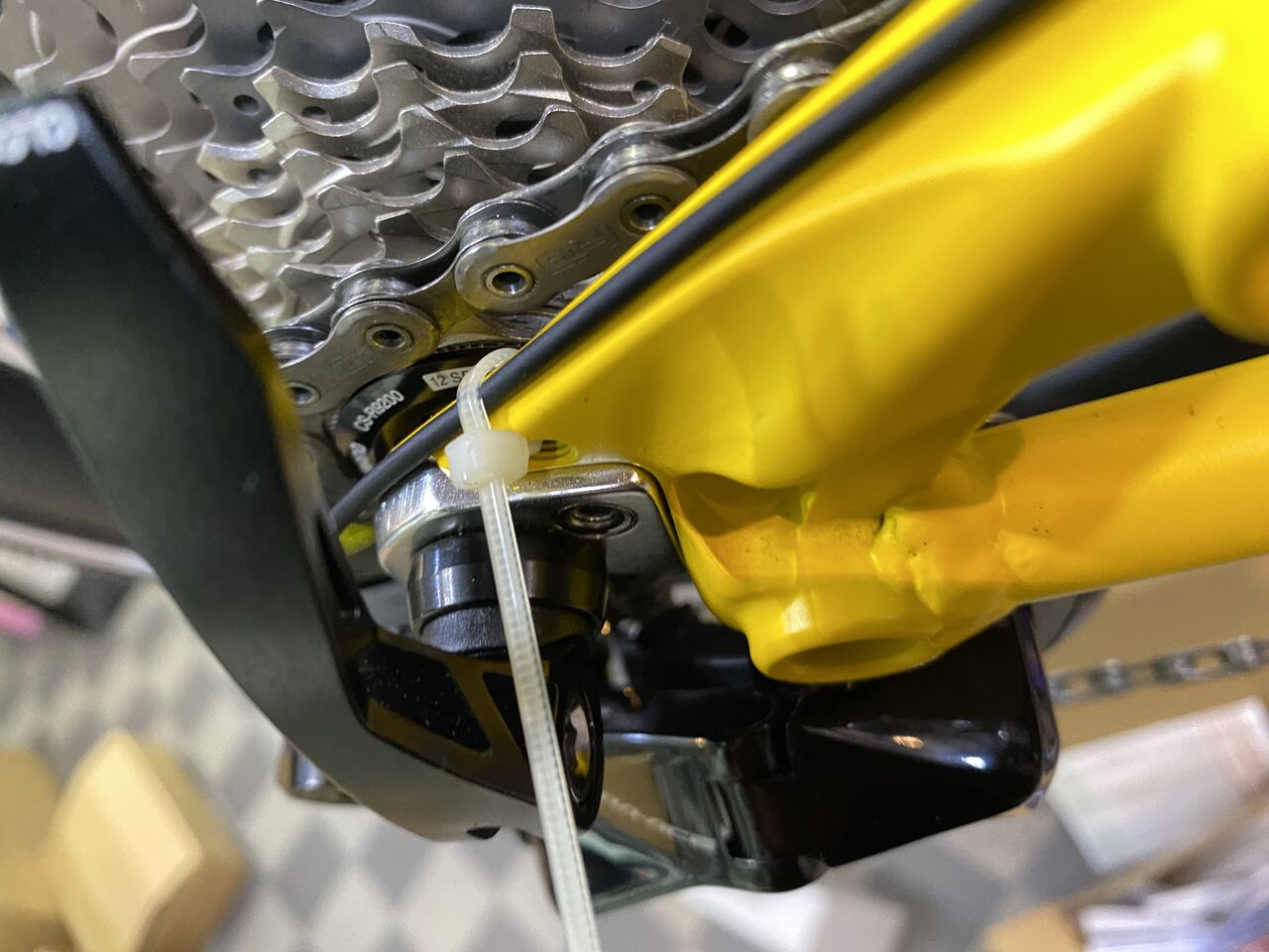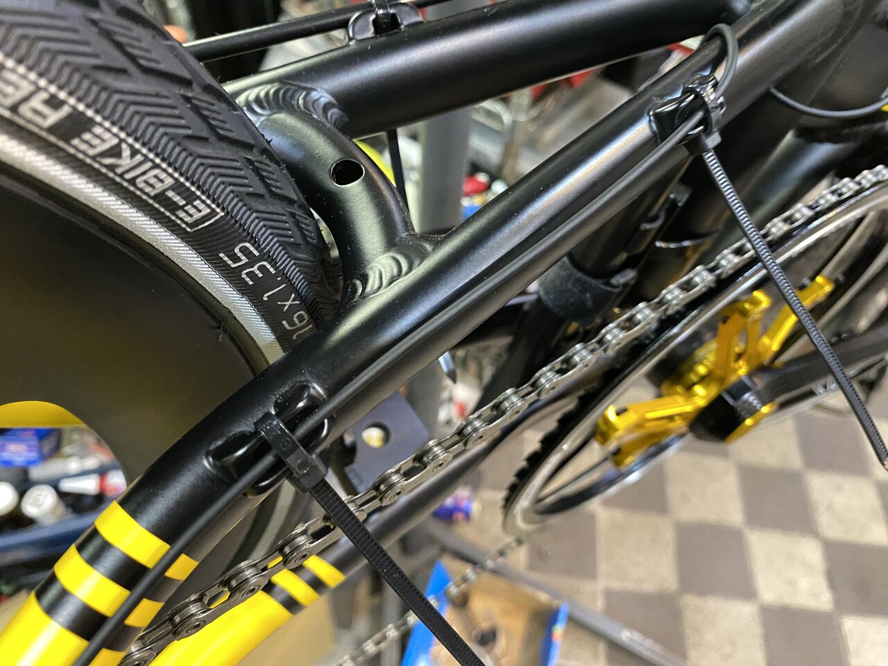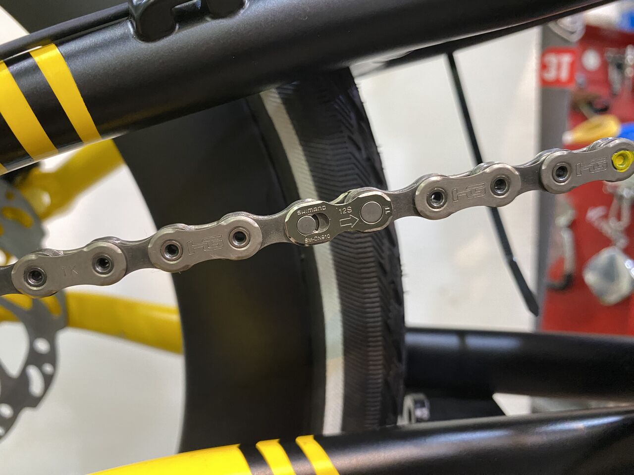 12速トップです。小径車のためケージには、一コマカットでも十分なチェーンテンションが掛かっていましたが、地面とのよりクリアランス確保で二コマカットにしました。