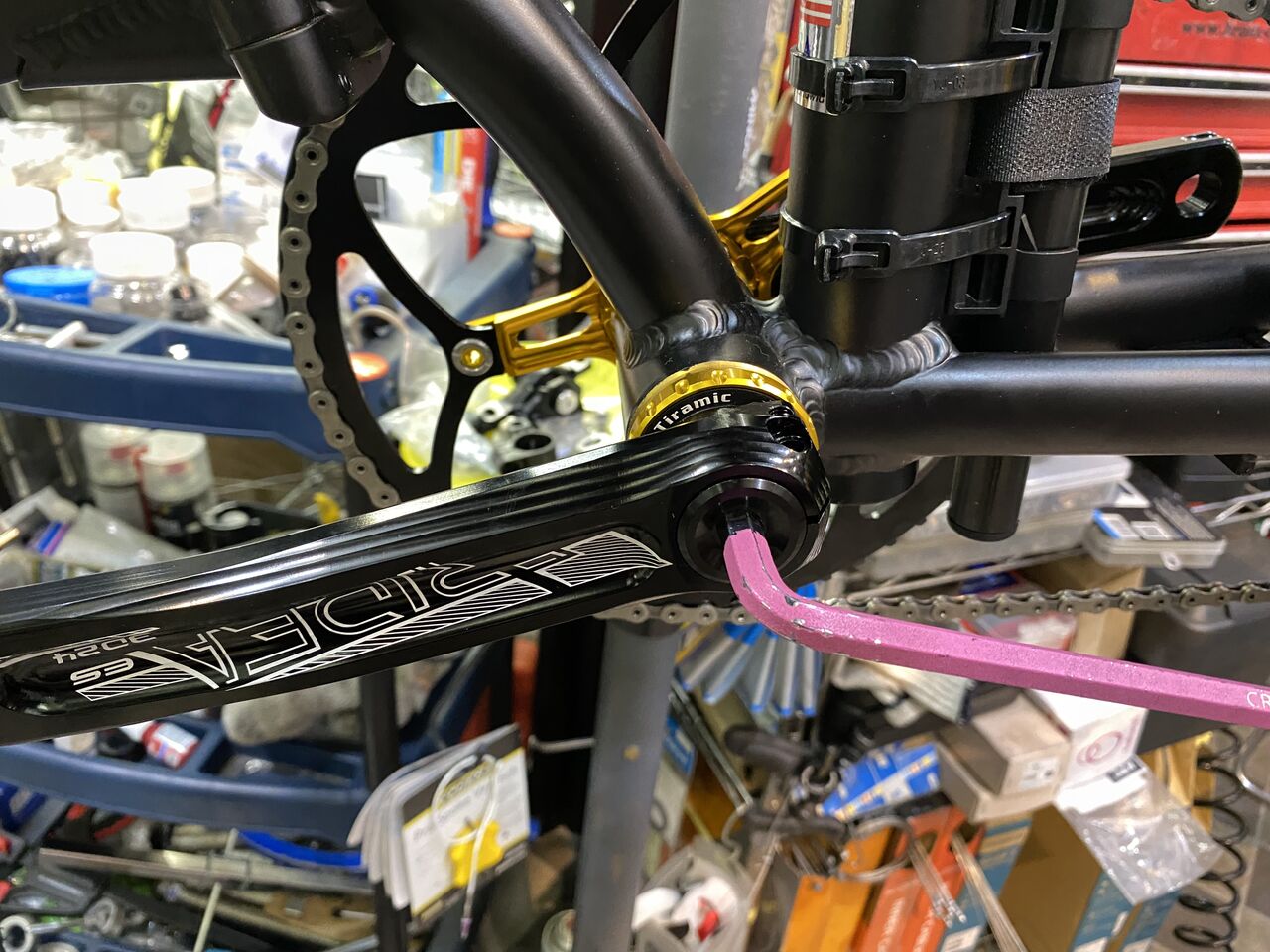 トップ、ロー庁側でクランク逆回転させても問題ありませんでした。チェーンラインも決まったのでクランク本締めです。