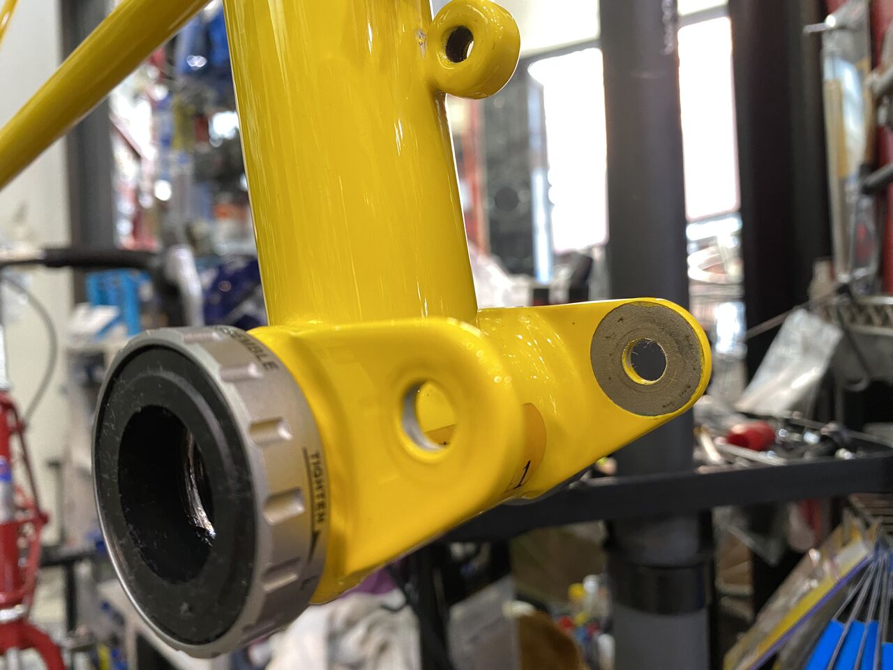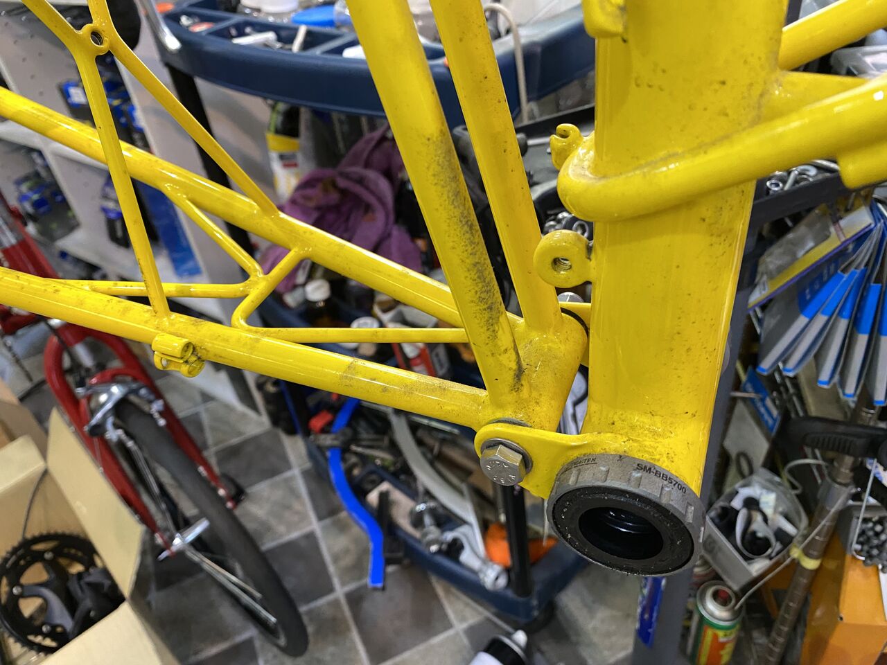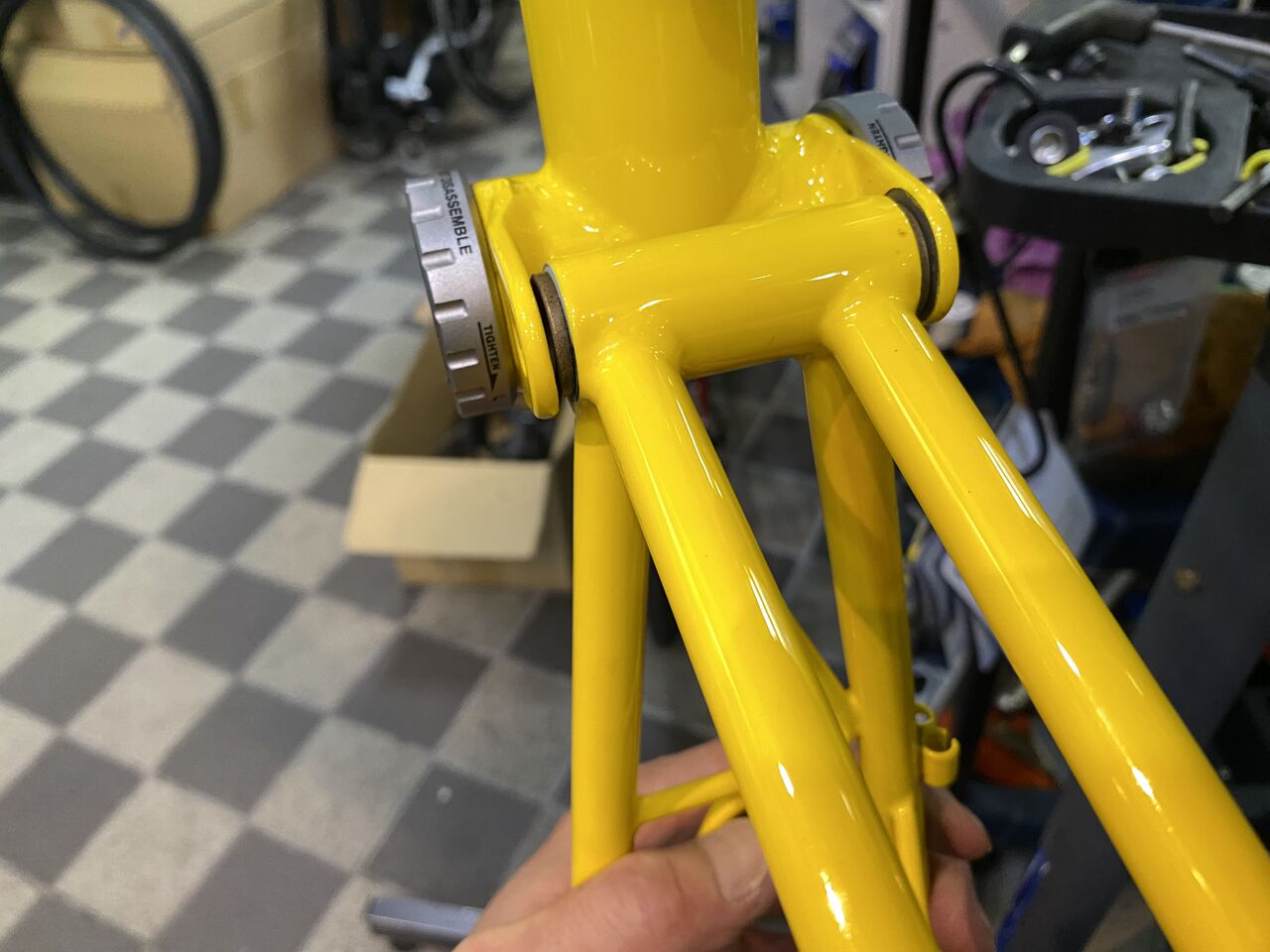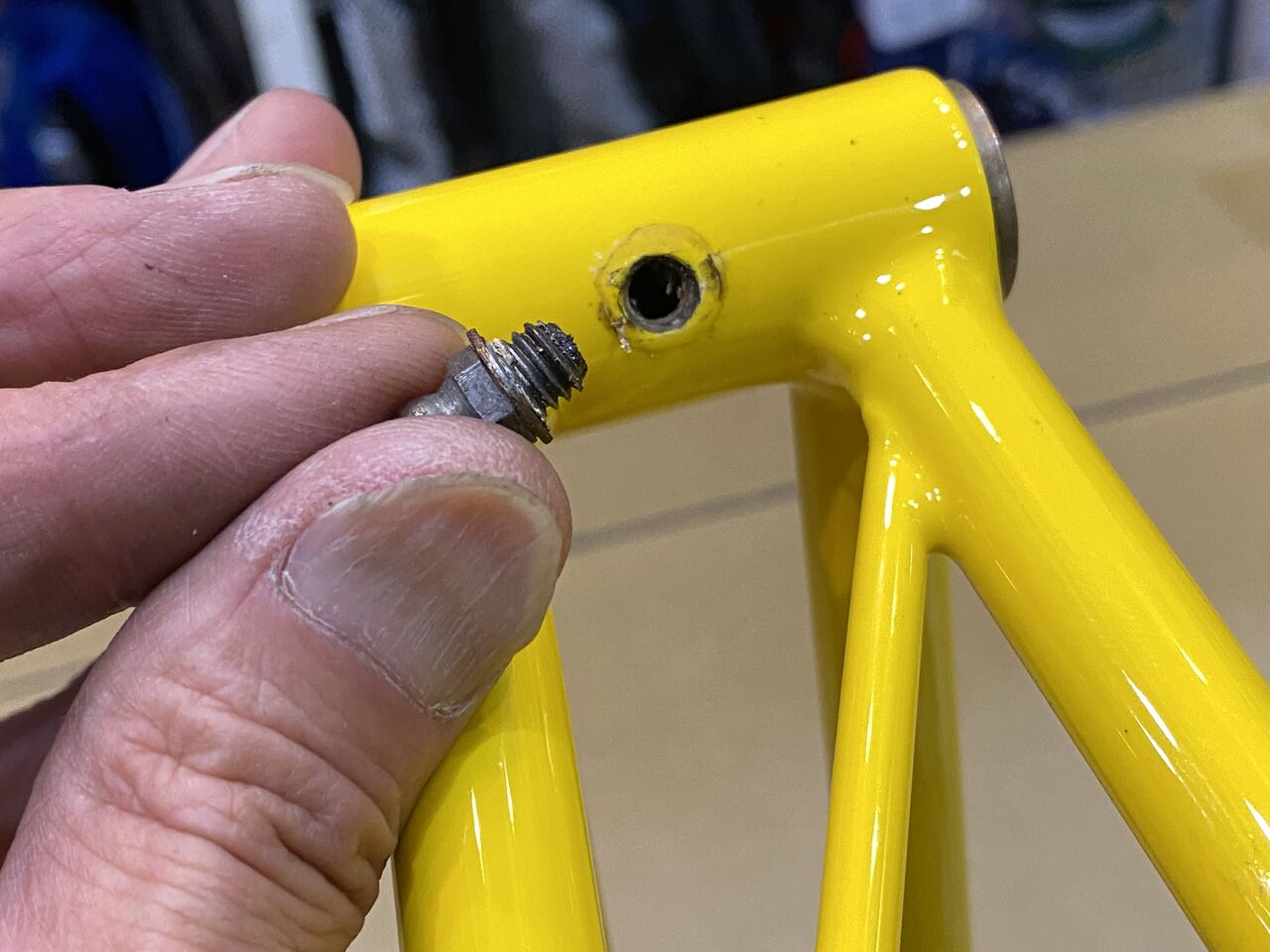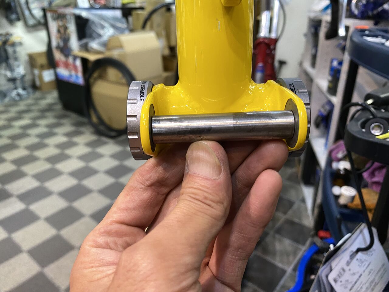 ニップルを締めこんでスピンドルに O の刻印が出来ちゃってますよ。これでは、スピンドルとリヤアームが一体化してスピンドルが回りません。