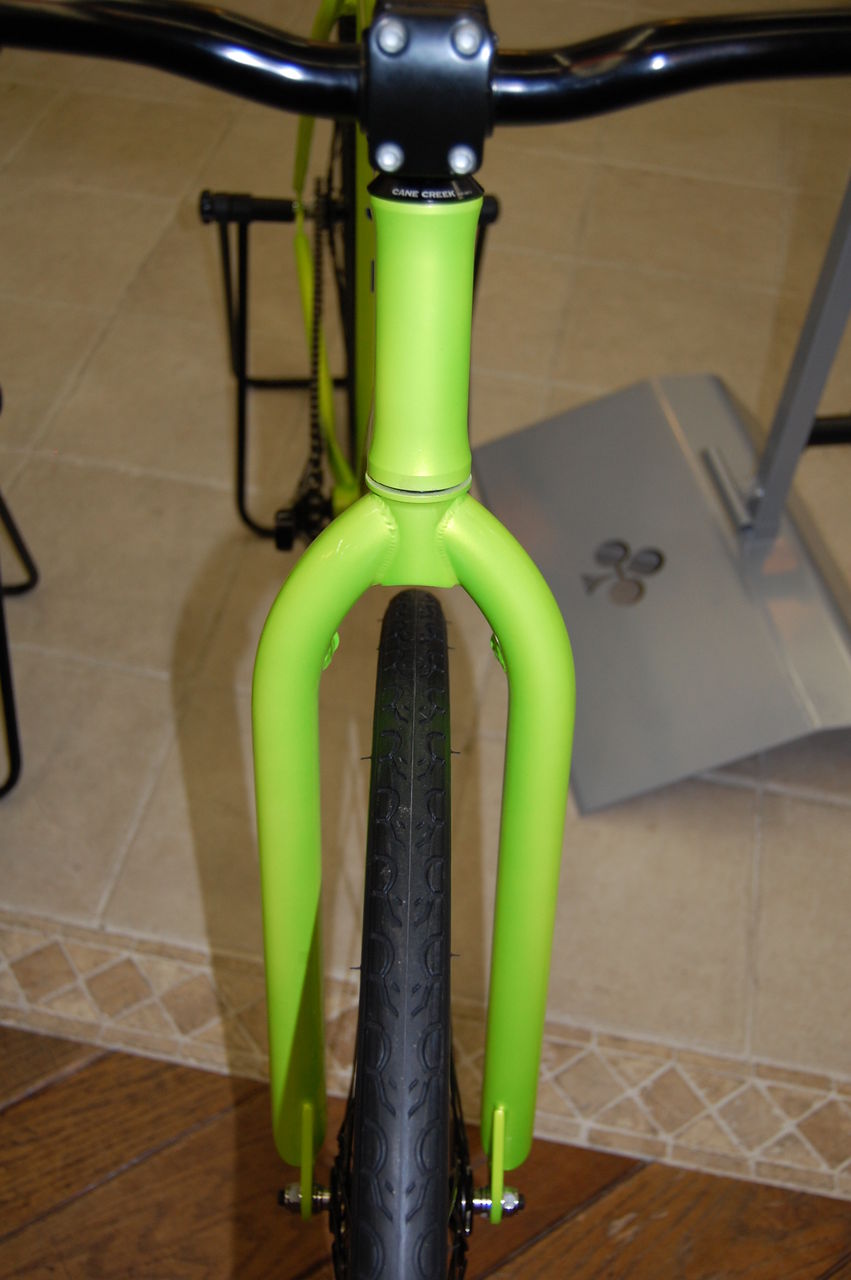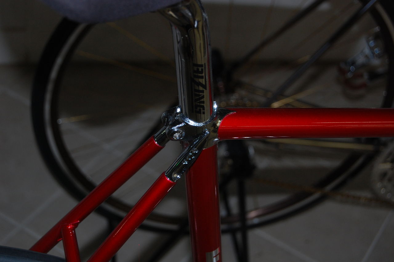 トップチューブ31.8mmダウンチューブ35mmの高強度クロモリフレームにストレートフォーク、ステアリングヘットとBBはインテグラルを採用。