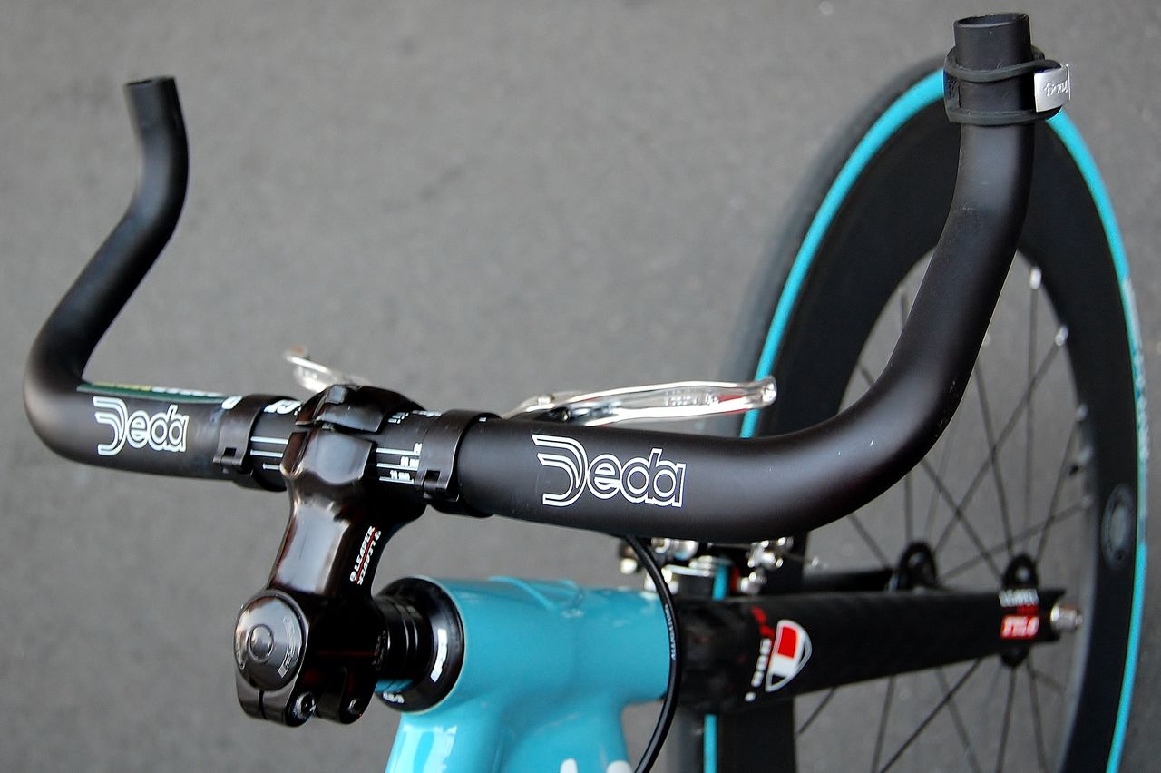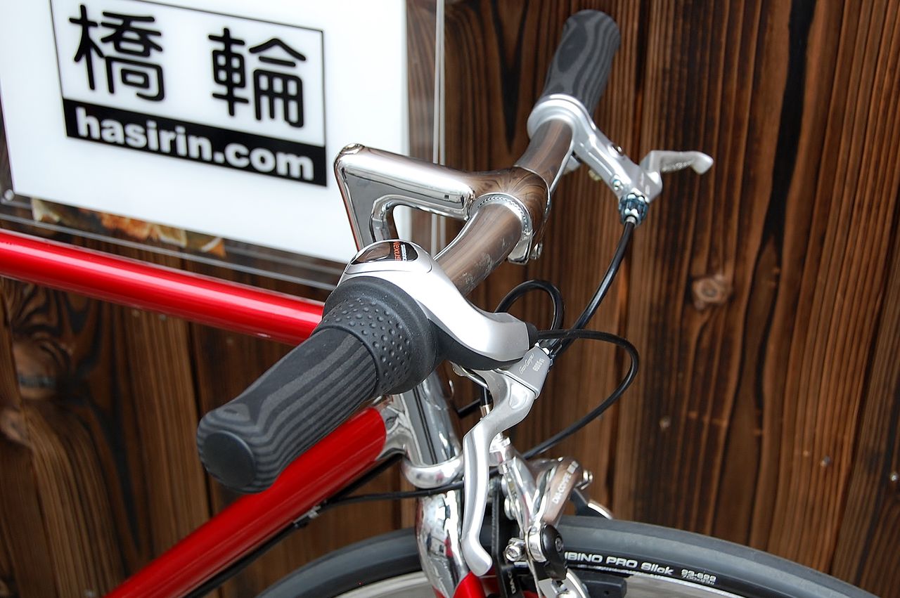 ハンドルはオリジナルのドロップバーから短めのフラットバーに変更。
