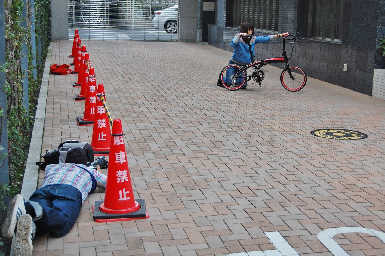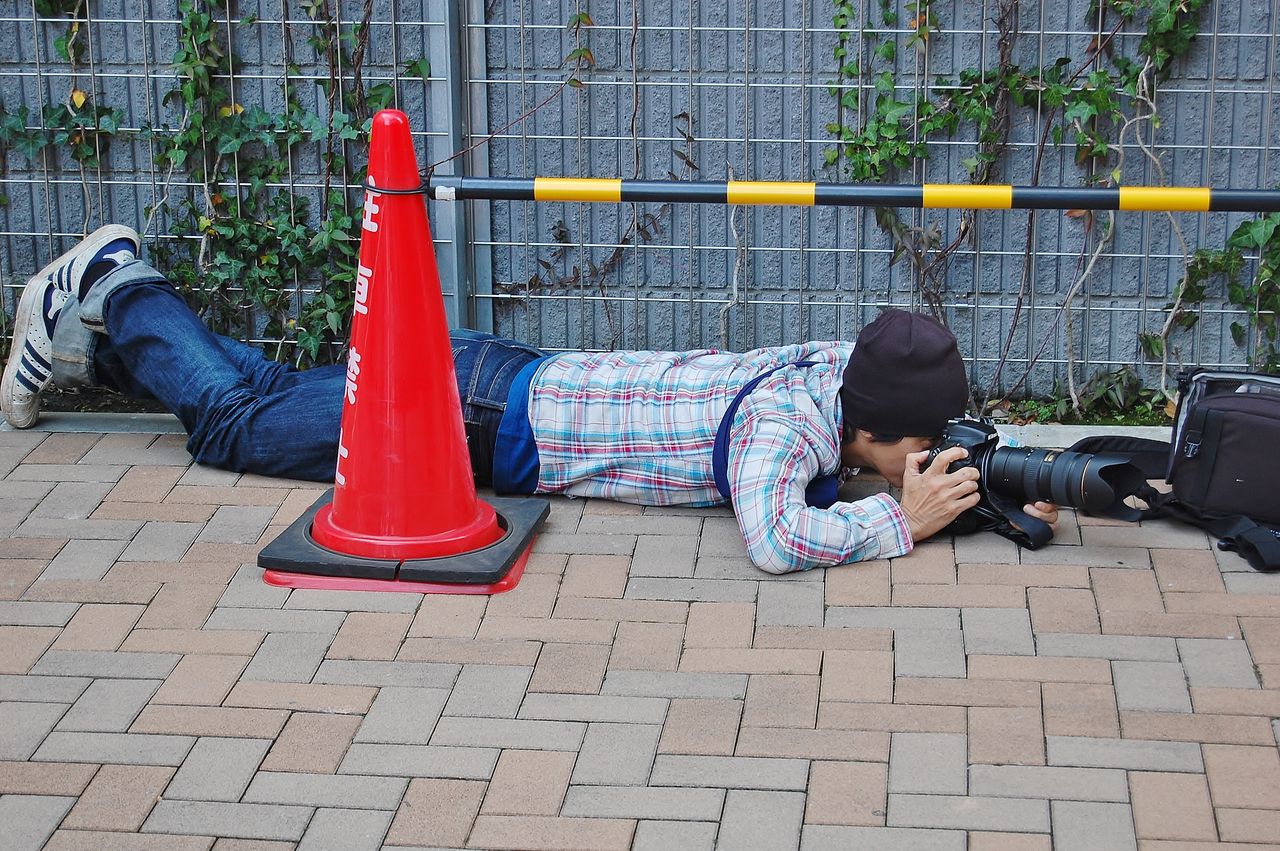 超ローアングルで構えるカメラマン。カメラを持っていなければ、朝まで飲んでた人みたい。