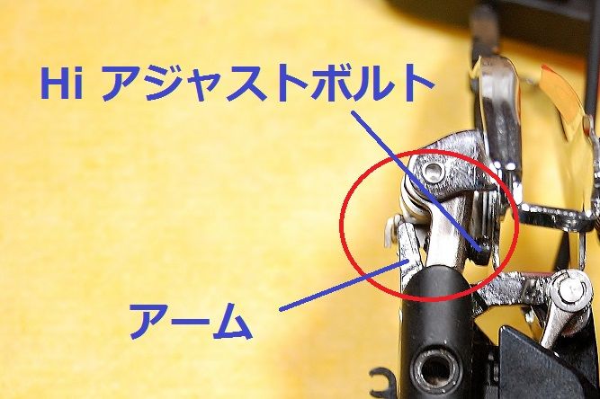 今、ロー側にシフトしてあります。ハイ側を横から見てみると、Hi アジャストボルトの先端とアームは離れています。
