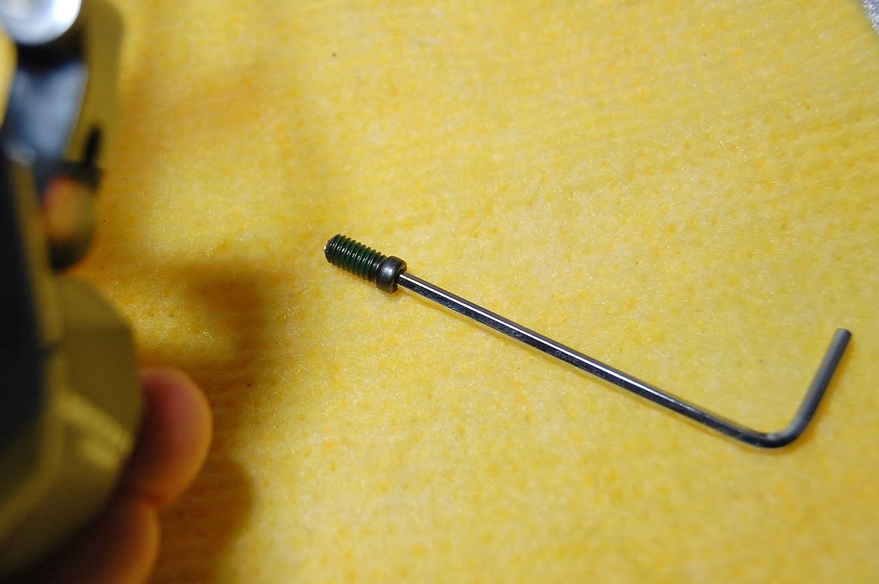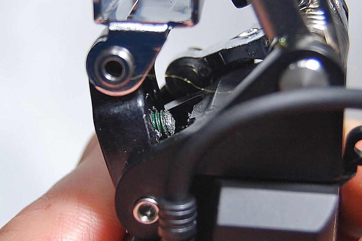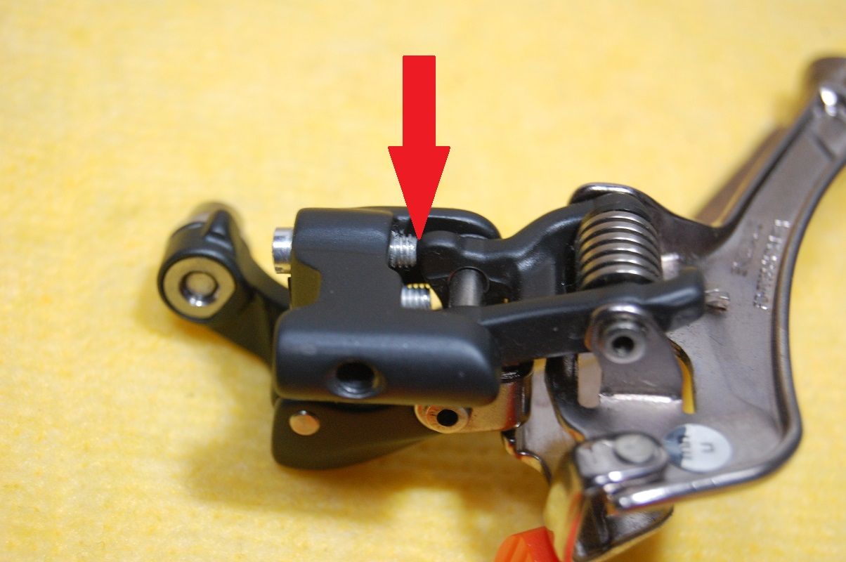 Lo アジャストボルトをいじくり回し過ぎたのか、ボルト先端はボディーを削り切粉が出ている。リターンスプリングが強いのか、マイクロシフトの フロントディレーラーのように、ボルトを締める際は、浮かせてあげた方が良さそうだ。