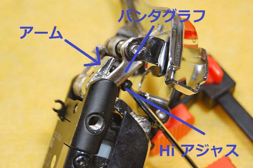ここから更に、Hi アジャストスクリューを緩めて行くと、パンタグラフは、アームに接触するまで内側に寄ります。