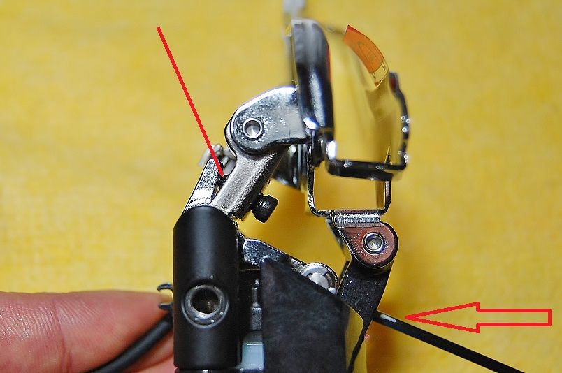 今、アウターギヤにシフトされた状態。矢印のLo アジャストボルトは、通常の位置まで締めこんであります。赤線のHi アジャストボルト先端とアームは、密着していますね。